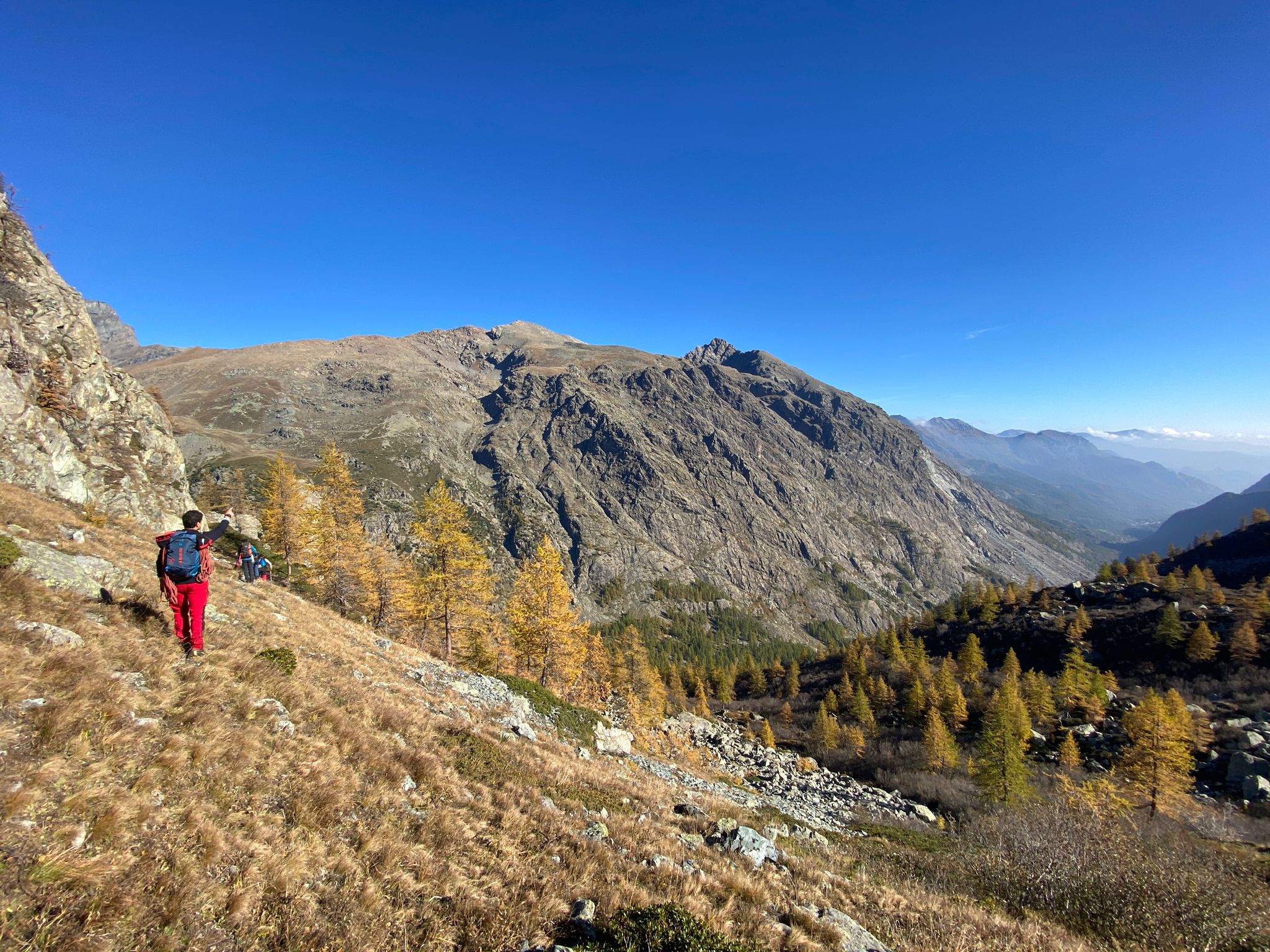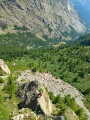 - L7 – salire la cresta per una trentina di m. 3a, uscire a sx, prendere il sentierino che porta al Colletto (5 min.) e quindi verso Pian della Mussa.