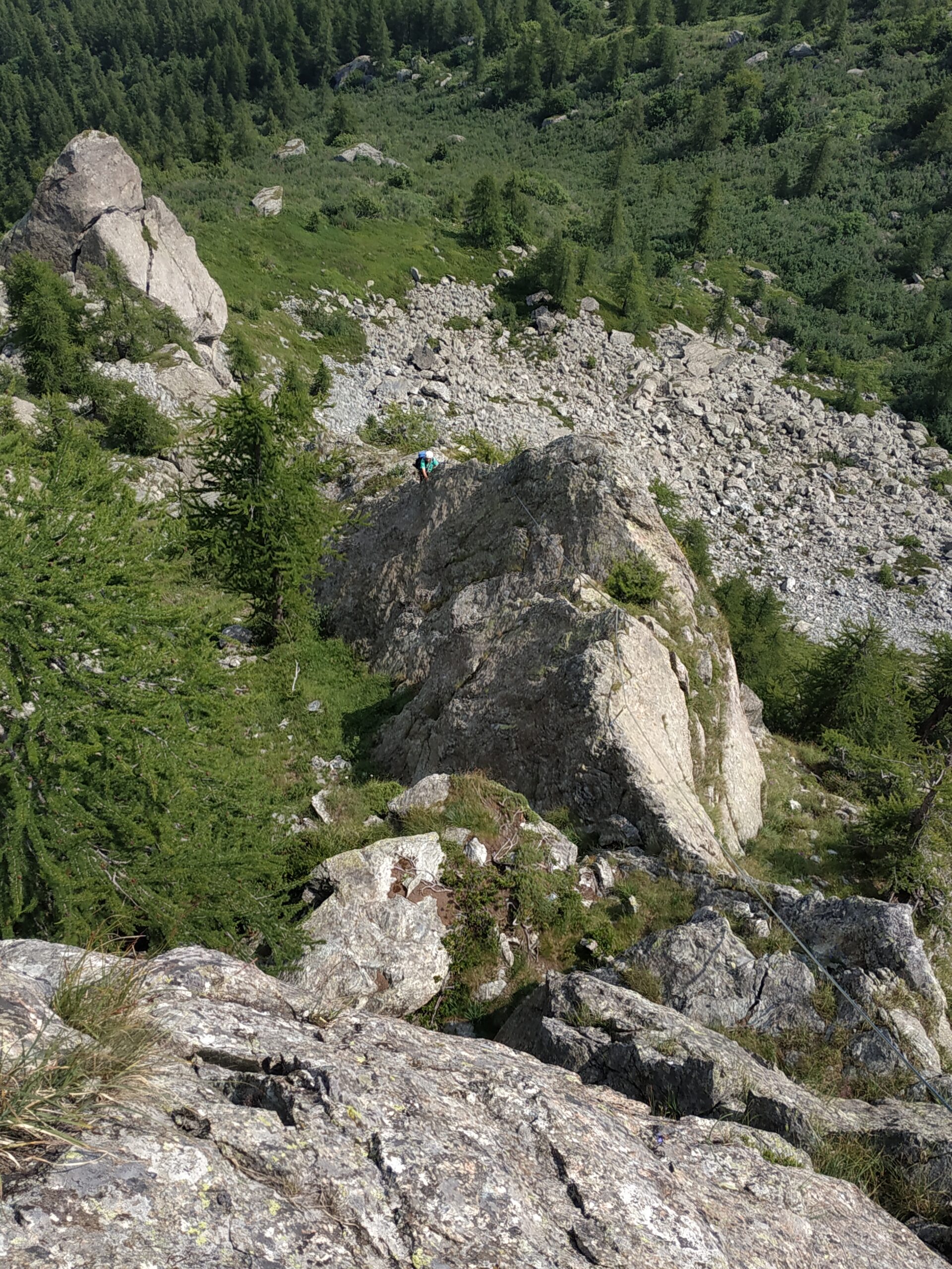 Nonostante la fitta vegetazione di questo periodo il sentiero di accesso rimane evidente fino all’attacco. La via ci è piaciuta e i gradi sono onesti, il materiale risulta in ordine e i chiodi ben fissi. Ottimo panorama dalla cima di Rocca Tovo.