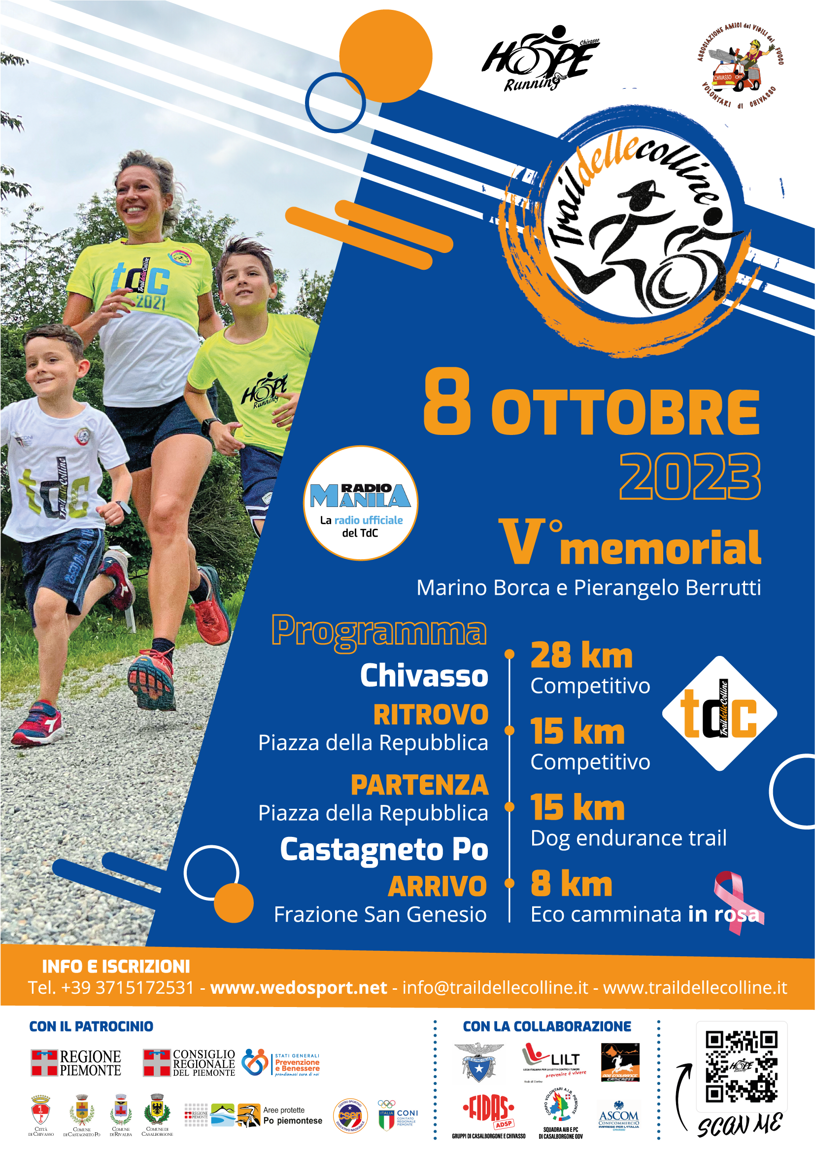 Trail delle Colline 2023! Come sempre è stata un bellissima festa di sport sui sentieri delle colline chivassesi. Oltre 1.100 i partecipanti suddivisi tra le due corse competitive da 28 e 15 km e la ecocamminata da 8 km. Tantissimi gli amici presenti in una giornata ancora estiva. Impatto ambientale zero con avvicinamento in bici come usuale per le competizioni vicino a casa. Quest’anno mi sono limitato alla gara di 15 km con 800 m di dislivello chiusa al 56mo posto in 1h54’34”. Speravo meglio ma, viste le condizioni fisiche e soprattutto morali, poteva andare peggio. Sentieri asciutti e molto ben segnati. Ottimo il lavoro degli organizzatori.