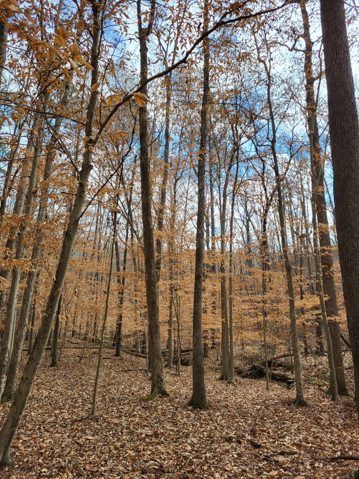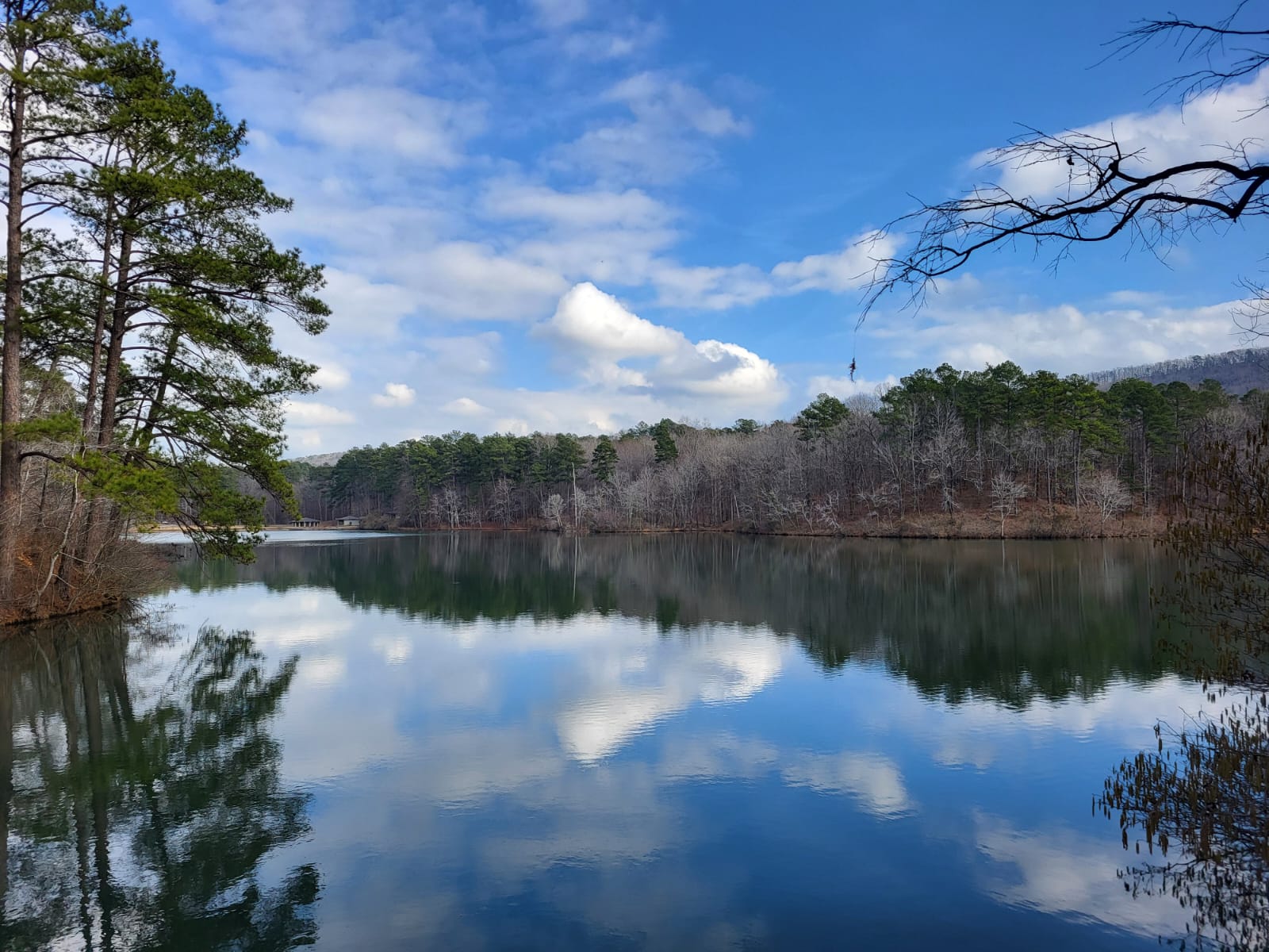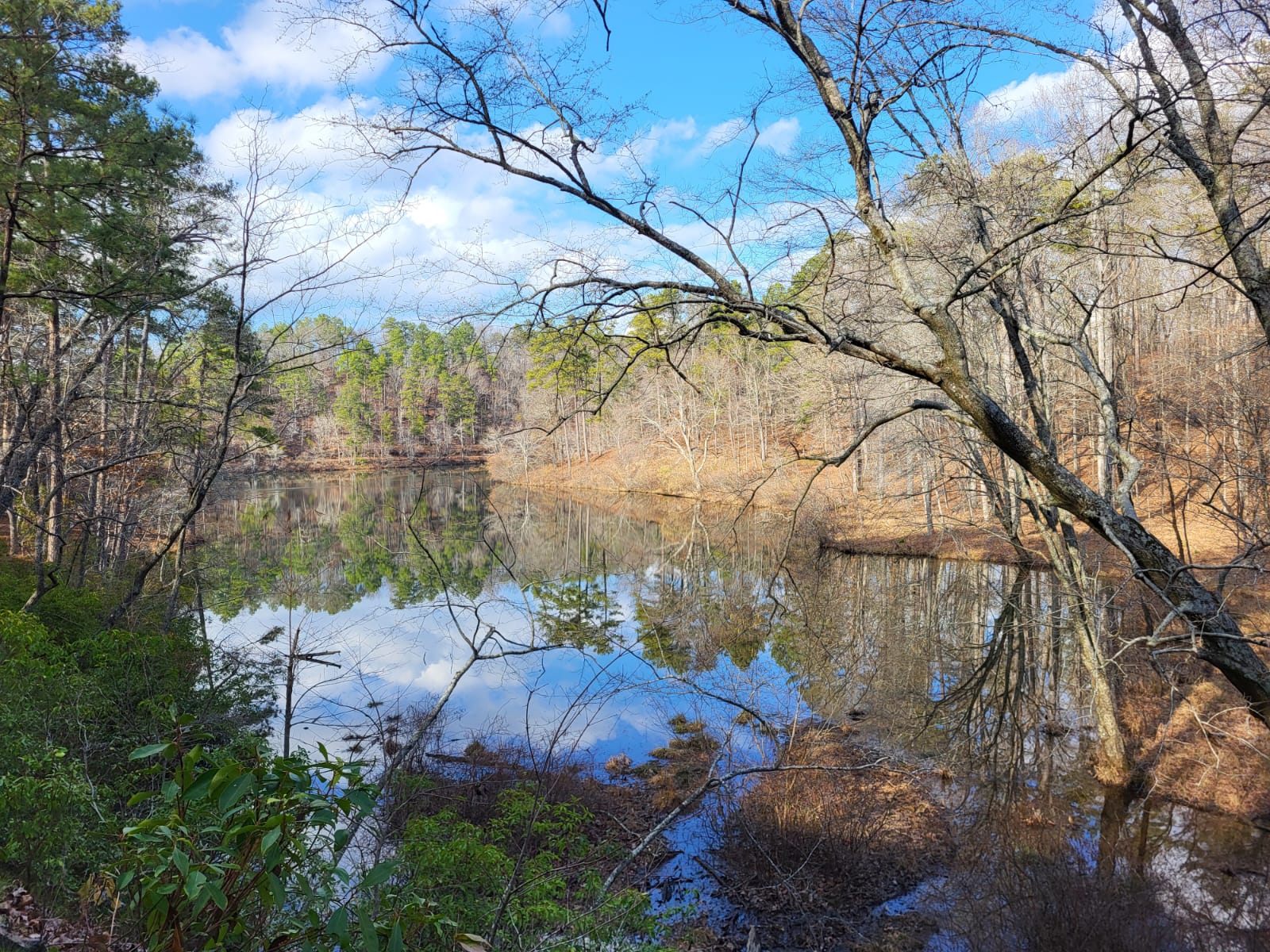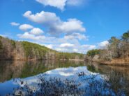 Si piega a destra e si giunge alla Group Camp Road, che si prende a destra. Si ignora nuovamente la deviazione per il sentiero giallo e si prosegue fino ad arrivare in vista del lago Double Oak Lake e della strada asfaltata. Qui, tre curve prima di toccare la strada asfaltata, si procede brevemente fuori sentiero per recuperare il sentiero equestre, che si prende a destra scendendo nei pressi di un ruscelletto. Dal sentiero equestre ci si sposta sul sentiero giallo, che si prende sulla sinistra.