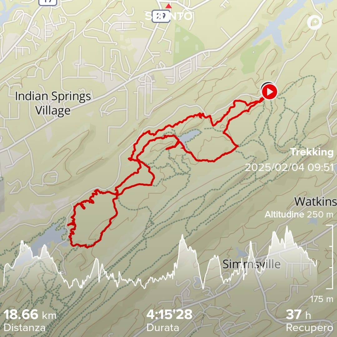 Il sentiero rosso si snoda dapprima in parallelo a quello bianco. Successivamente, quello bianco piega a sinistra mentre quello rosso continua parallelamente alla strada asfaltata. Il sentiero rosso attraversa quindi la strada asfaltata presso Cabin Rd e giunge infine al Pump Track, dove i ciclisti possono effettuare evoluzioni con le biciclette. Si attraversa nuovamente la strada asfaltata e si ignora la deviazione per il sentiero giallo, che si imbocchera’ al ritorno.