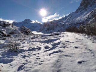 10 cm massimo di neve farinosa, si può salire anche senza ciaspole che sono utili dai 2000-2100 in su perché sotto la neve ci sono parecchie lastre di ghiaccio.