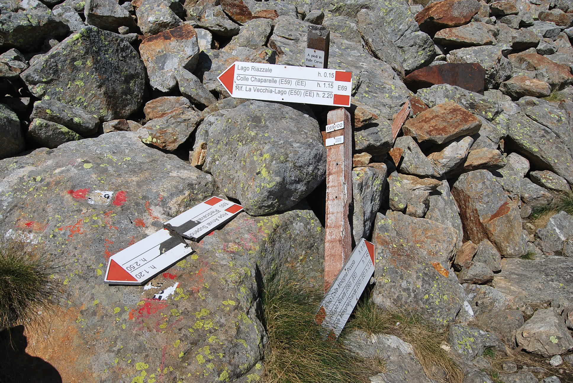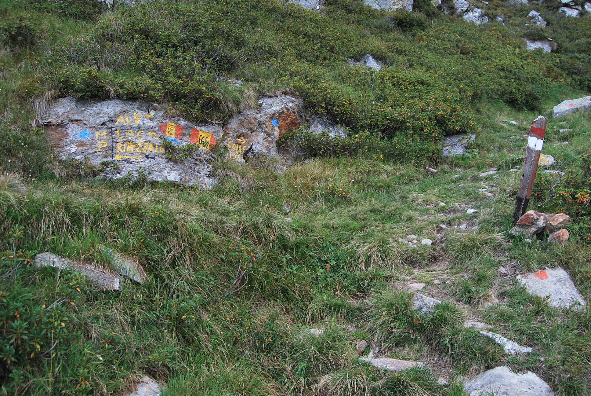Al colle ho seguito le tacche bianche/rosse pensando portassero a qualche Alta Via che proseguiva verso il Colle della Mologna Piccola, ma si sono fermate in cima alla Punta Serange. Sono allora sceso di quota alla ricerca di quel sentiero 69a, arrivando ad un bivio, forse quello giusto, ma con tre targhette senza indicazioni e nessuna traccia di sentiero. Visto che il terreno e i costoni da attraversare lasciavano poche speranze sono ancora sceso, fino all’alpeggio della Mologna inferiore, dove ho ritrovato il sentiero che, scavalcando un costone al Passo delle Capre, porta sull’E65 e poi al colle. Proprio sotto il colle si trova comunque una deviazione per il Rifugio della Vecchia, che dovrebbe essere parte dell’AVAB.