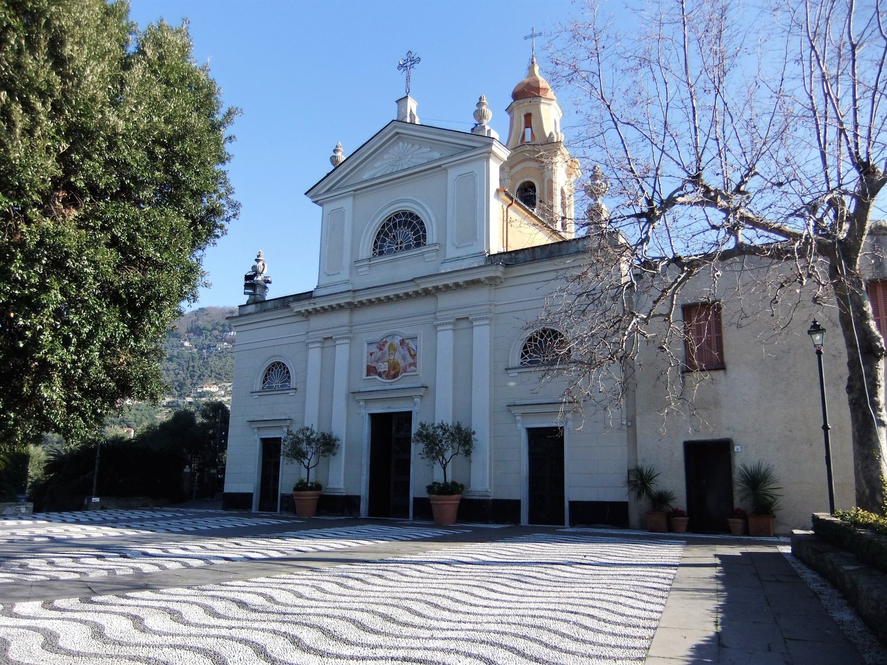 A destra della chiesa si diparte il sentiero ” rombo rosso ” che in piano arriva alla Casa del pellegrino e dopo un po ad un incrocio ( 630 m.), dove si incontra un’ altro sentiero che sale da Rapallo, fattibile in alternativa.