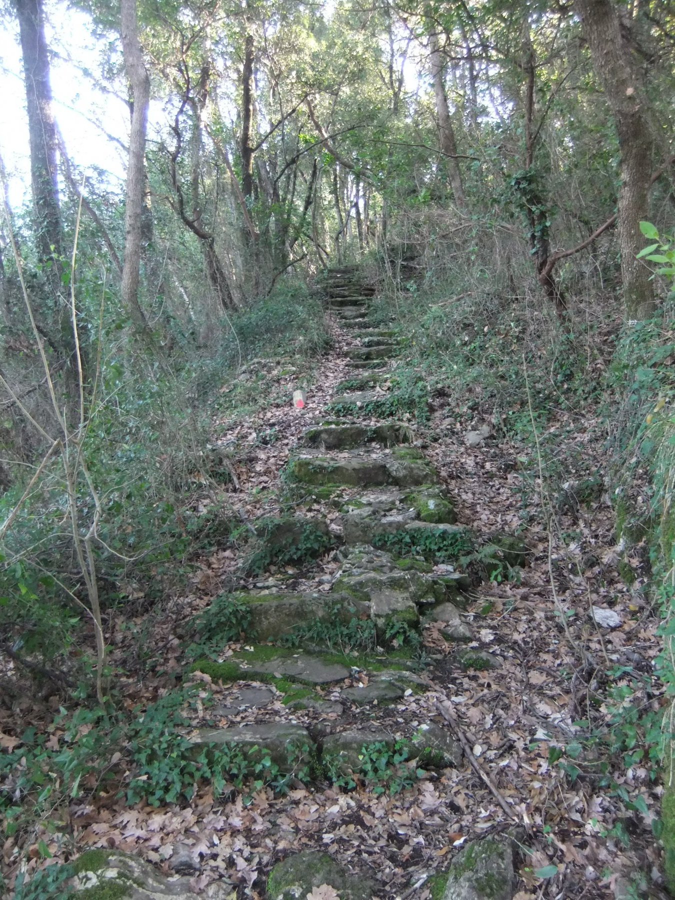 Nella curva prima della sbarra infatti il sentiero inizia a scendere lungo il boscoso crinale , spesso affiancato da antichi muretti o lastre di pietra. Si passa accanto ad una casetta di legno e poi si arriva alle Case Costa (fontana).