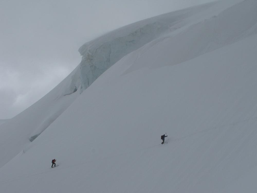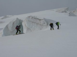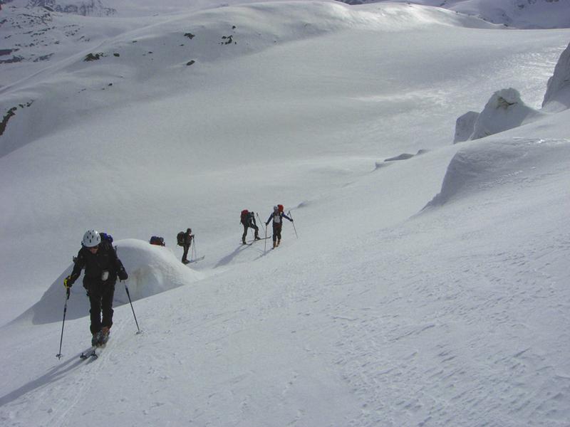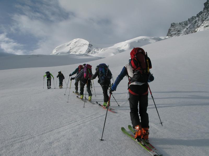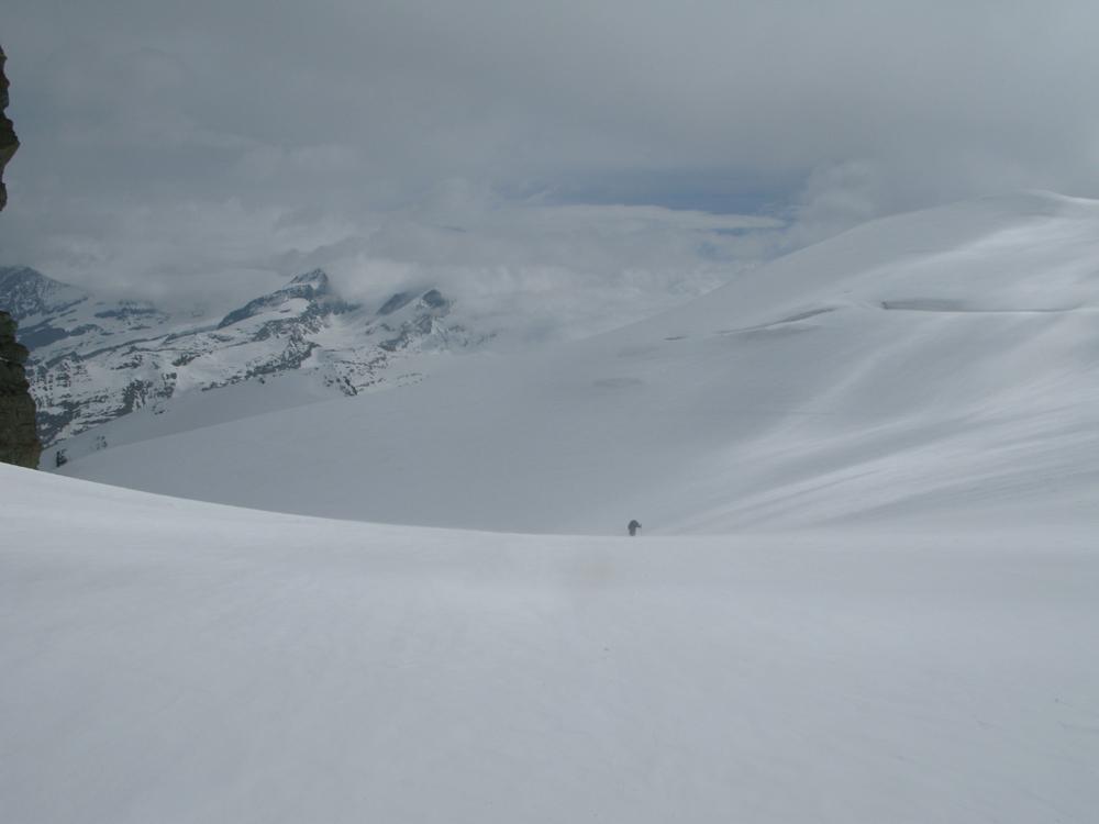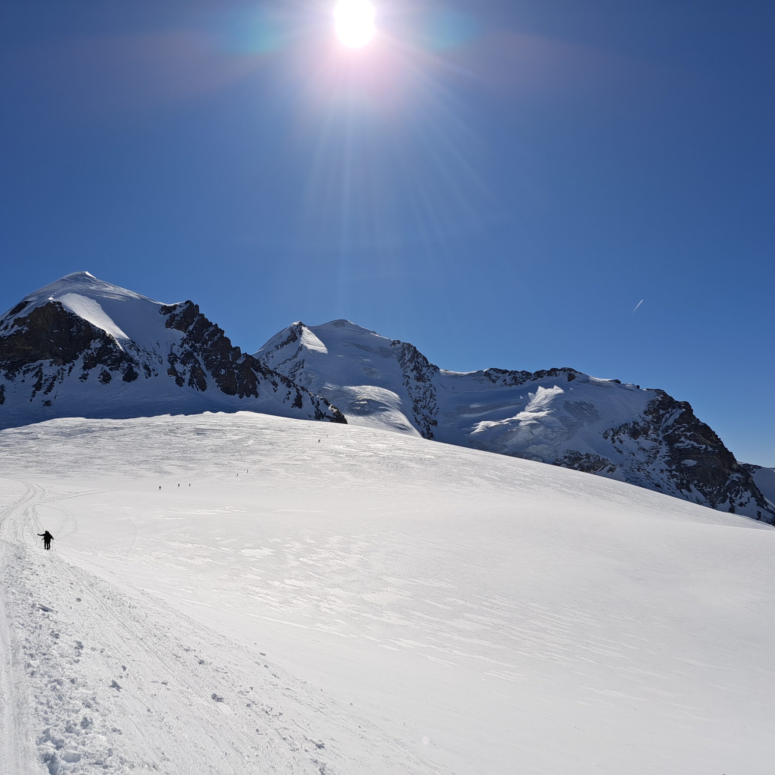 Dal Rifugio Monte Rosa Hutte si scende sul ghiacciaio Gornergletscher fino alla confluenza con il ghiacciaio Schwarzegletscher a circa 4280 m .