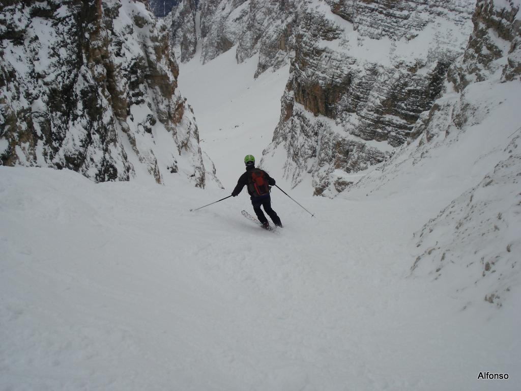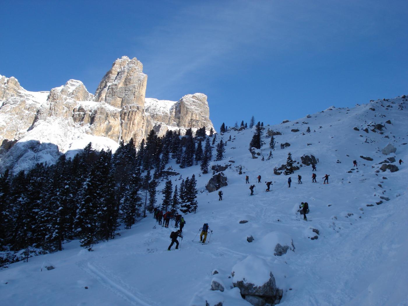 Dal Pian de Sciavaneis seguire il sentiero escursionistico per il Rif. Boè (cartelli) e risalire nel bosco rado fino a raggiungere la parete O del Sass Pordoi; procedere verso Nord risalendo il primo grande risalto della Valle Lasties. Giunti al pianoro Pian del Siella e lasciato sulla destra un ripido canale (Holzer) risalire a zig zag un ripido dosso e procedere nel largo vallone del Foss fino al Rif. Forcella Pordoi; in alternativa risalire un canale secondario a sinistra (salendo) che sbuca alla stessa quota ma qualche centinaio di metri più ad est già in direzione del Piz Boè.