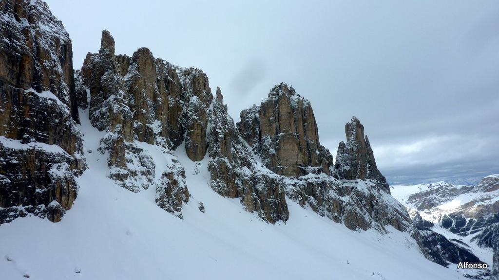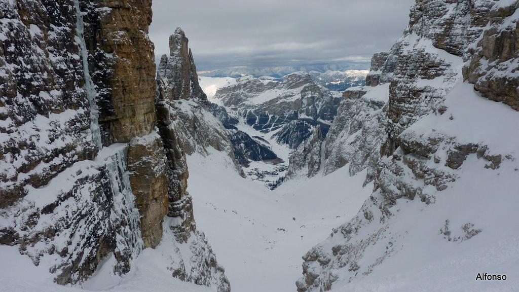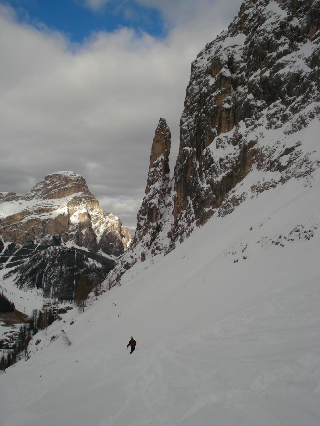Attraversare in quota il bordo dell’altopiano e passando sotto la parete Ovest del Piz Boè si perviene in un’ora circa al Rif. Boè, da cui inizia la lunga discesa per suggestivo e ripido vallone di Mesdì