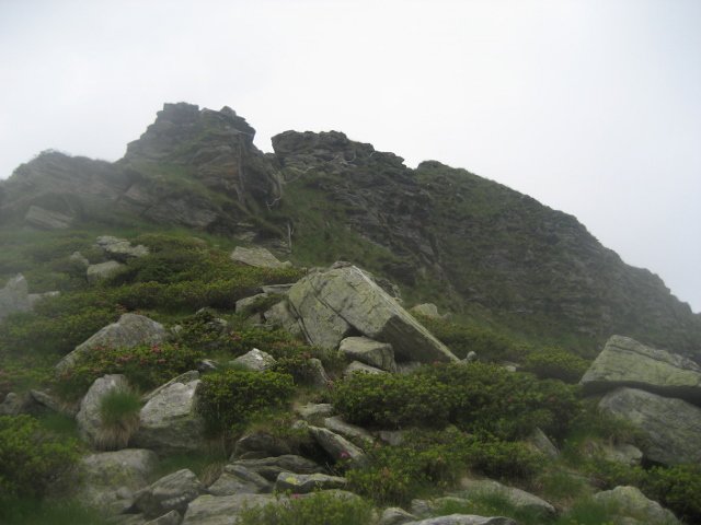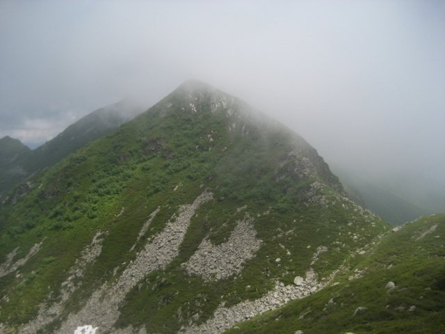 Seguire la cresta a sinistra che, dopo un banale saltino roccioso, conduce sulla Punta Scalaccia, m. 2030.