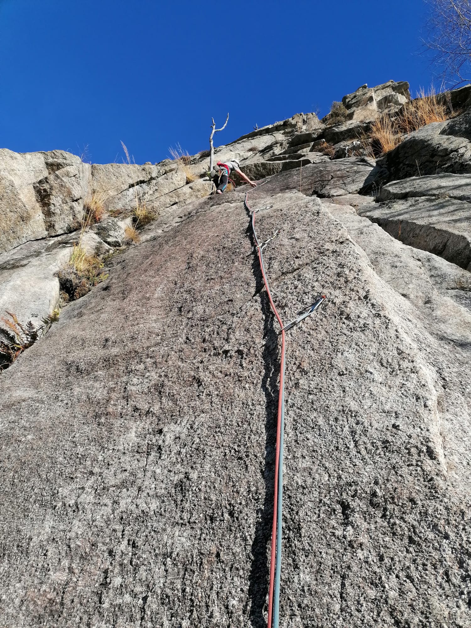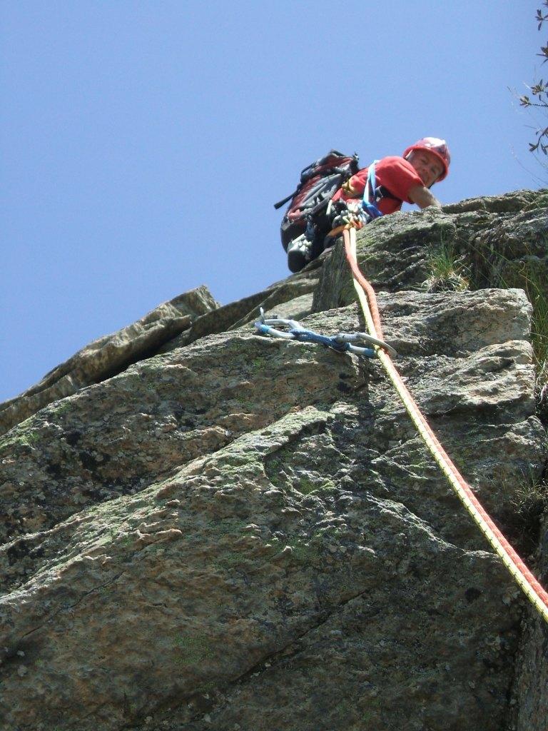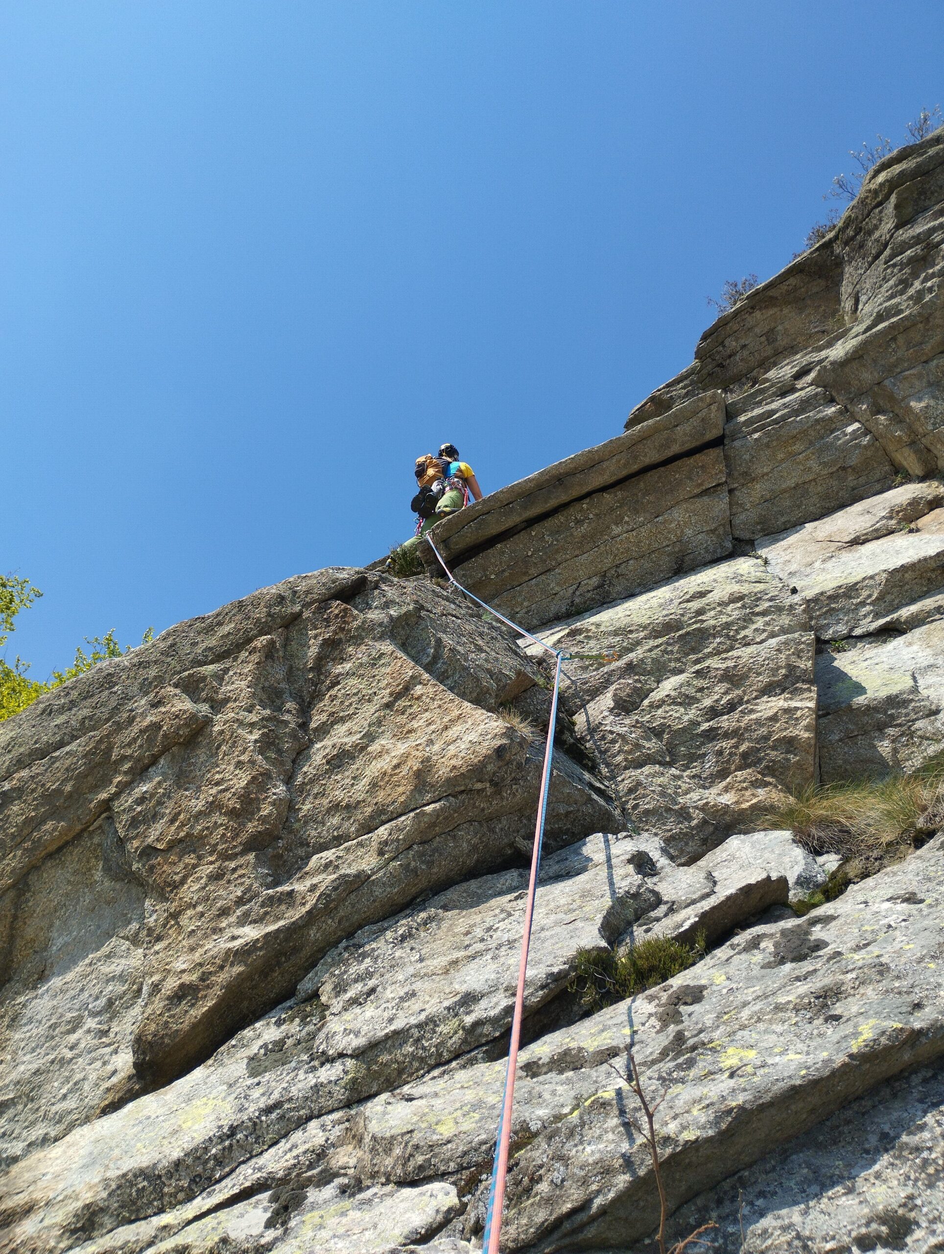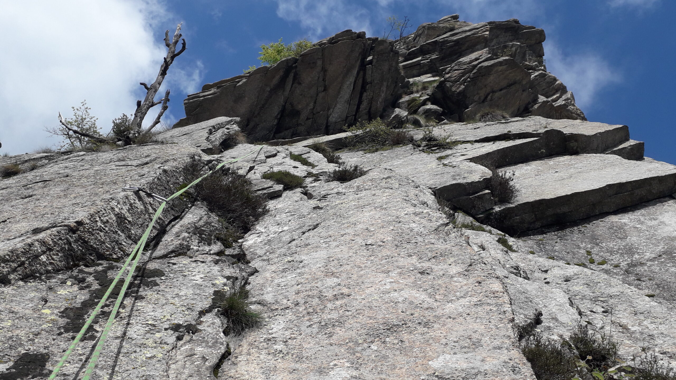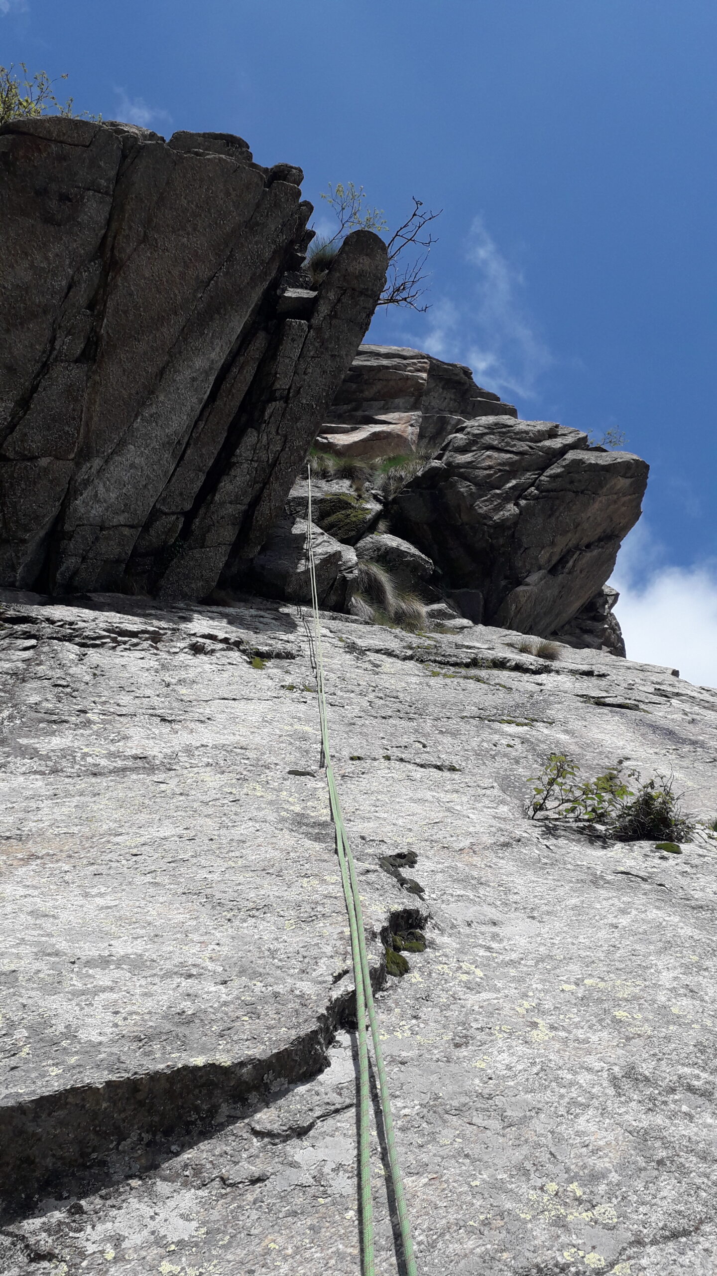 - L6 tiro in comune con spigolo sud 3c seguendo lo spigolo, nessun spit se non 1 in cima prima della sosta per superare un piccolo tetto 5c ma volendo aggirabile a sx.