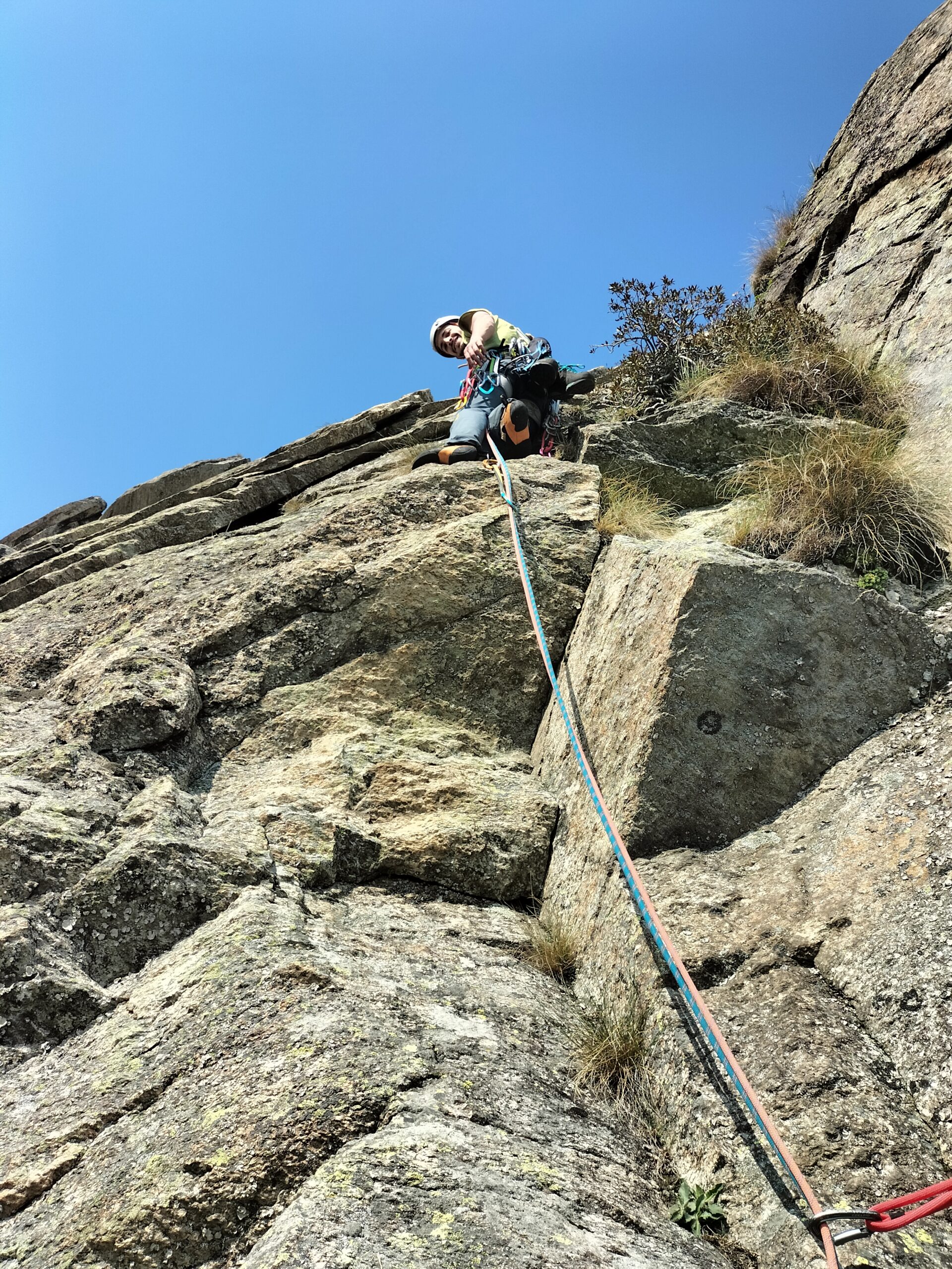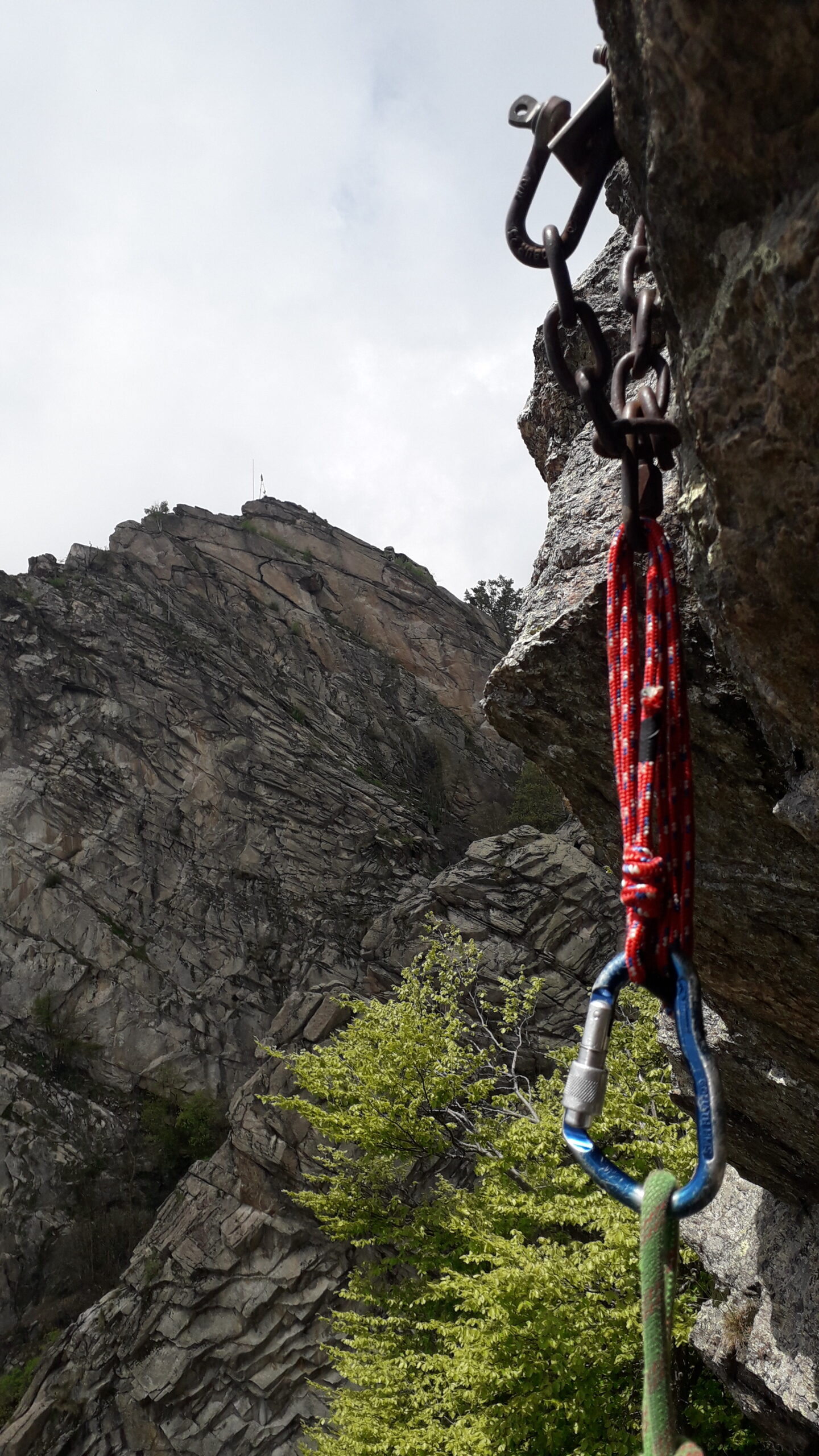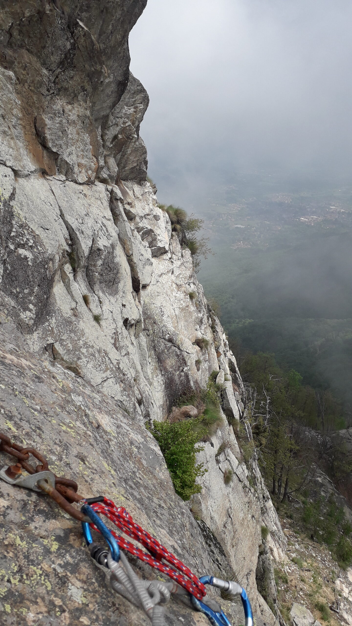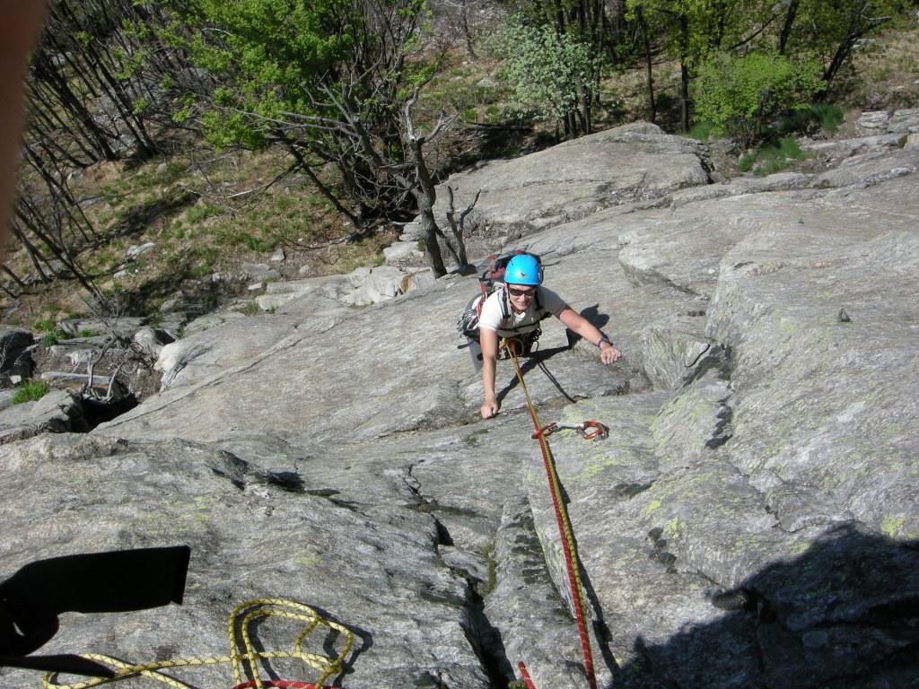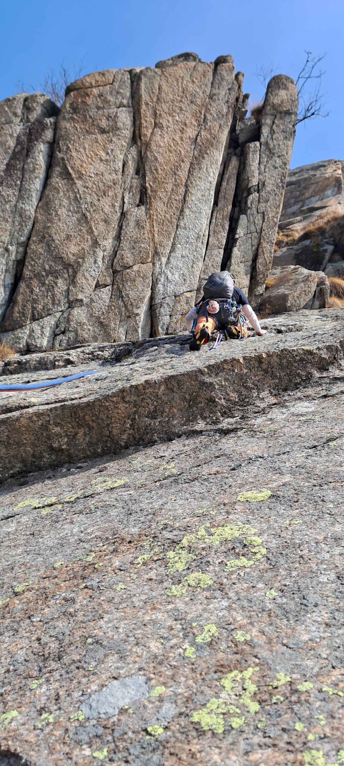 - L6 tiro in comune con spigolo sud 3c seguendo lo spigolo, nessun spit se non 1 in cima prima della sosta per superare un piccolo tetto 5c ma volendo aggirabile a sx.