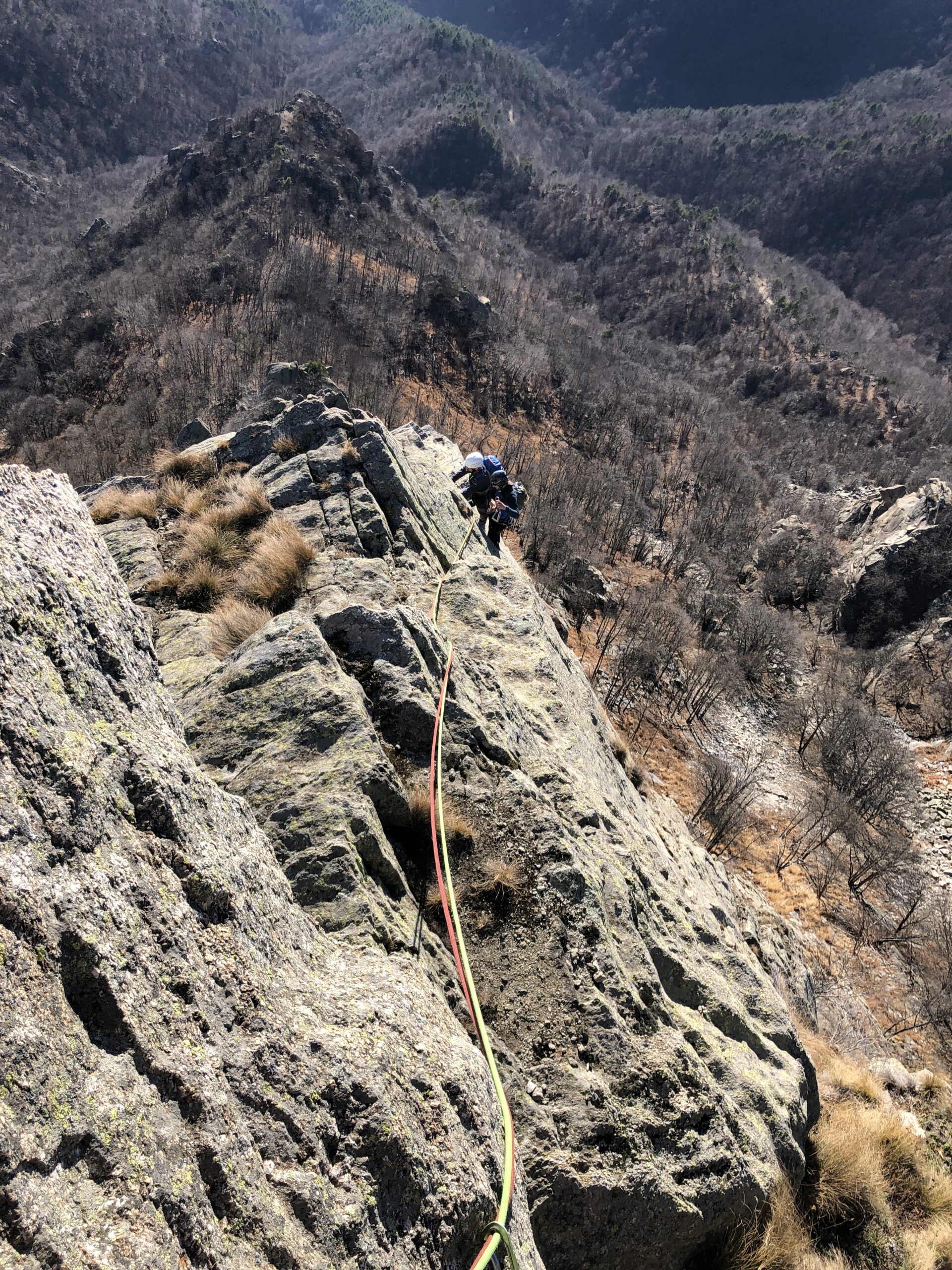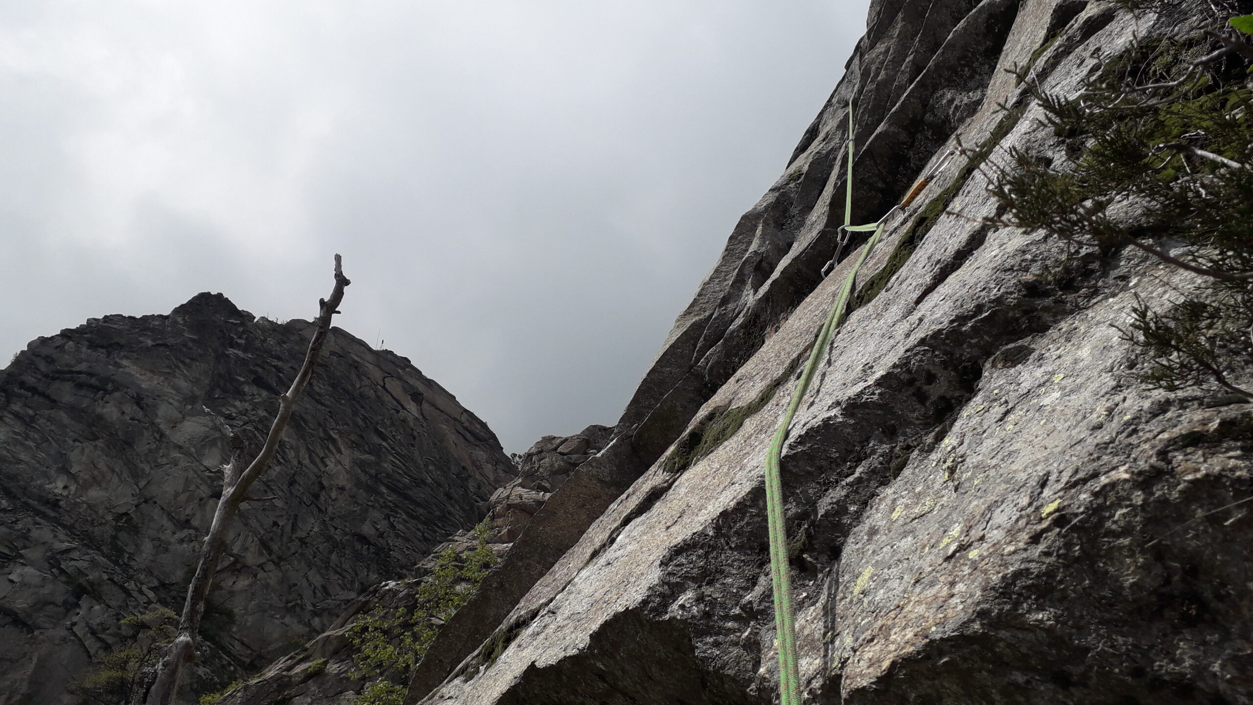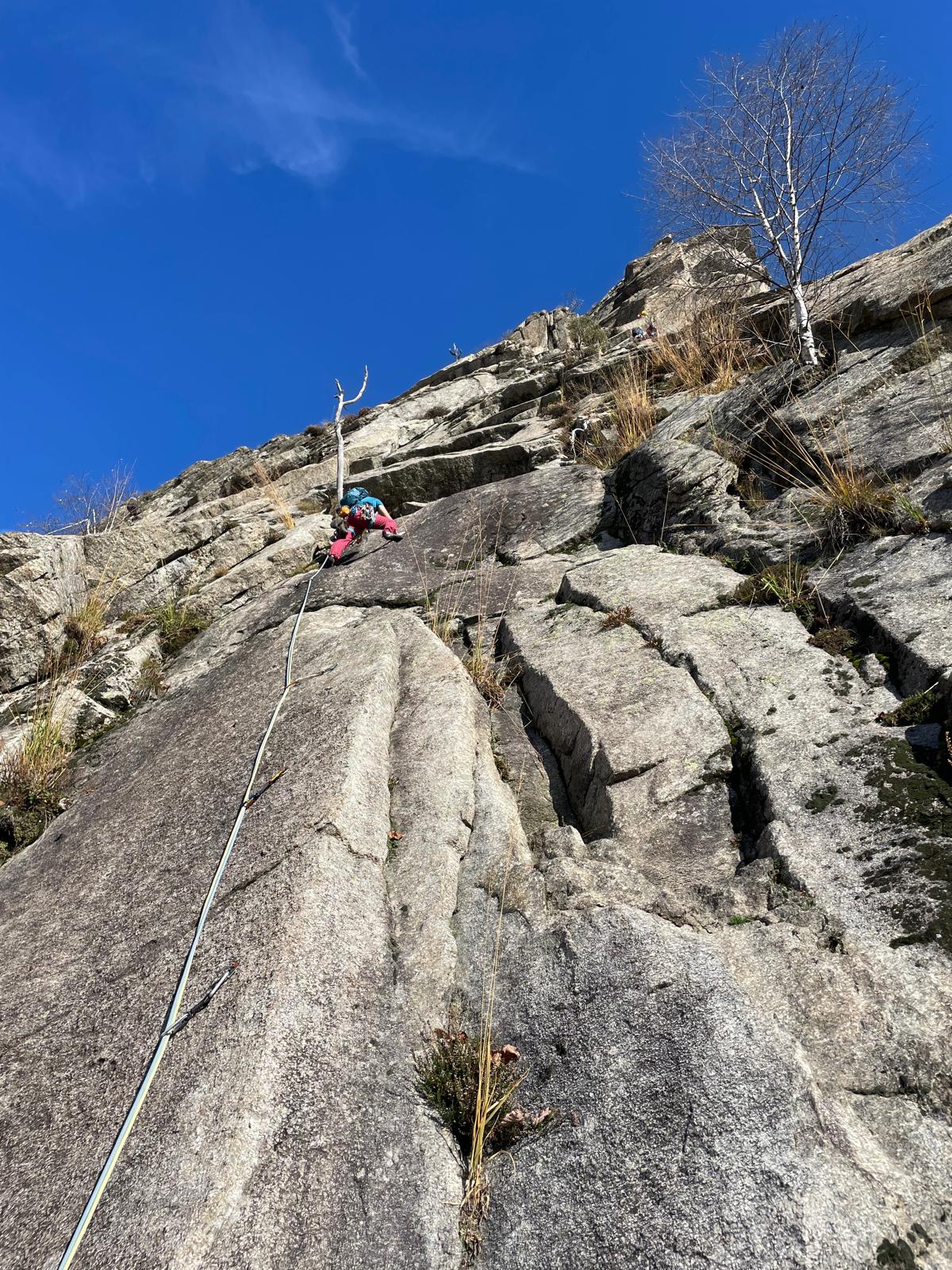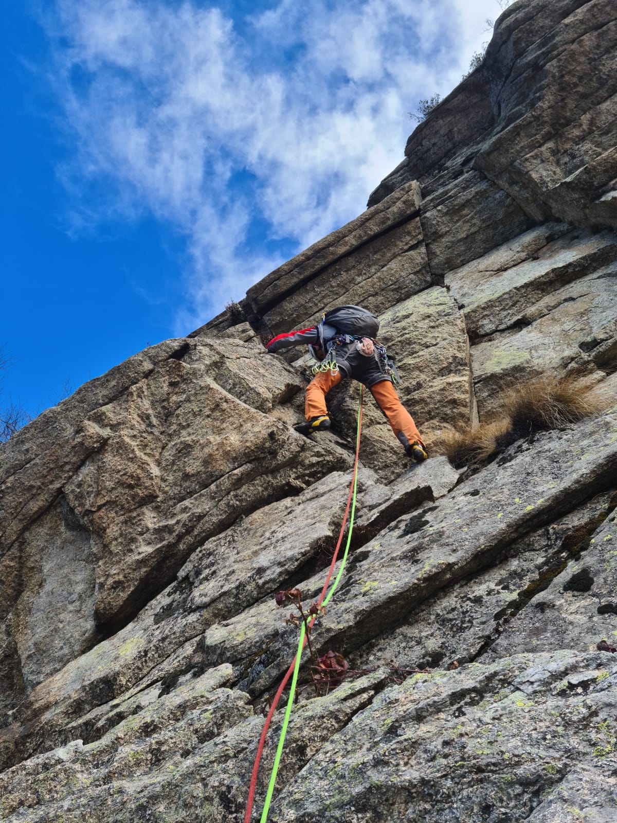 - L6 tiro in comune con spigolo sud 3c seguendo lo spigolo, nessun spit se non 1 in cima prima della sosta per superare un piccolo tetto 5c ma volendo aggirabile a sx.