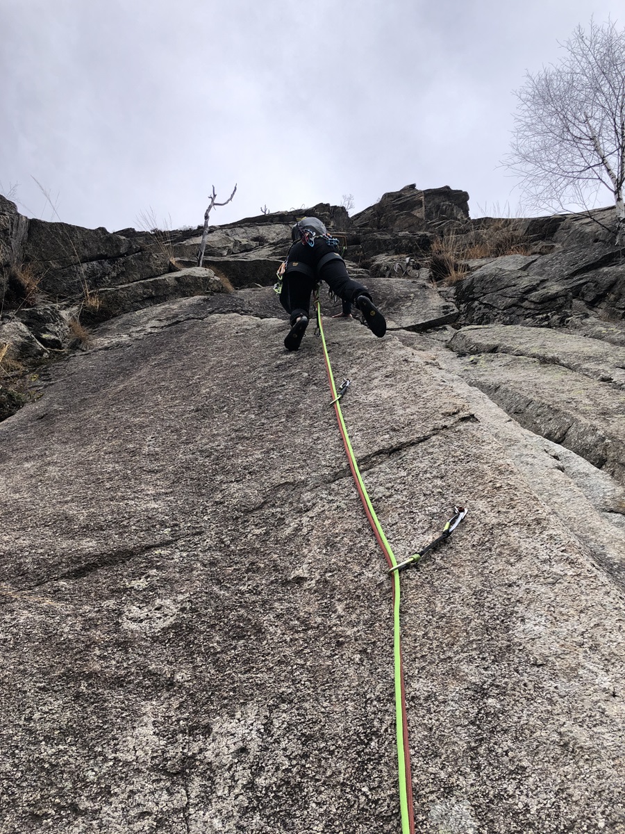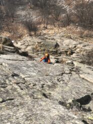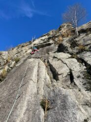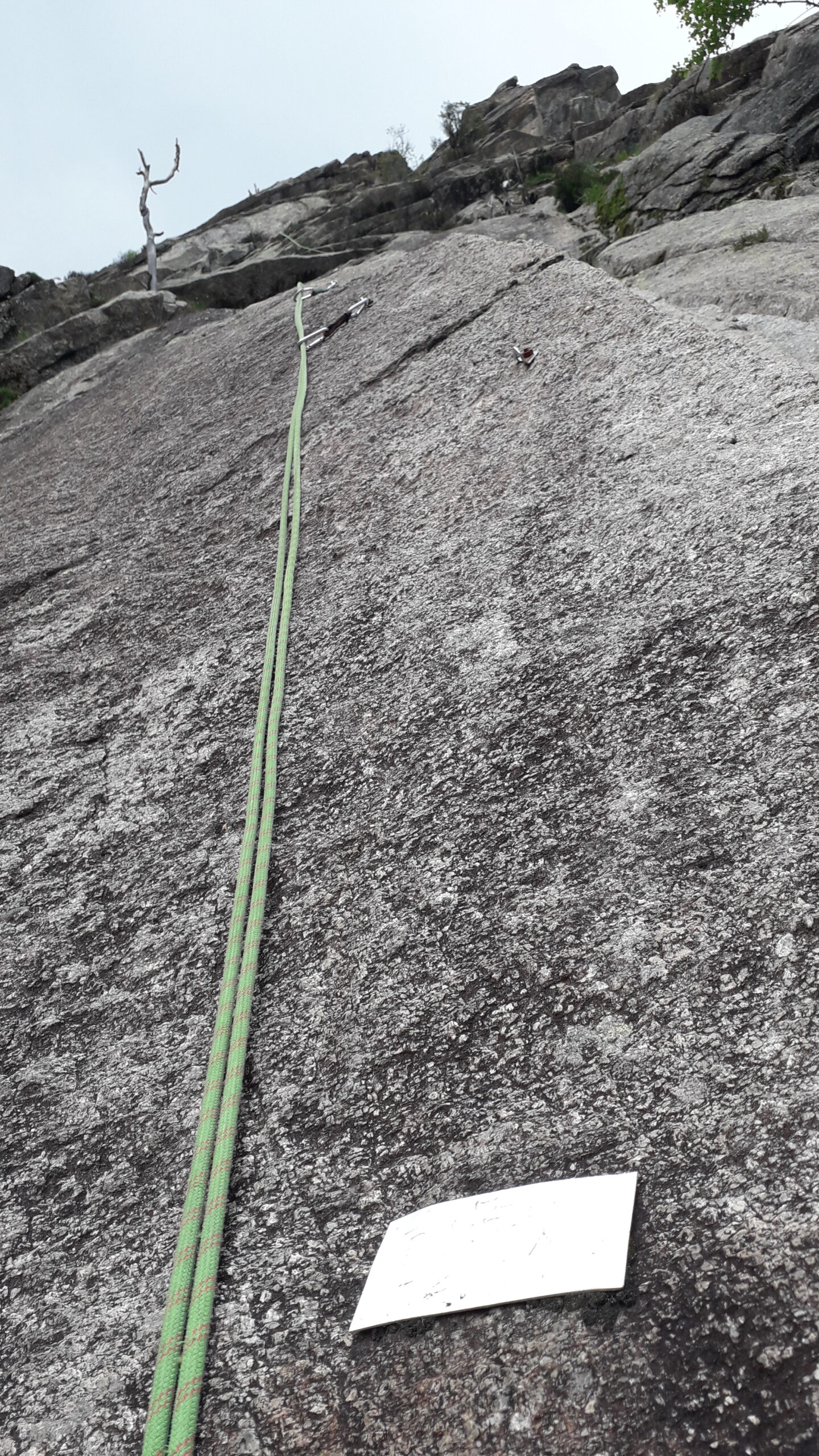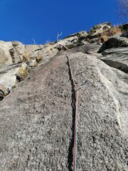 - L1 placca iniziale con partenza su piccolo diedro a dx, placca, piccolo traverso delicato a sx 6A per poi rientrare in sosta ( scomoda ) verso dx 30 mt. ( trascurare una sosta vetusta molto a dx probabilmentedi ” via dei diedri”)