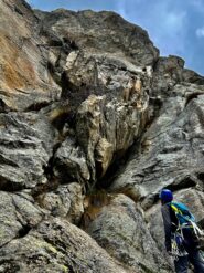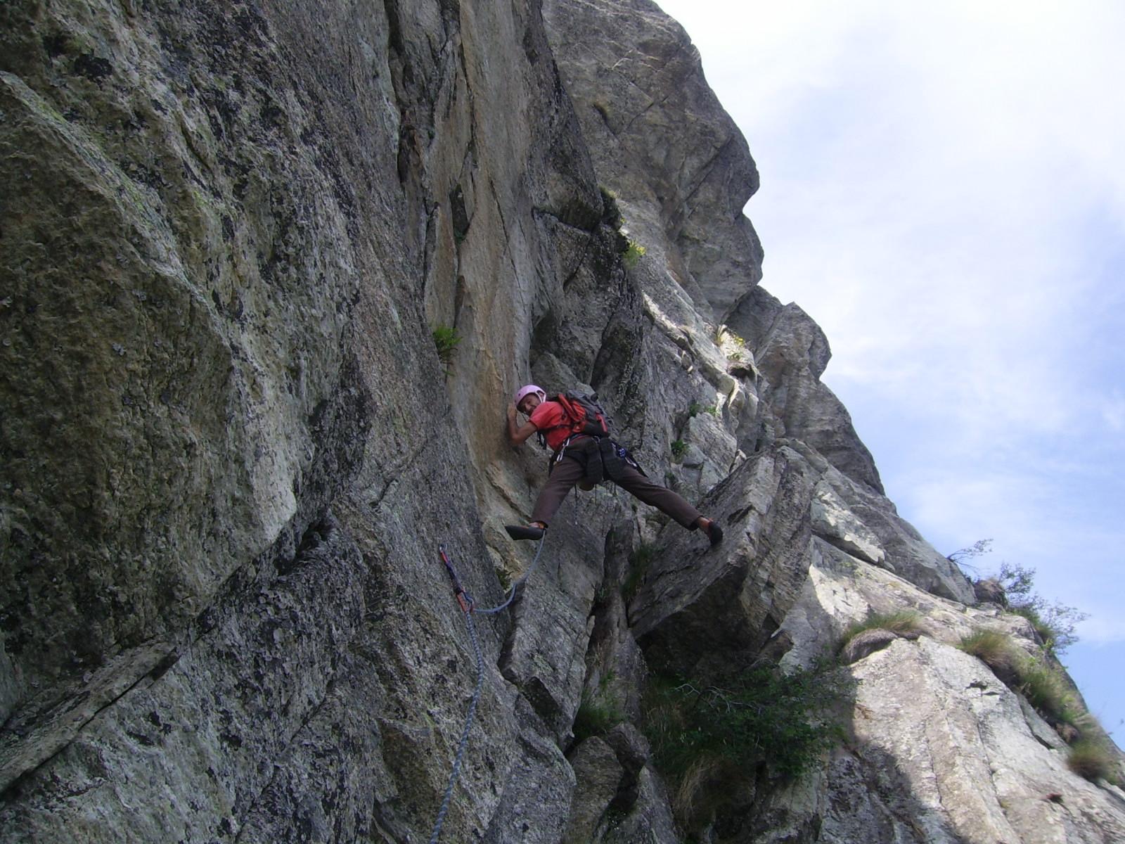 L4 – 5a 25mt: seguire l’evidente tetto-diedro verso dx, (chiodo visibile) e con bei passaggi portarsi al di sopra appena possibile e sostare (in comune con Spigolo Sud e Gervasutti).