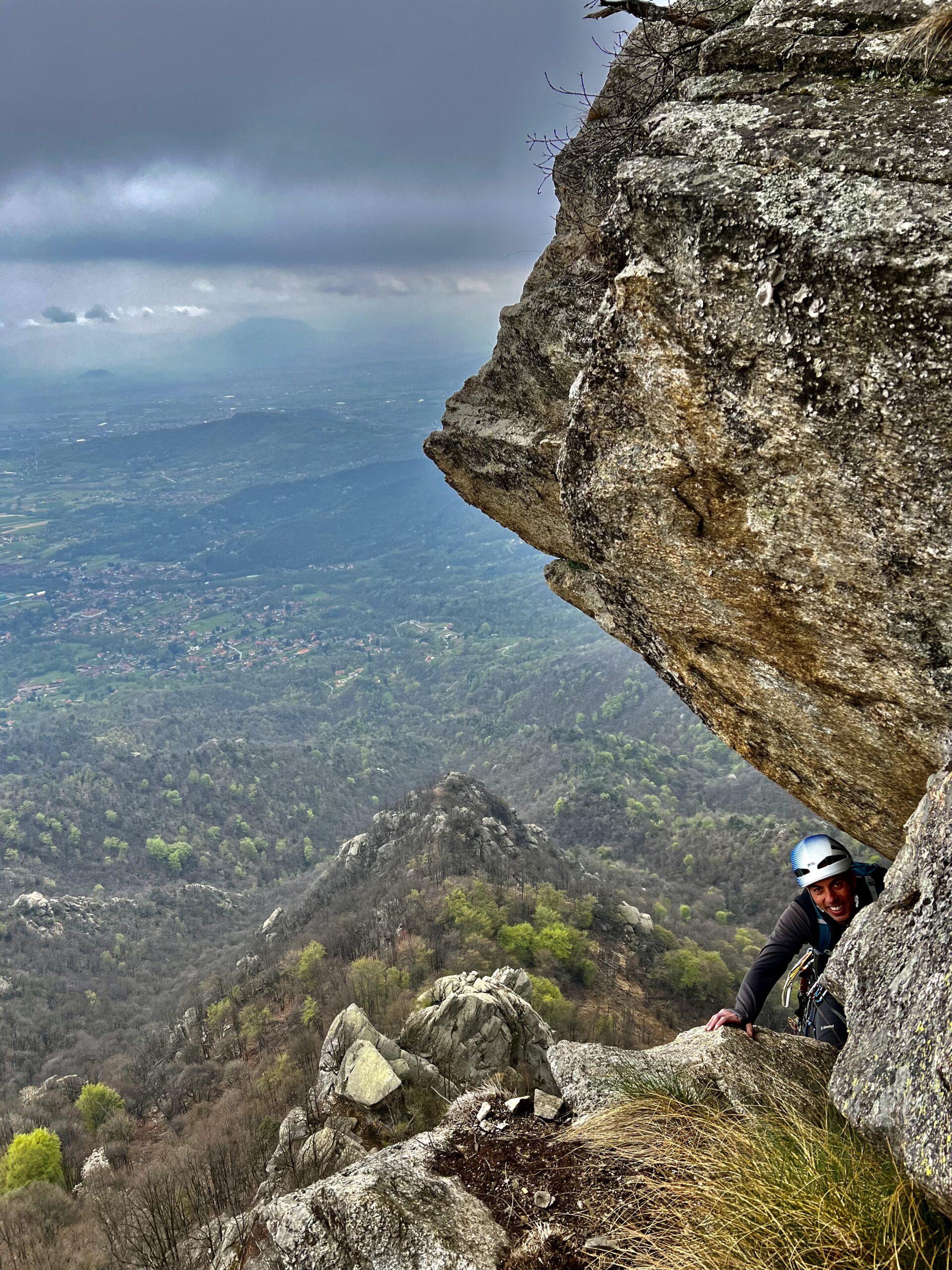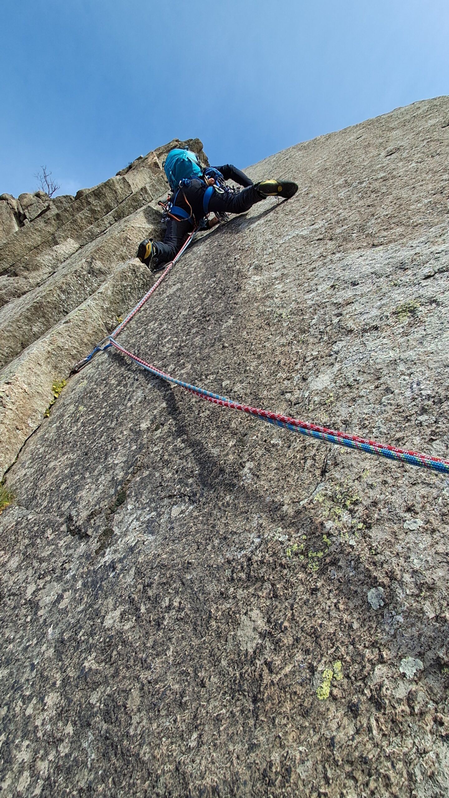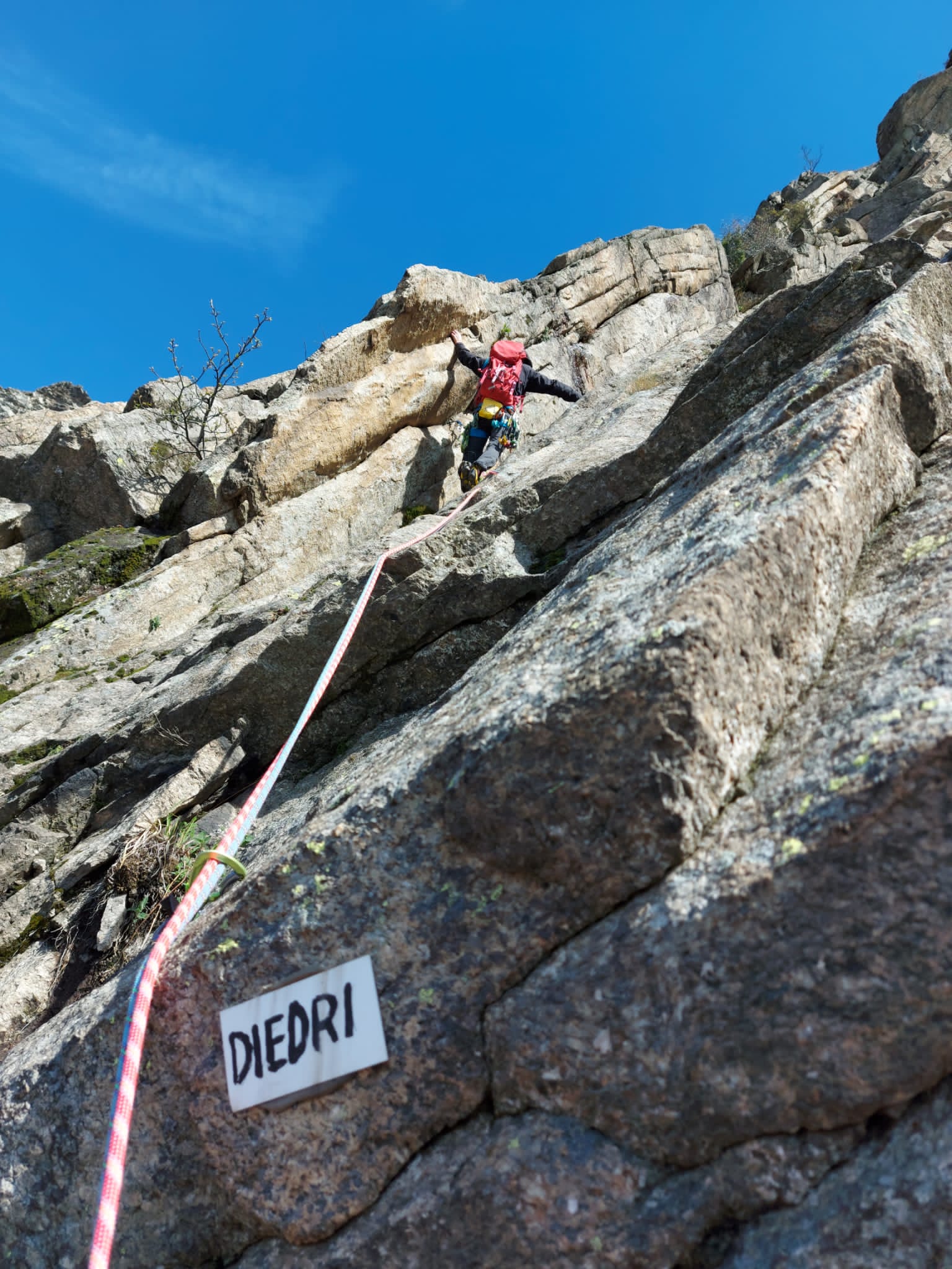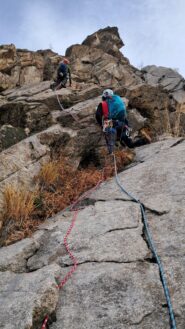 L1 – 5a 30mt: placca, poi spostarsi nel diedro e in prossimità di un tettino spostarsi a sx e sostare.