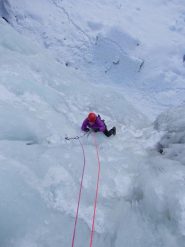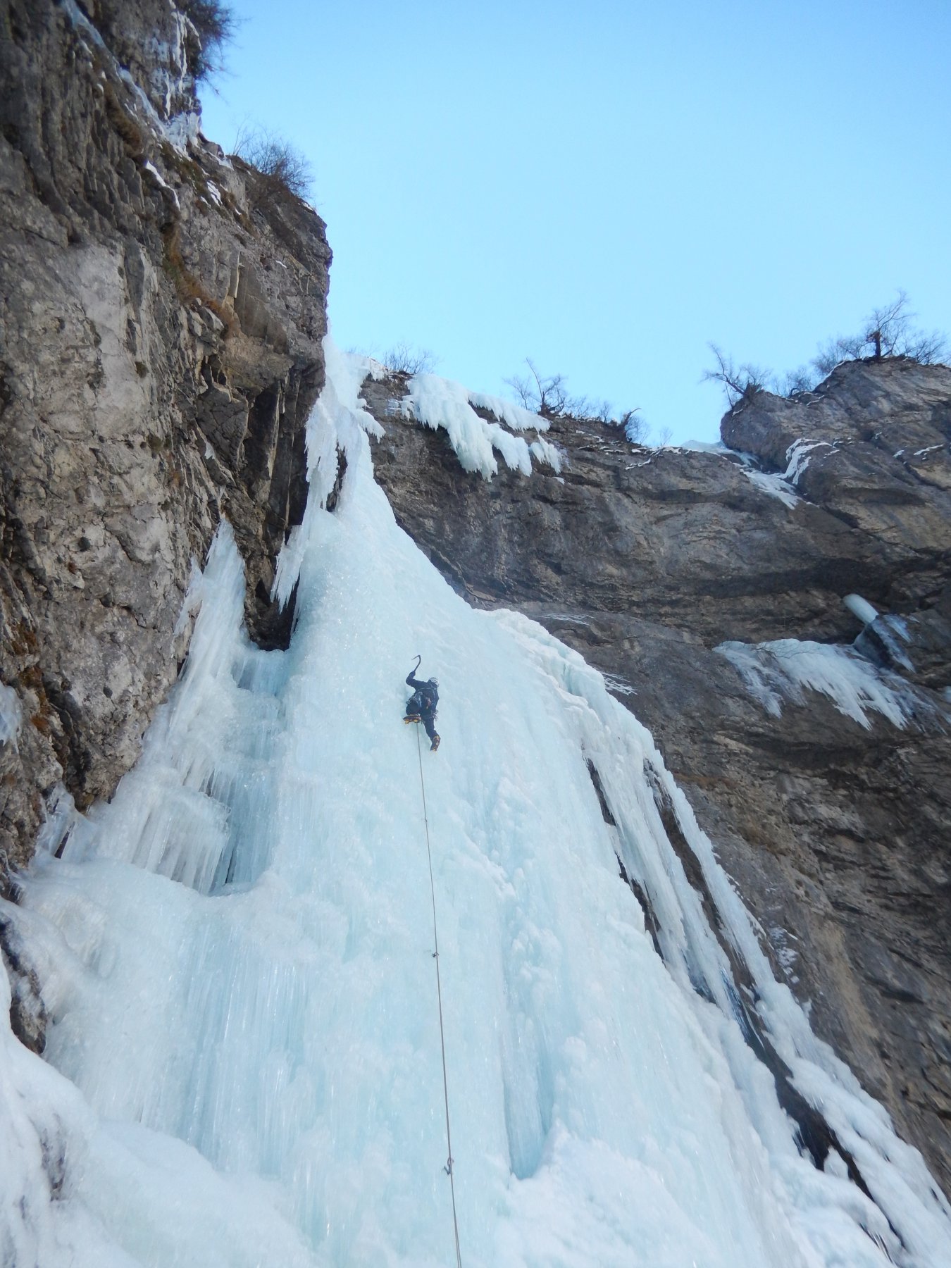 Tre lunghezze portano alla conca superiore. Qui’ si formano ben sei salti stalattitici sui 25m, ognuno scelga il suo!