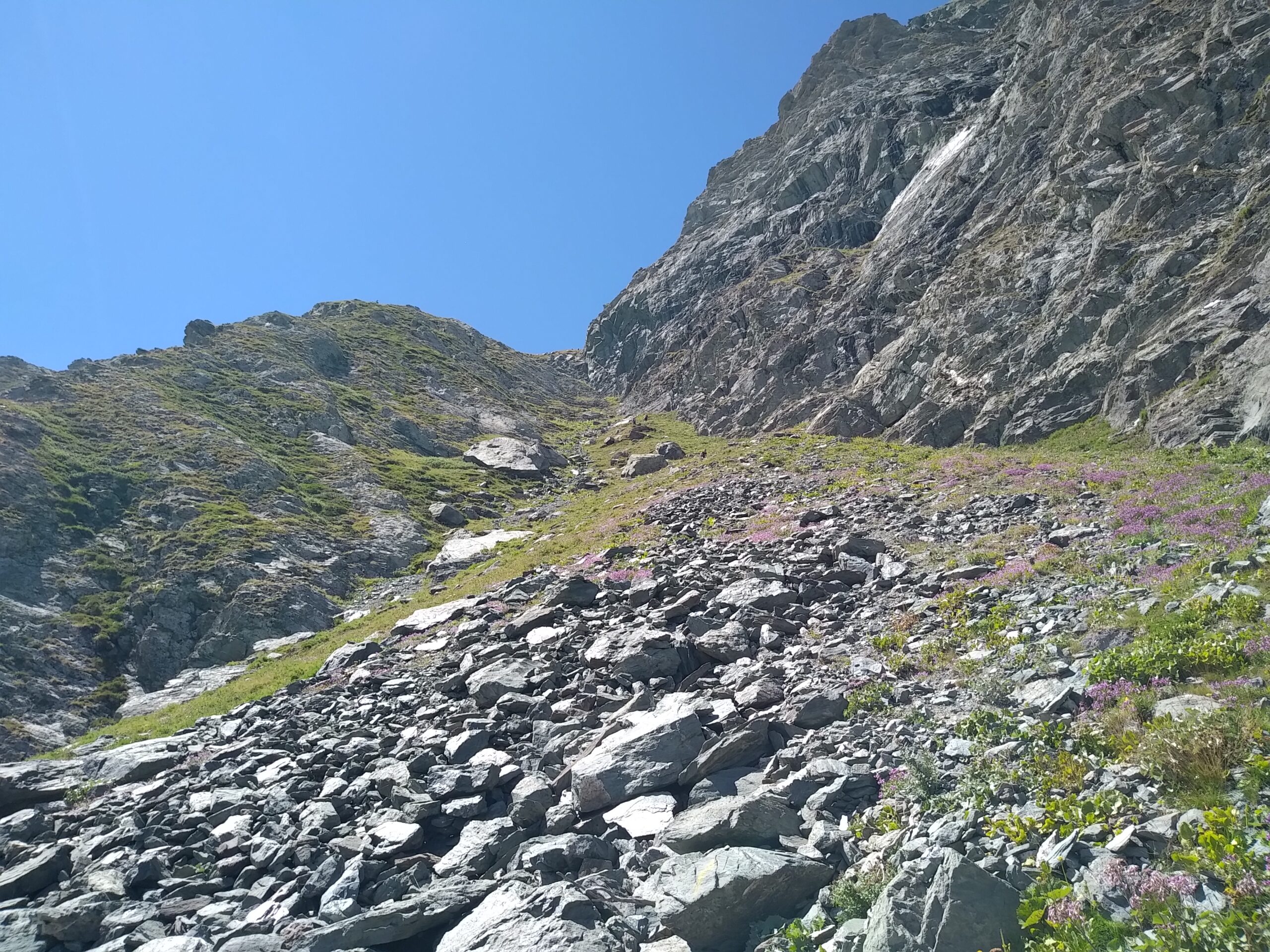 Giunti davanti alle bergerie, imboccare a ds la lunghissima discesa del sentiero nel vallone Giulian,la quale, sconfinando nell’ adiacente vallone Cruello, conduce con alcuni saliscendi e spettacolari traversi fino al punto di partenza.