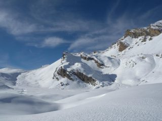 Siamo scesi dalla vetta con gli sci sul pendio esposto al sole, primo tratto con neve spazzata dal vento, molto dura, nella metà bassa bella farina. Conviene forse scendere vicino alla cresta riguadagnando il colle dove si trova farina. Nella parte bassa si alterna farina a crostosa, si arriva a 5 min dalla macchina