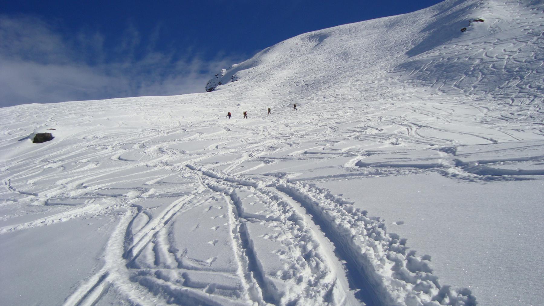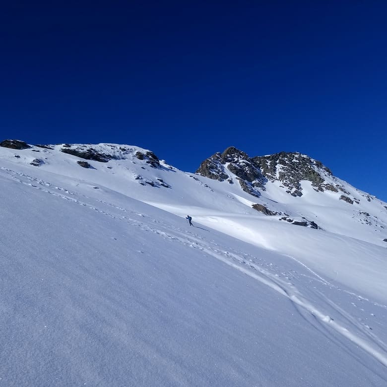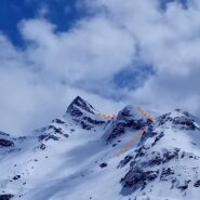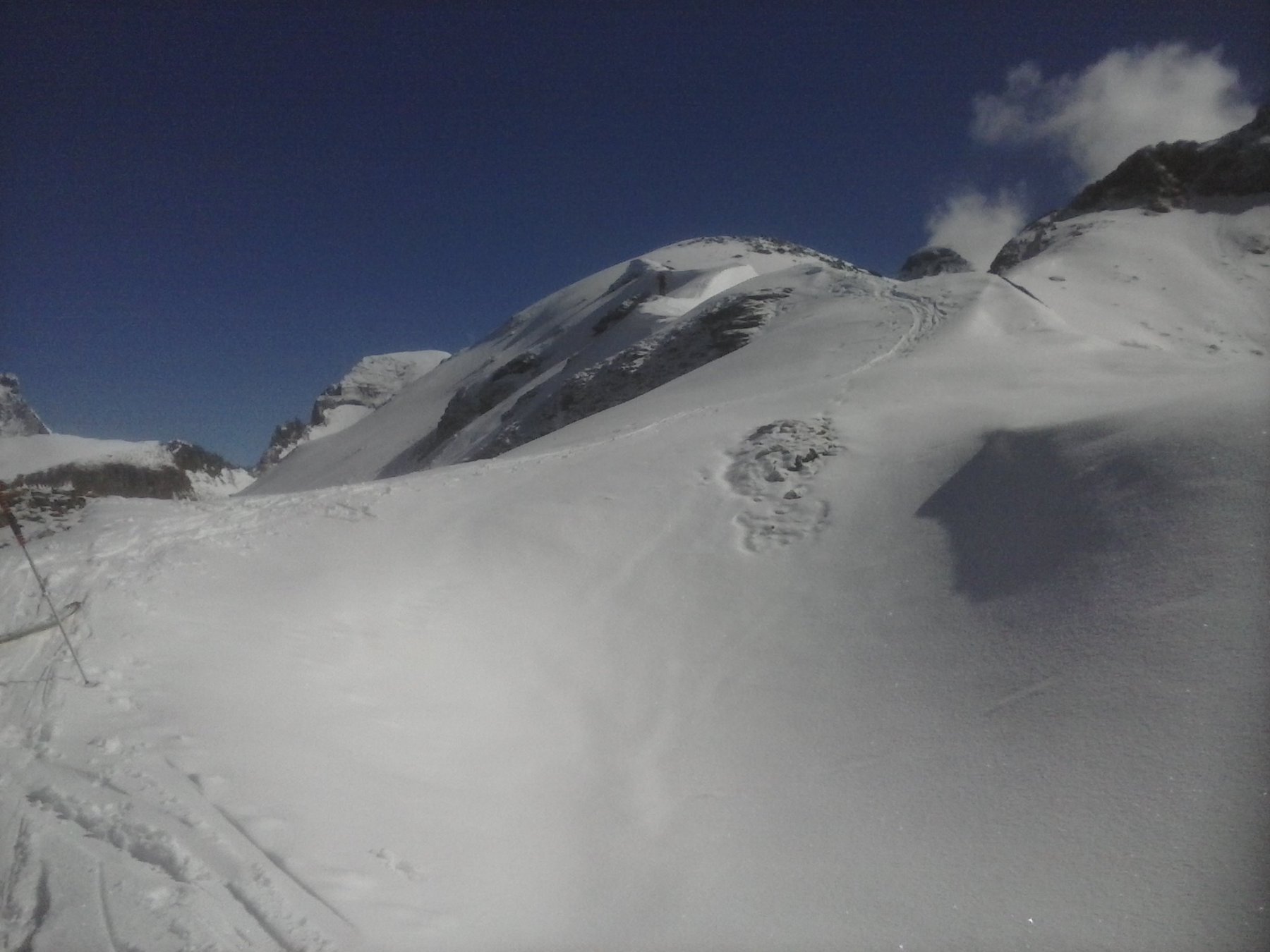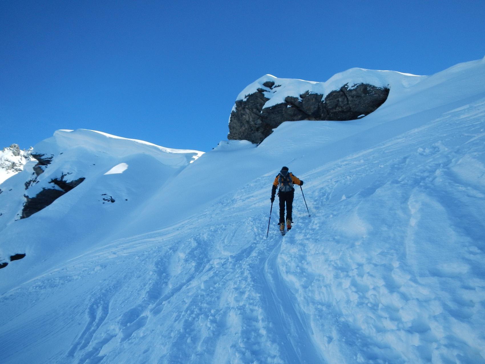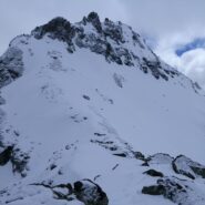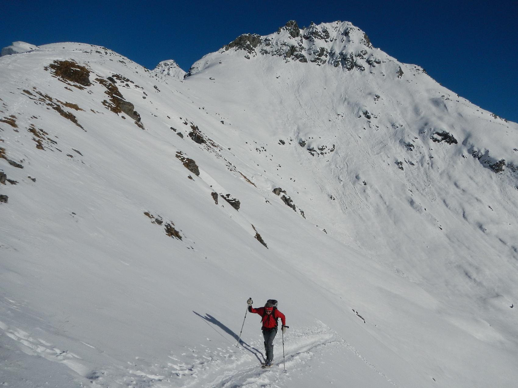 2. Risalire il ripido pendio sulla verticale della punta fino a q. 2650-2700, quindi quando il pendio diventa molto ripido deviare a destra e uscire sull’ampia spalla a 2730~.
