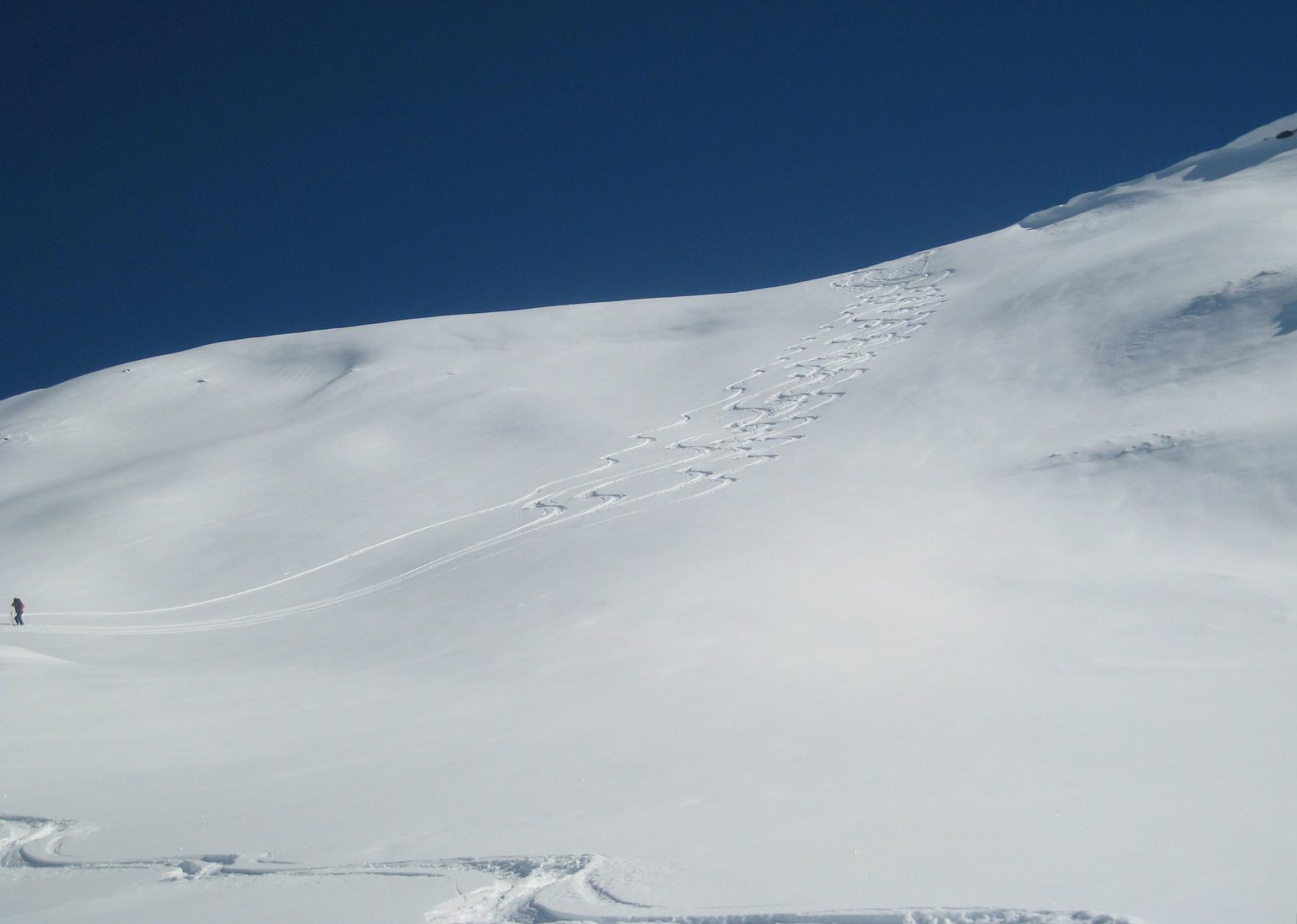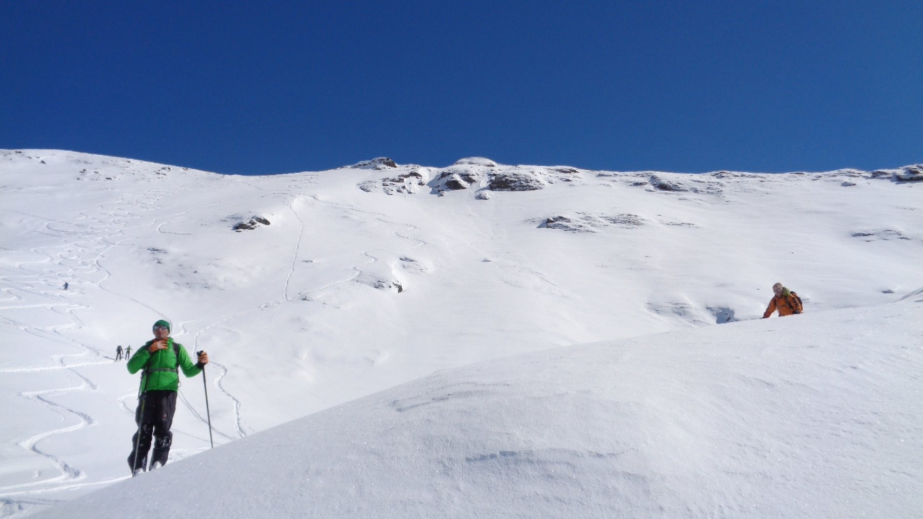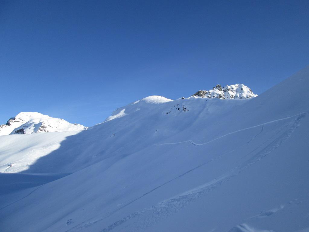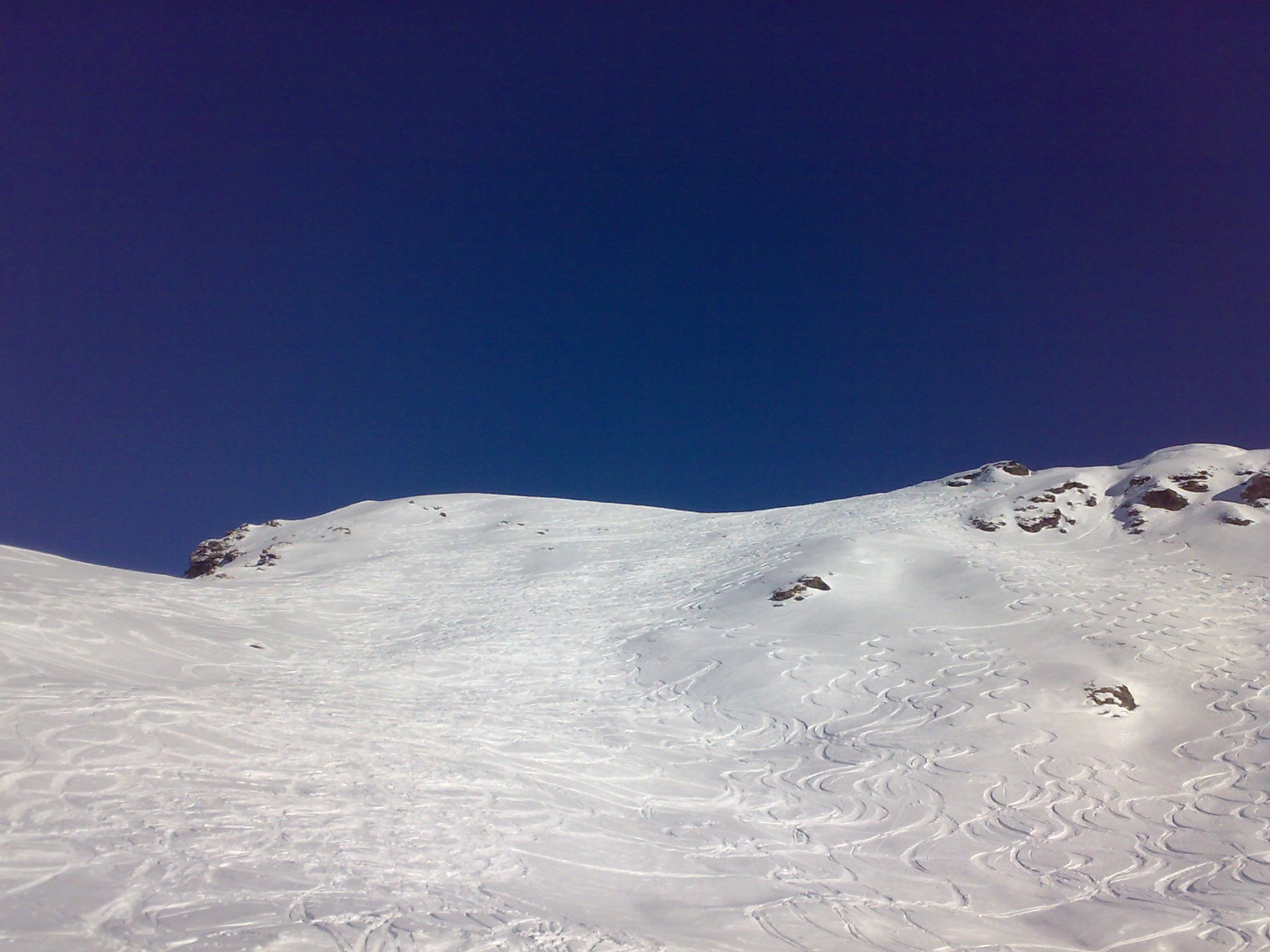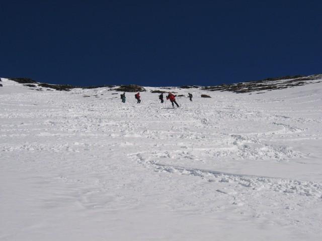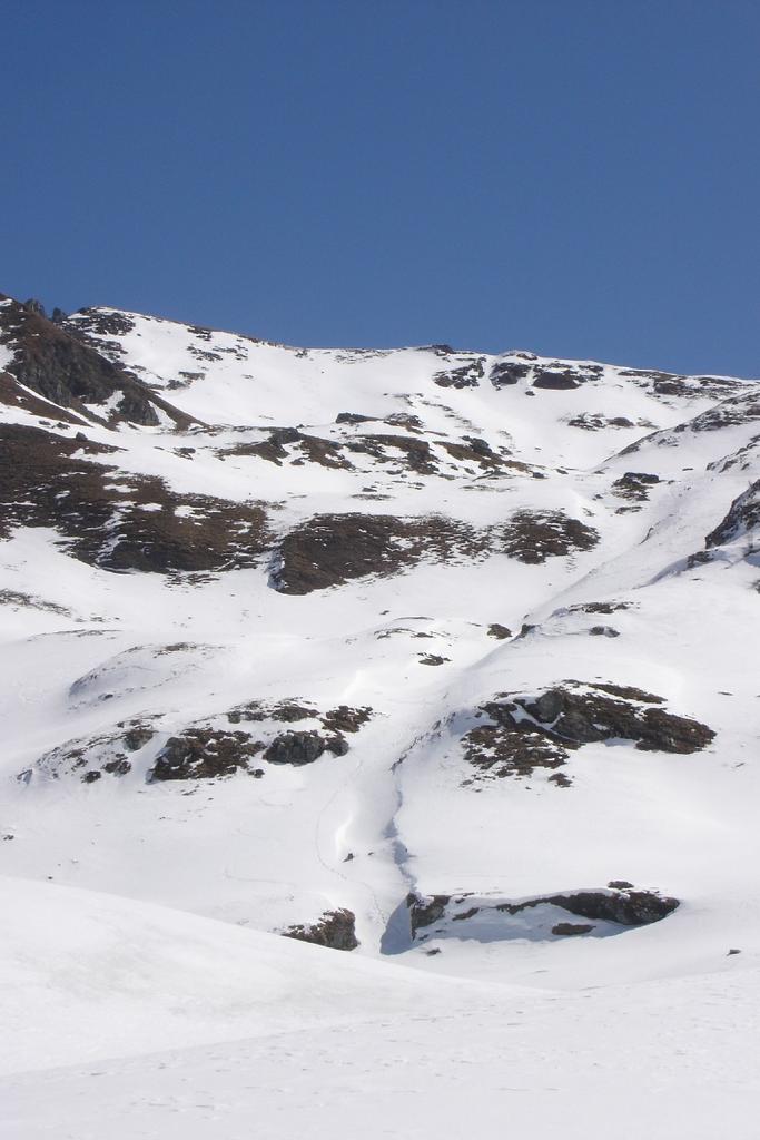 2. Risalire il ripido pendio sulla verticale della punta fino a q. 2650-2700, quindi quando il pendio diventa molto ripido deviare a destra e uscire sull’ampia spalla a 2730~.