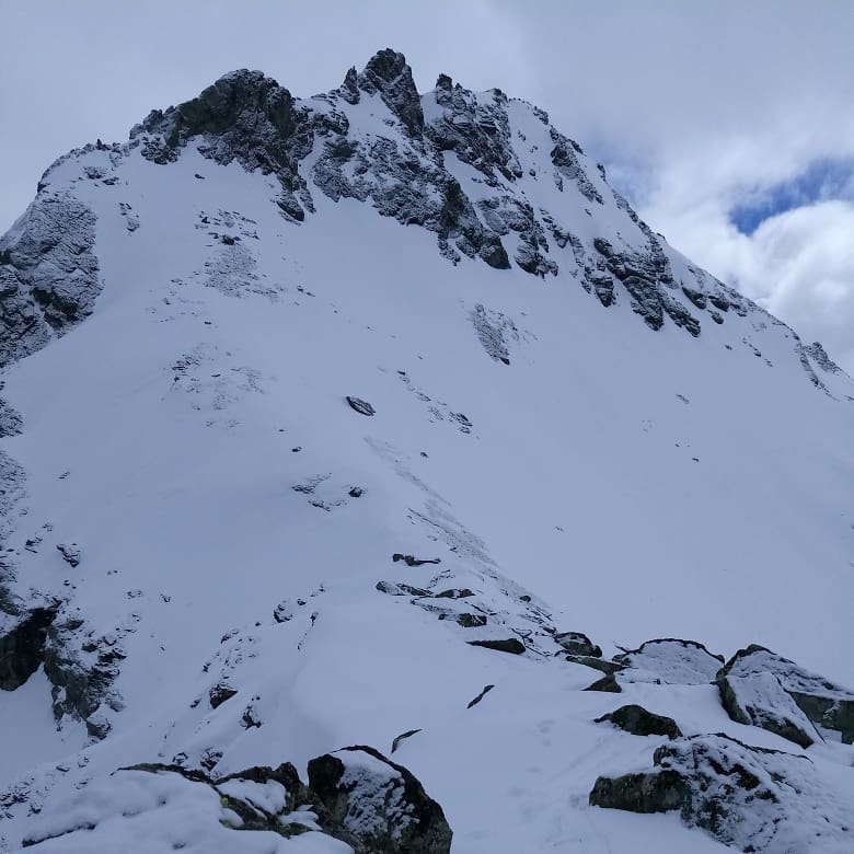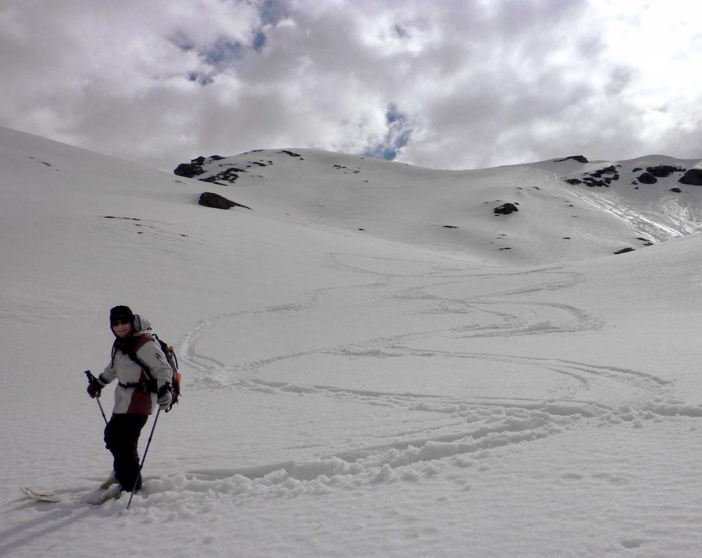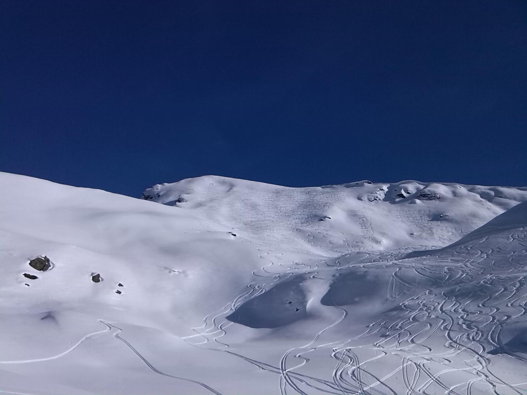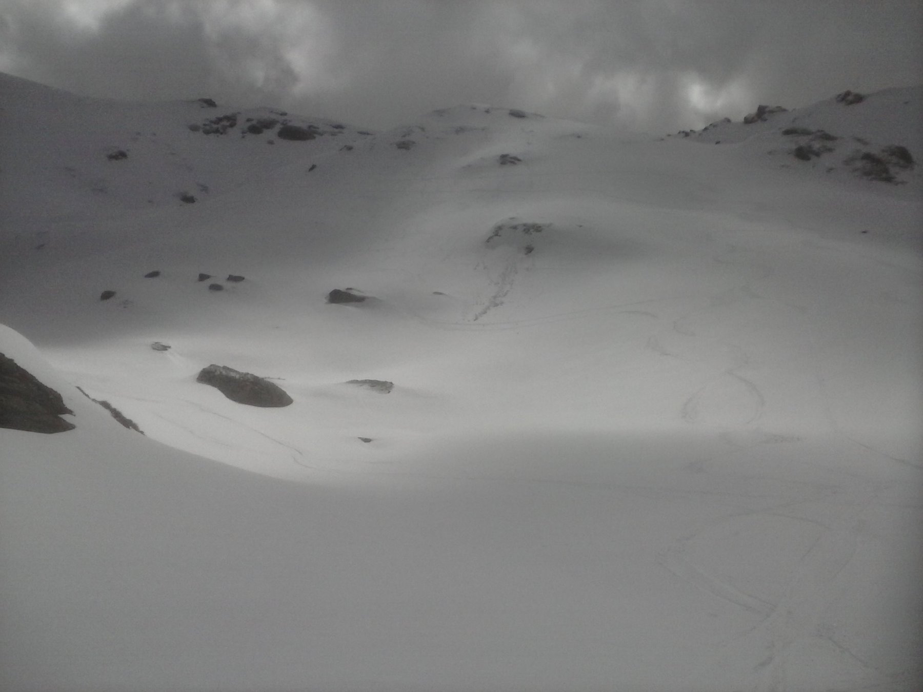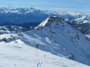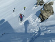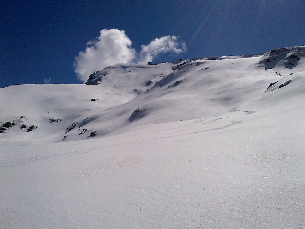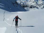2. Risalire il ripido pendio sulla verticale della punta fino a q. 2650-2700, quindi quando il pendio diventa molto ripido deviare a destra e uscire sull’ampia spalla a 2730~.