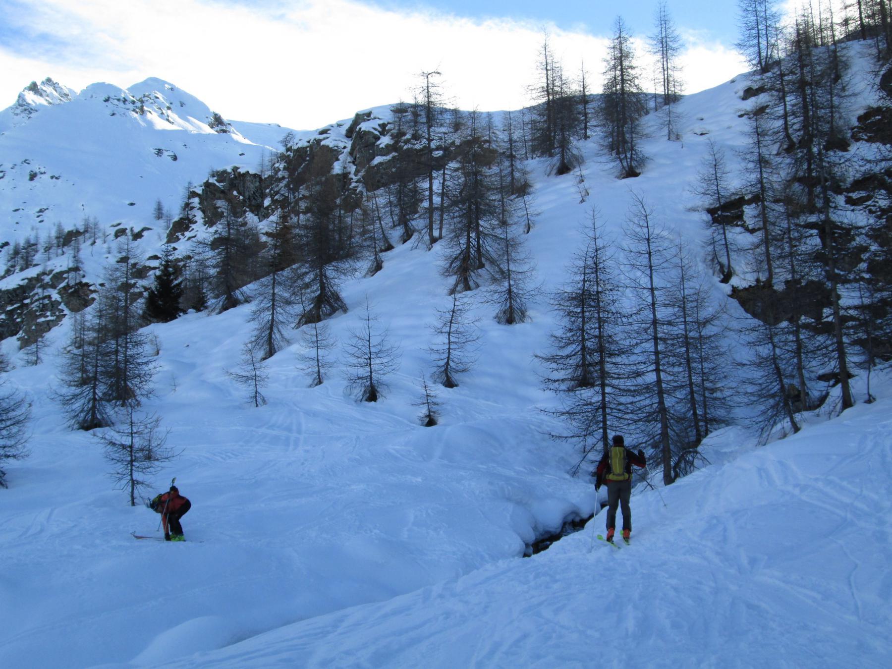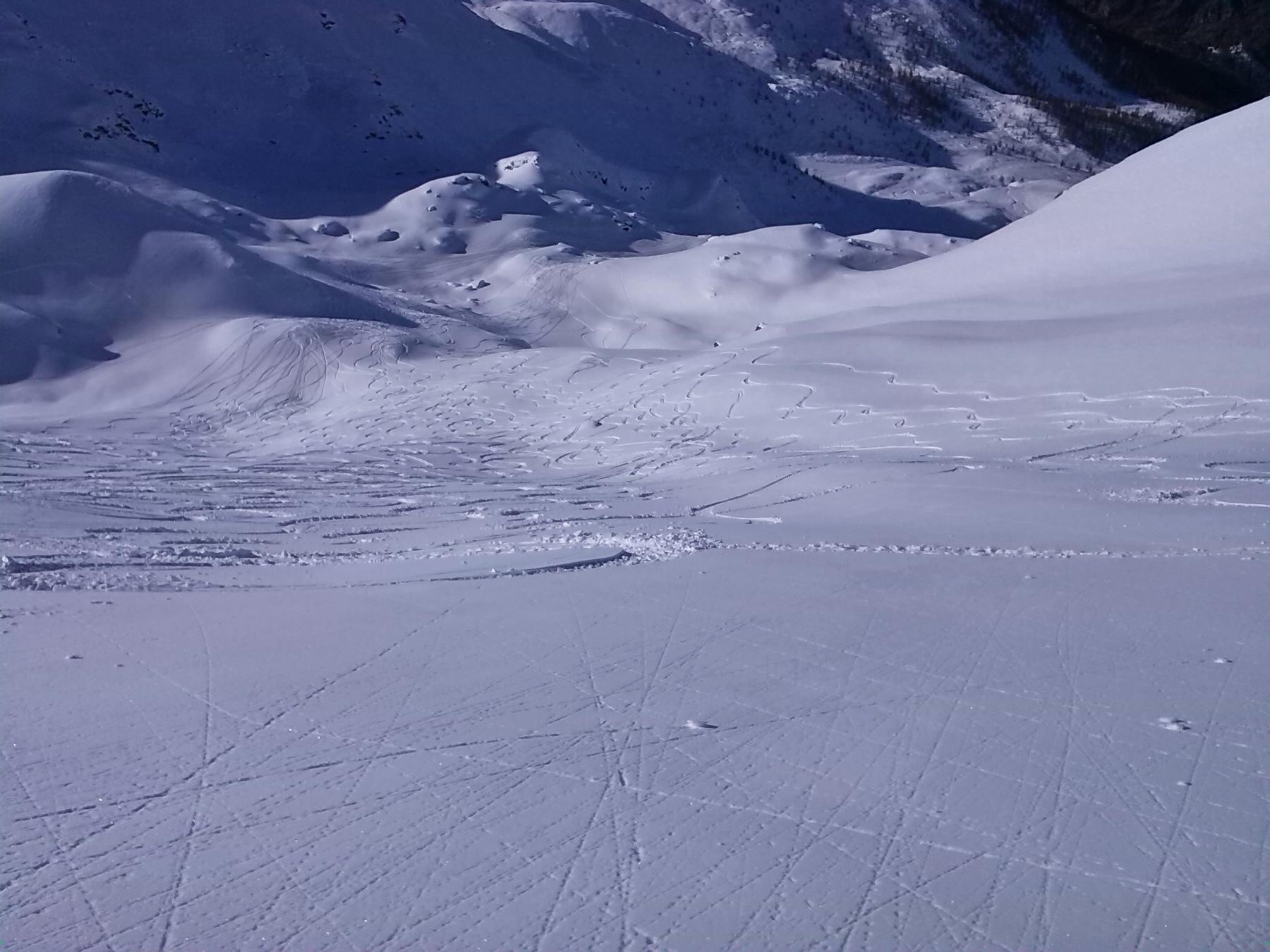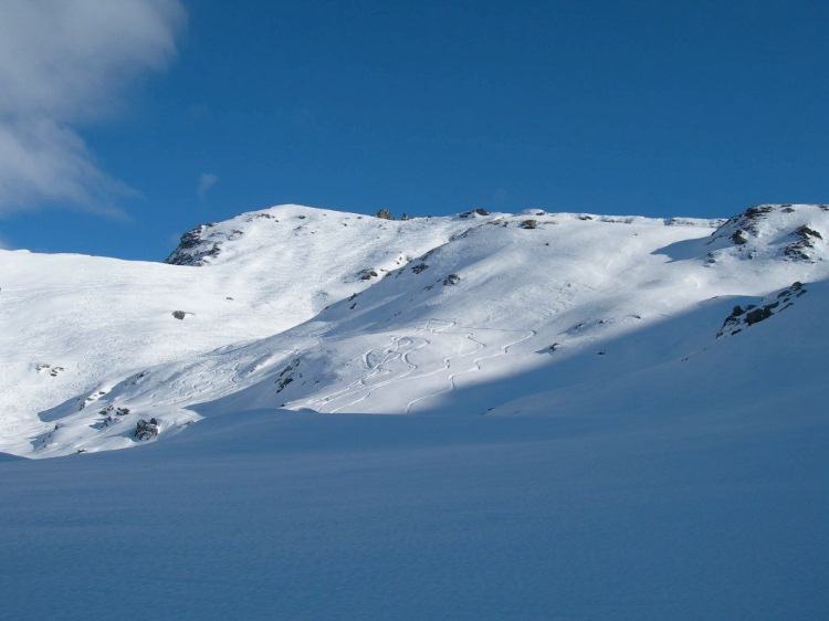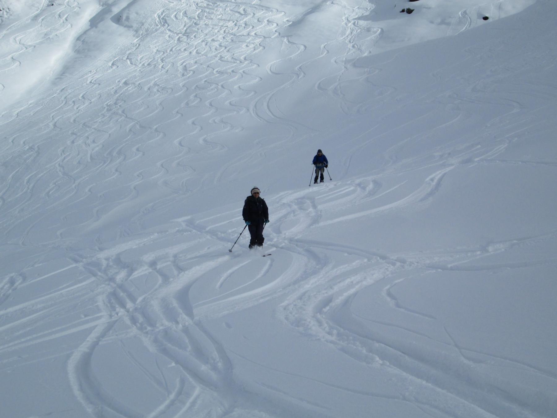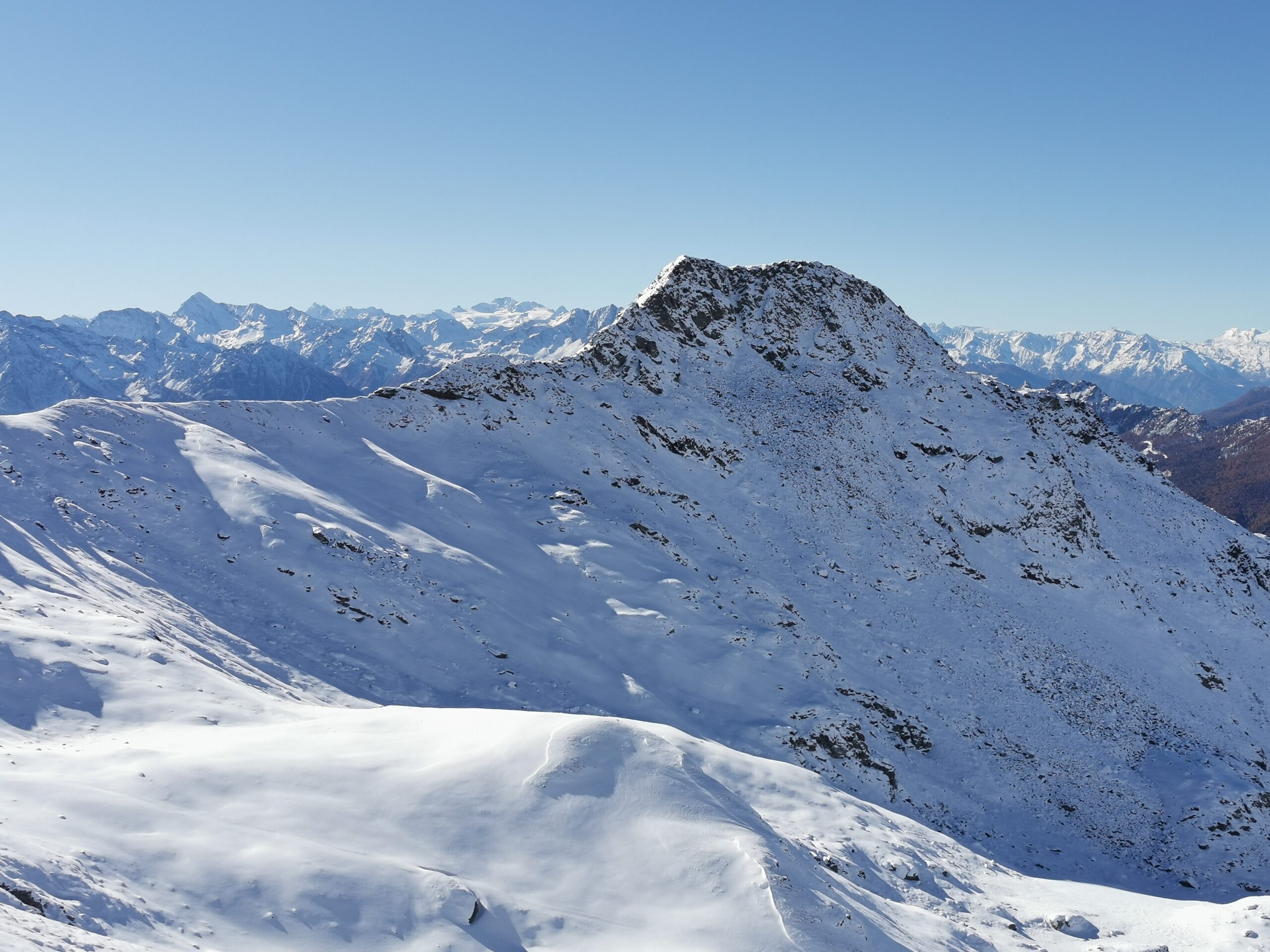 2. Risalire il ripido pendio sulla verticale della punta fino a q. 2650-2700, quindi quando il pendio diventa molto ripido deviare a destra e uscire sull’ampia spalla a 2730~.