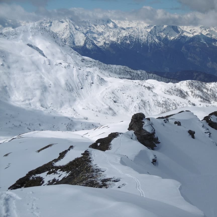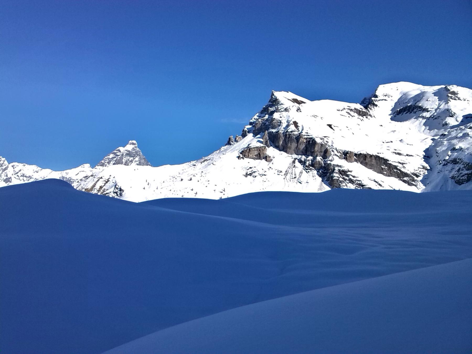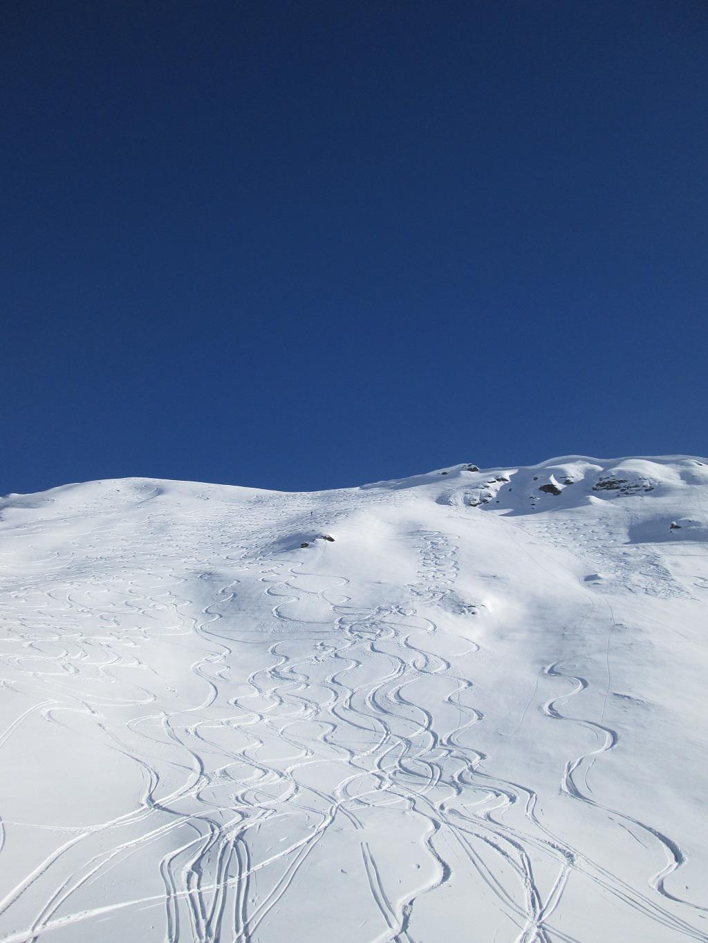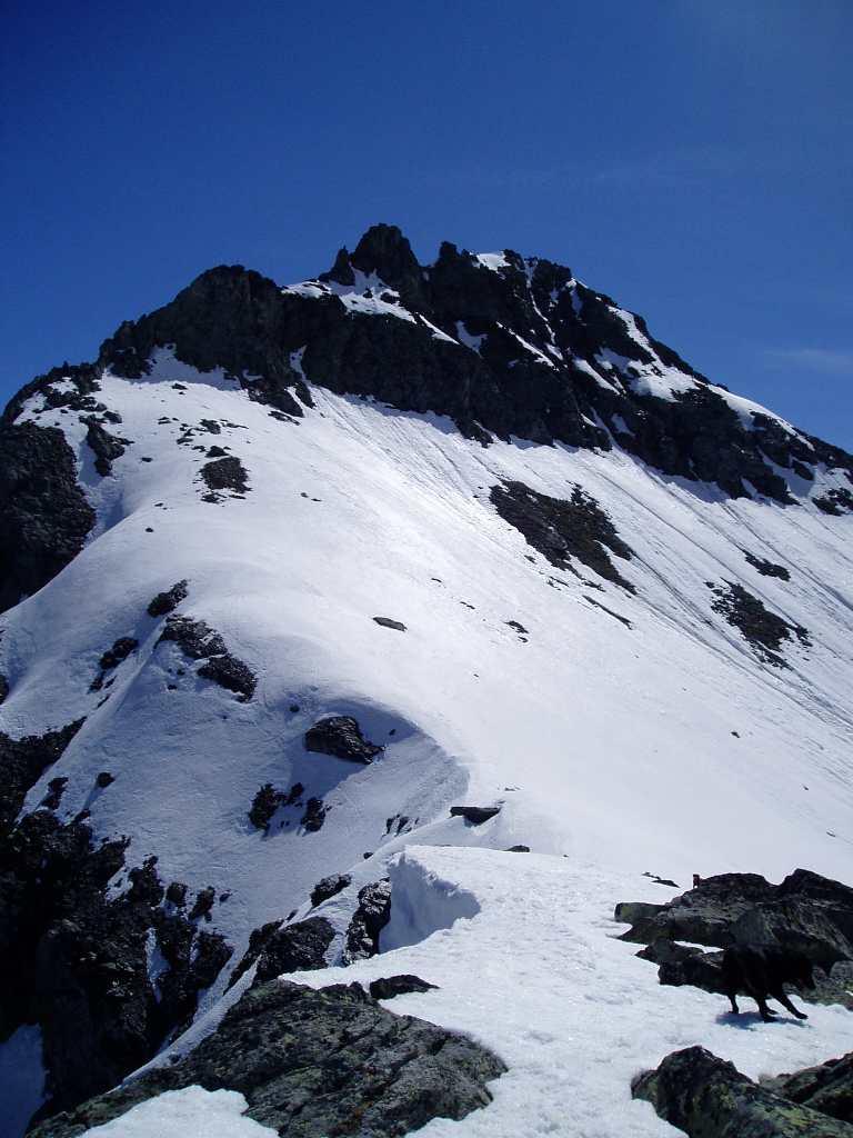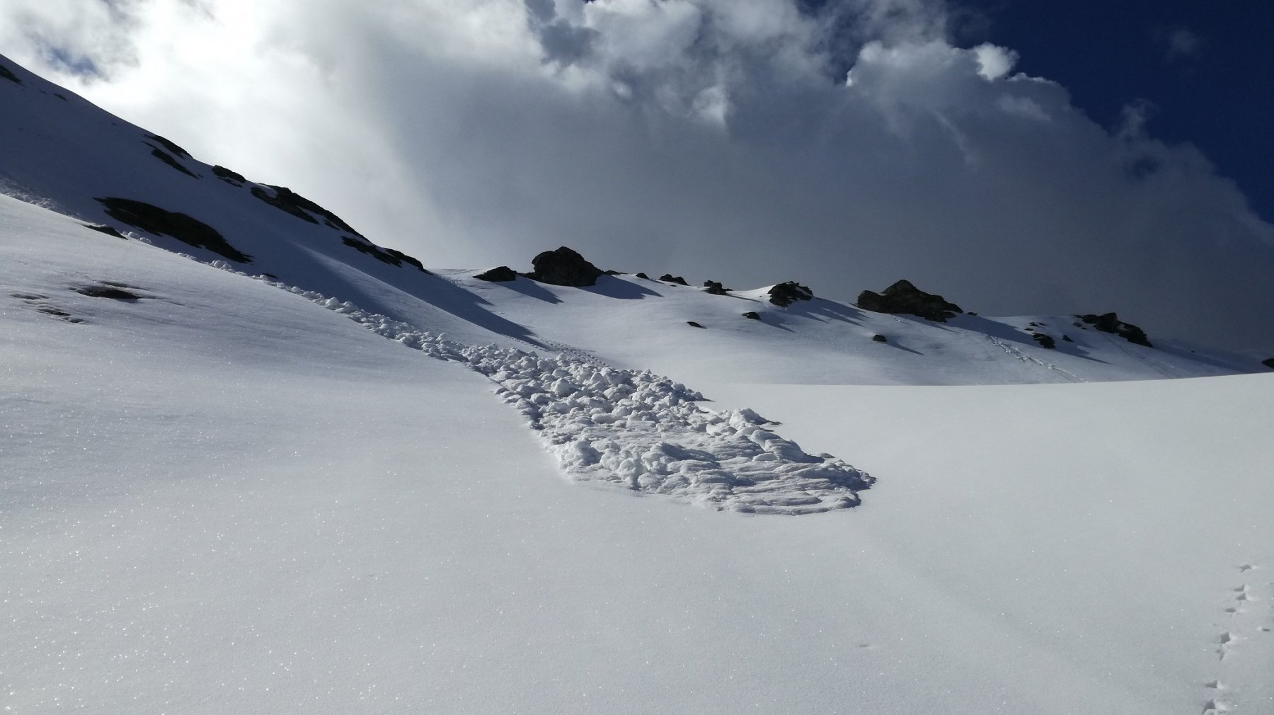 2. Risalire il ripido pendio sulla verticale della punta fino a q. 2650-2700, quindi quando il pendio diventa molto ripido deviare a destra e uscire sull’ampia spalla a 2730~.