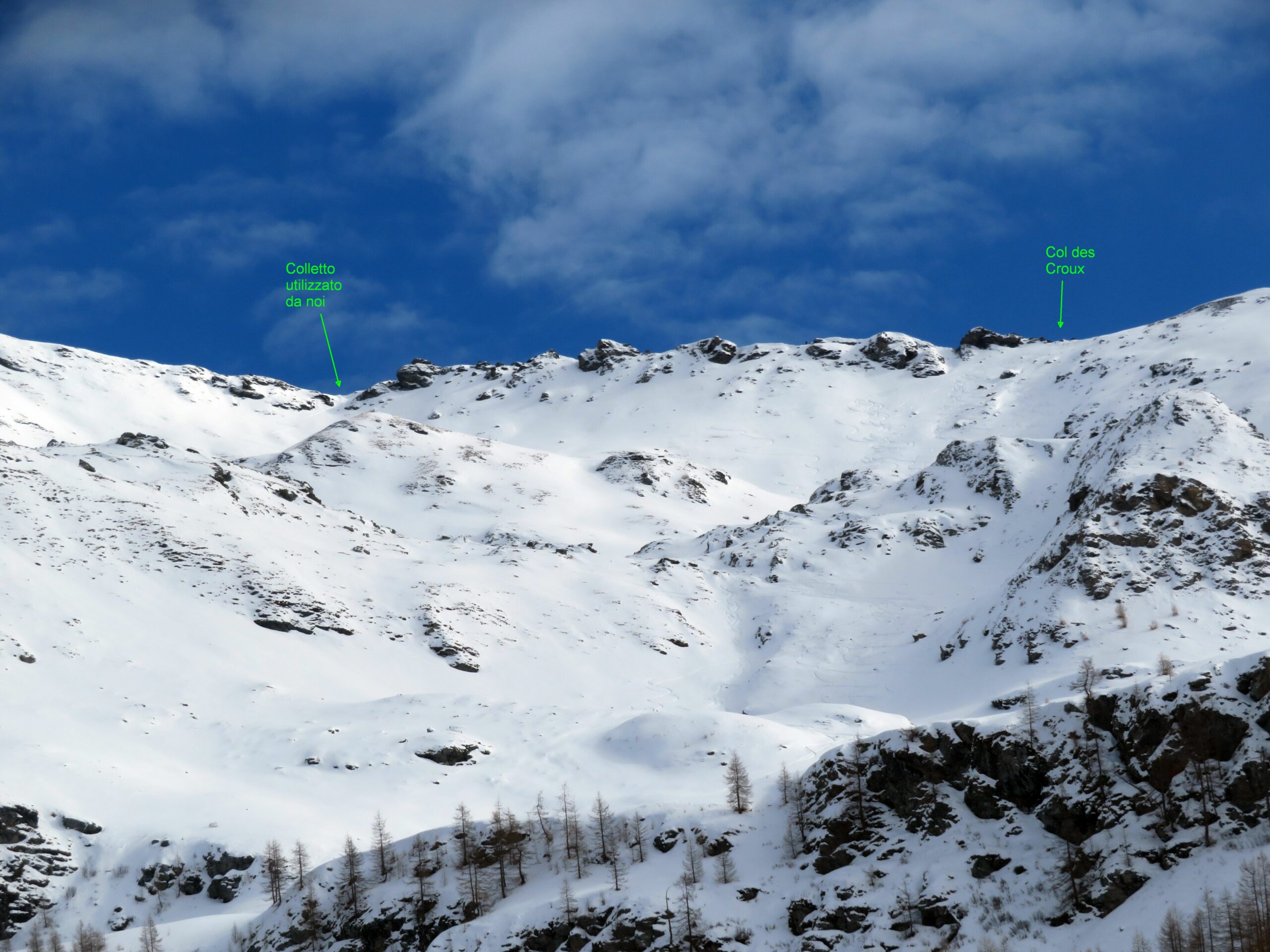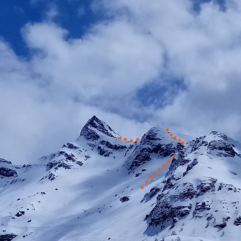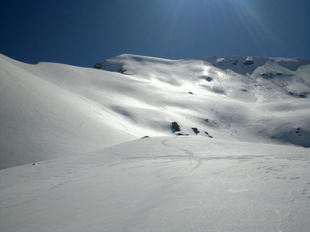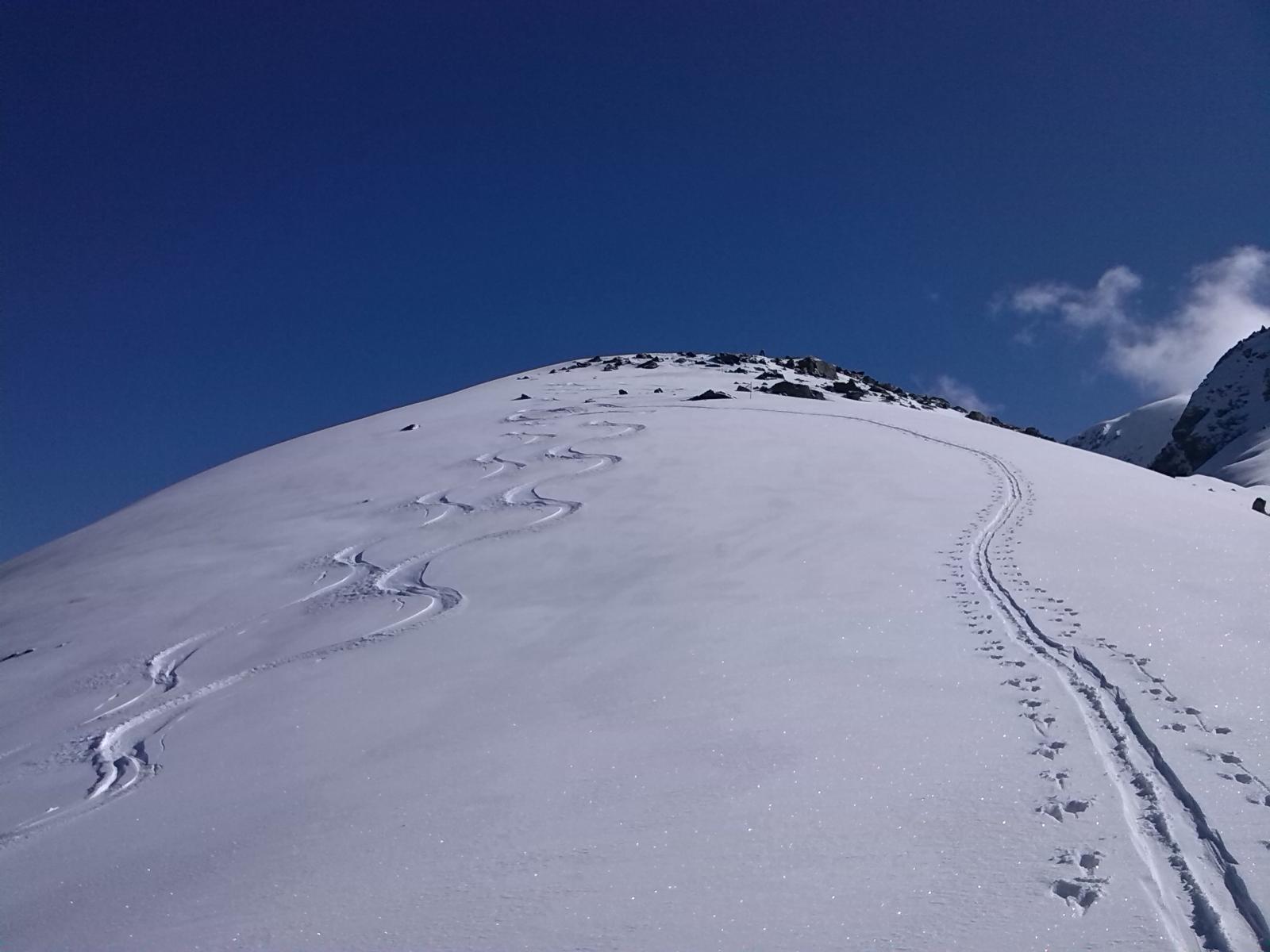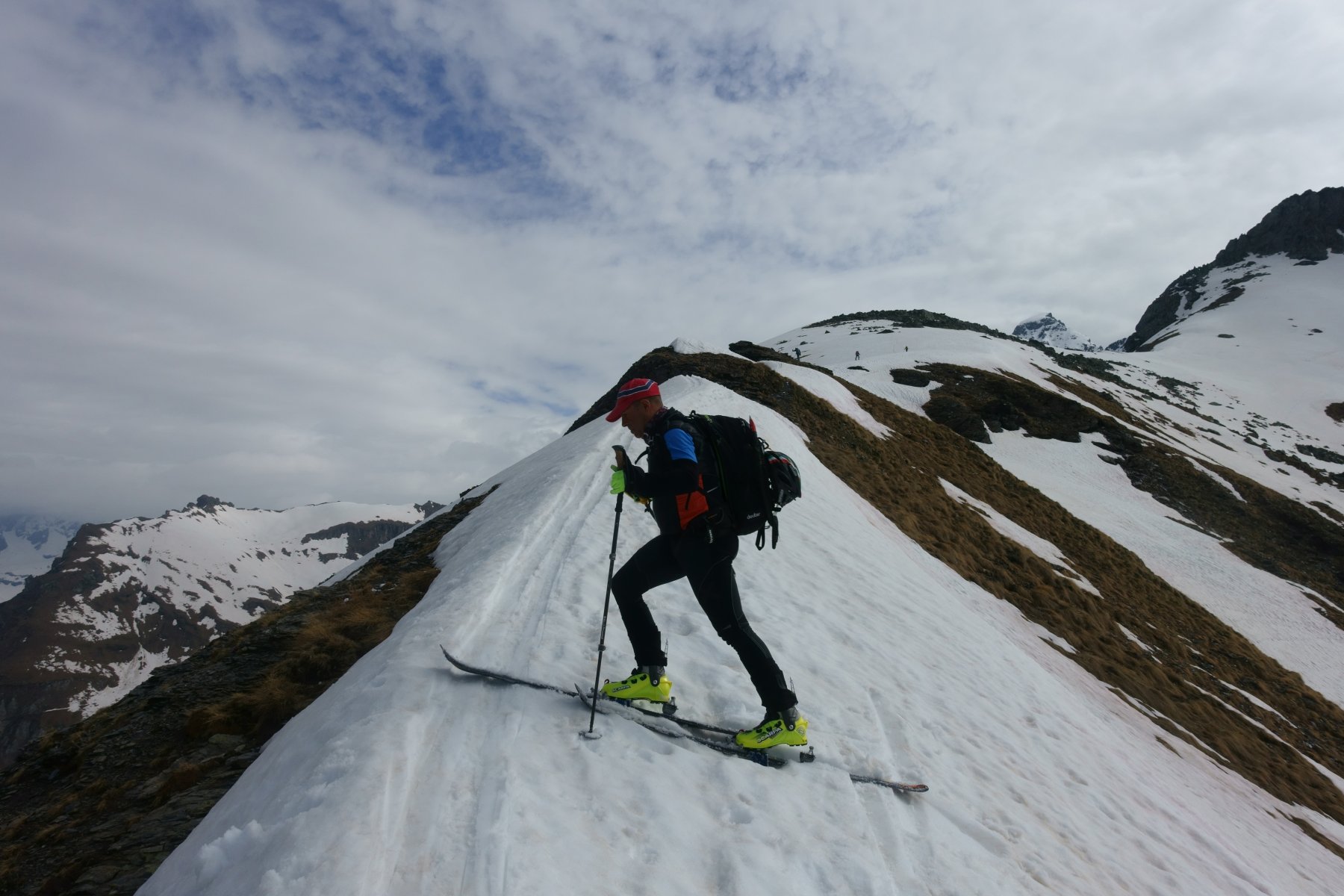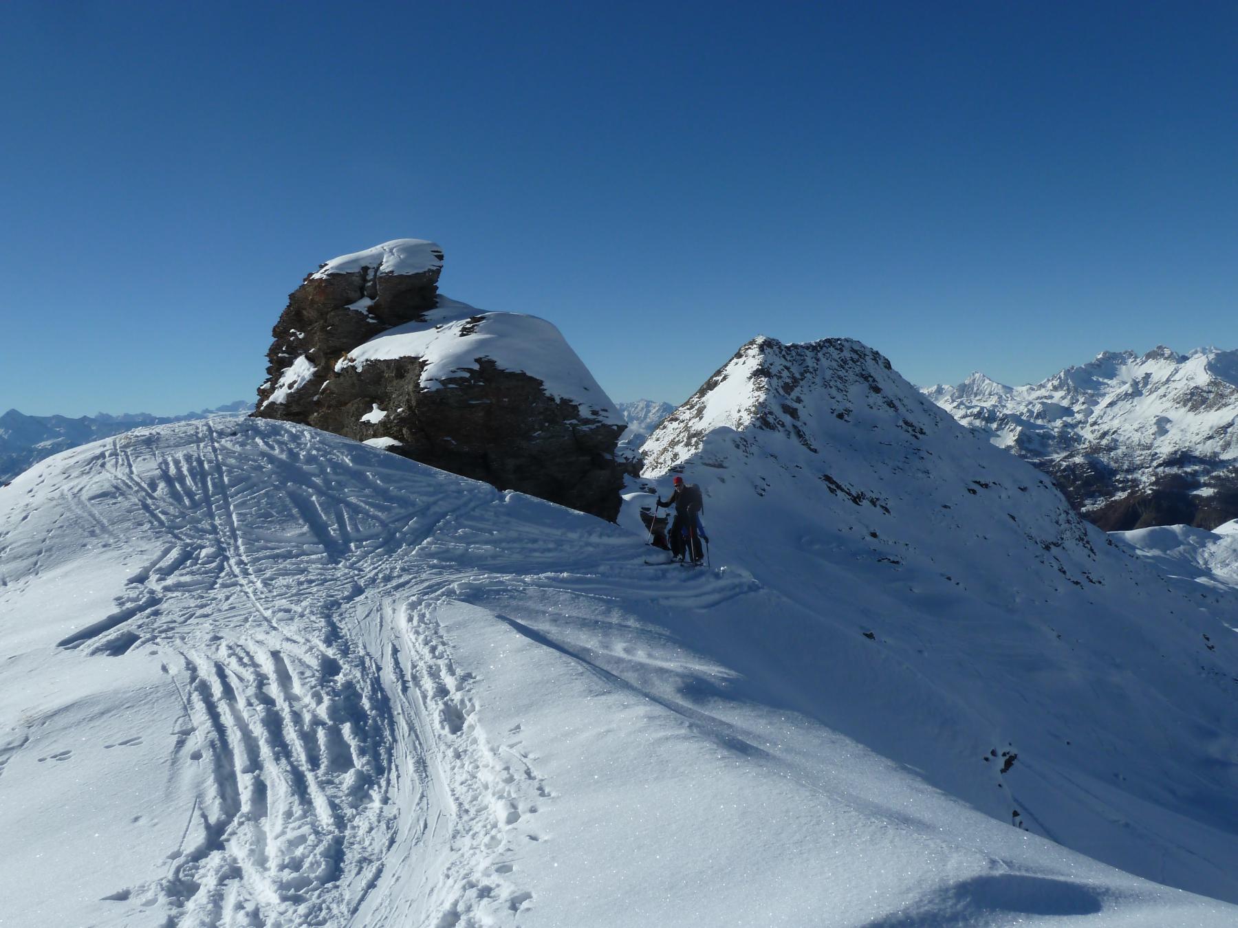 1. Salire al col di Croux ( o des Fontaines), quindi per cresta (alcuni tratti affilati) fino in punta sci ai piedi.