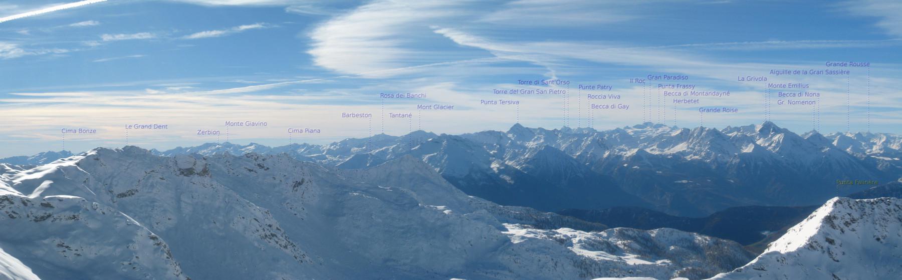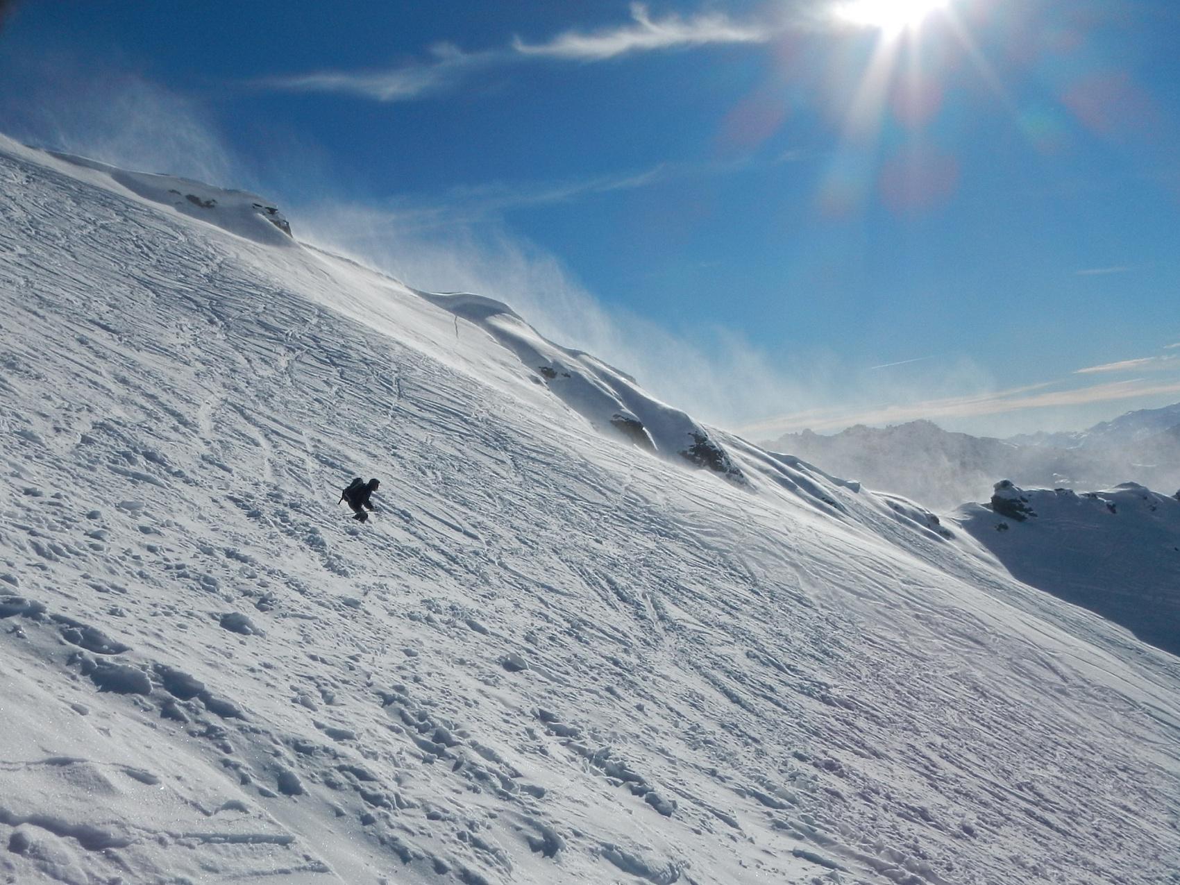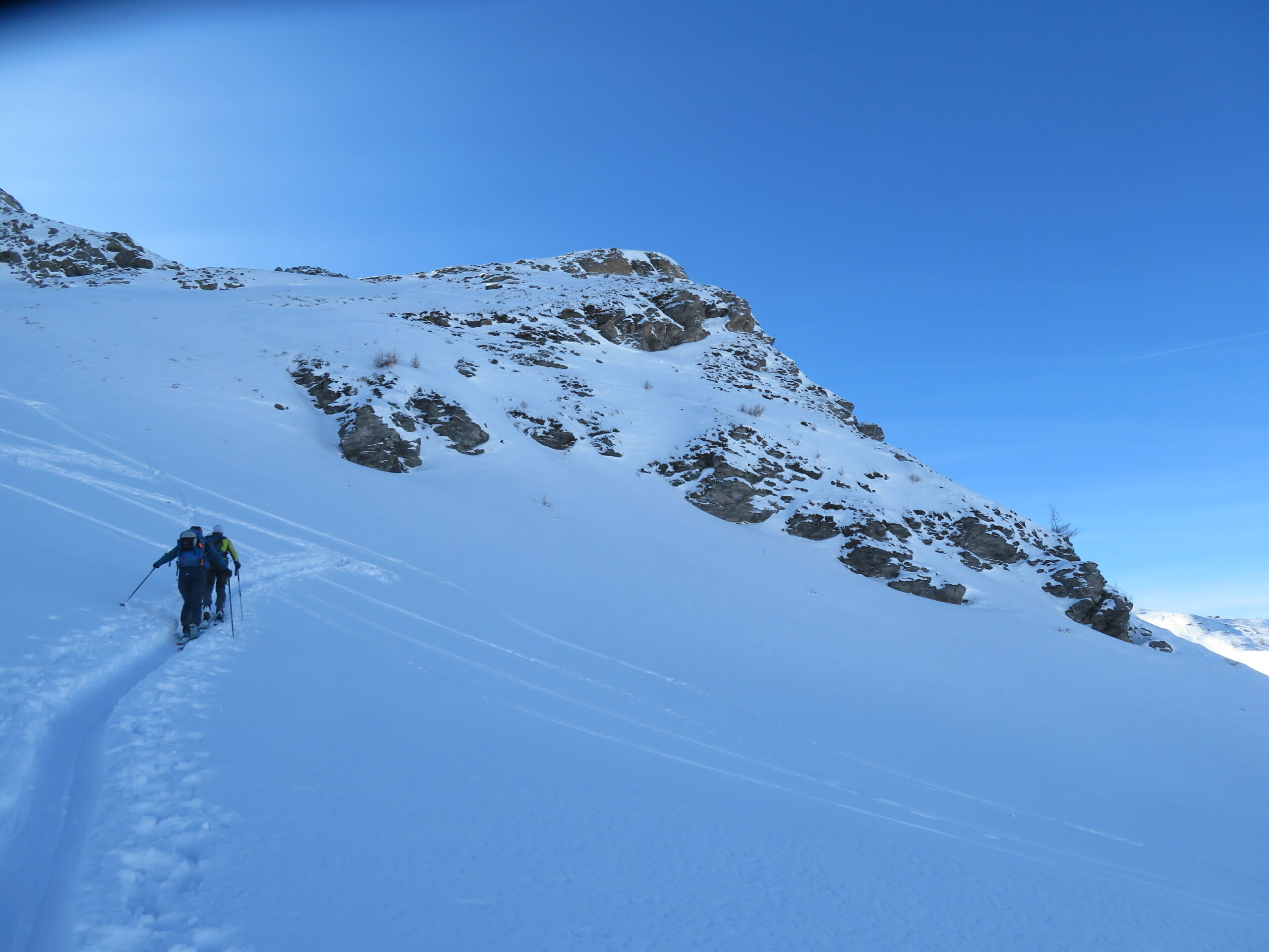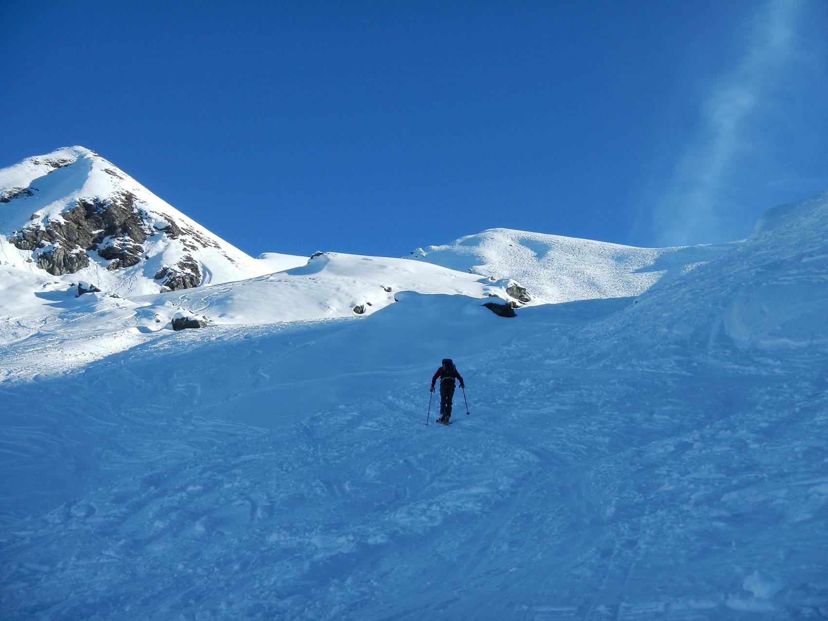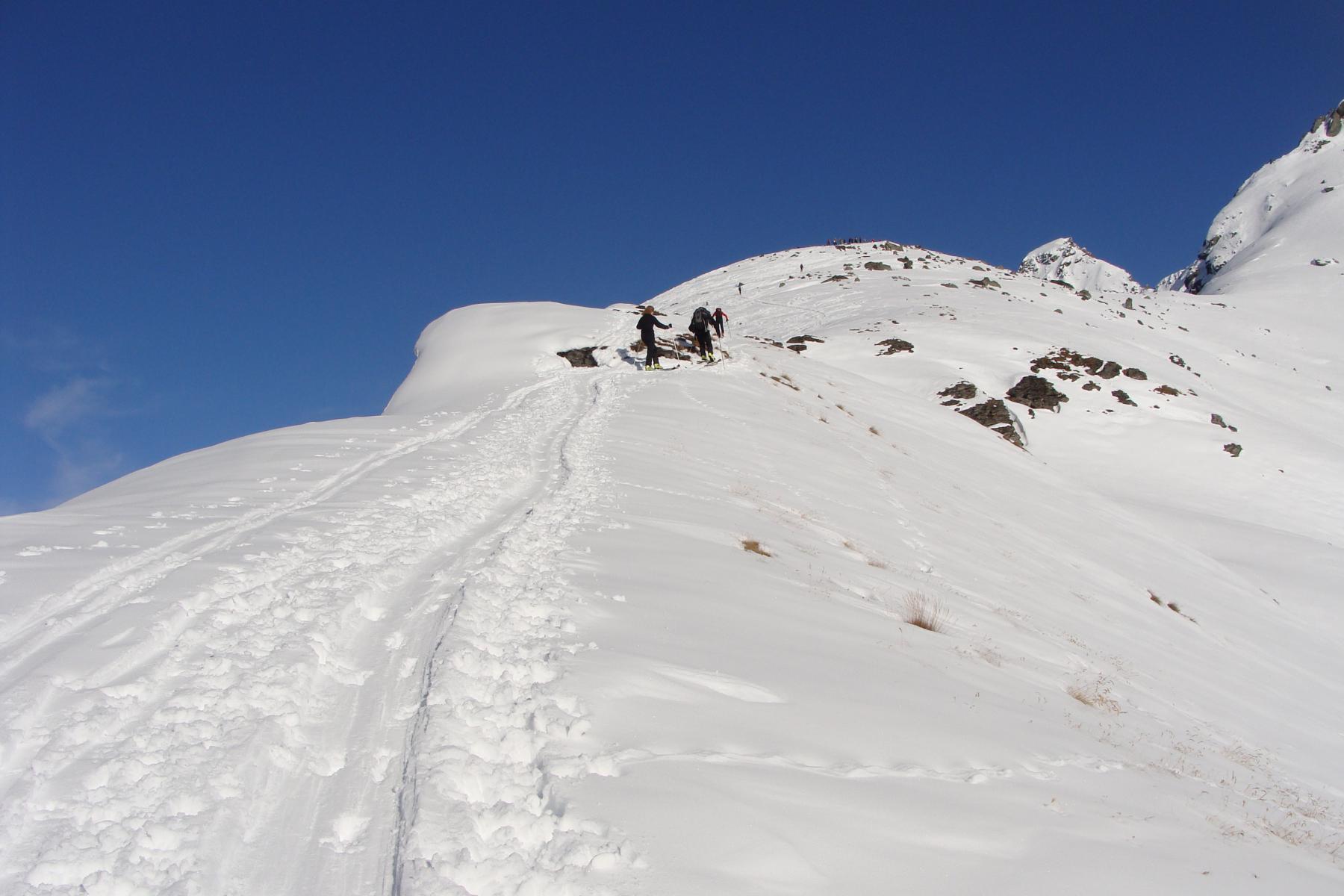 1. Salire al col di Croux ( o des Fontaines), quindi per cresta (alcuni tratti affilati) fino in punta sci ai piedi.
