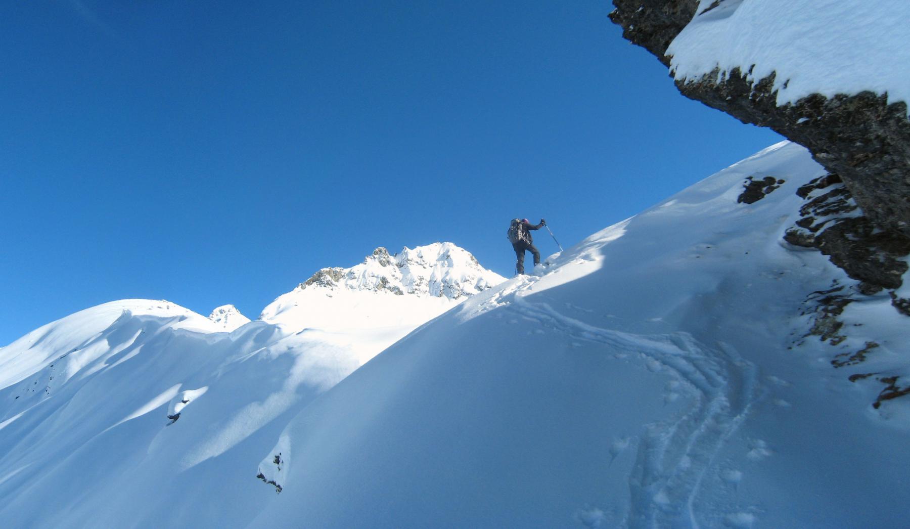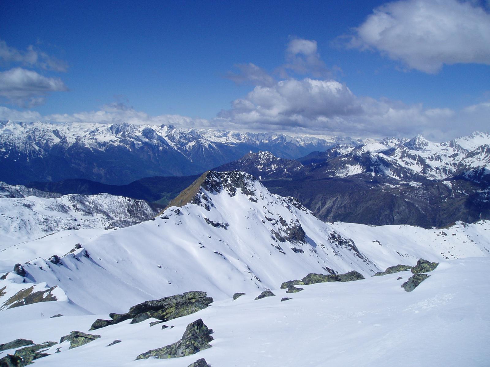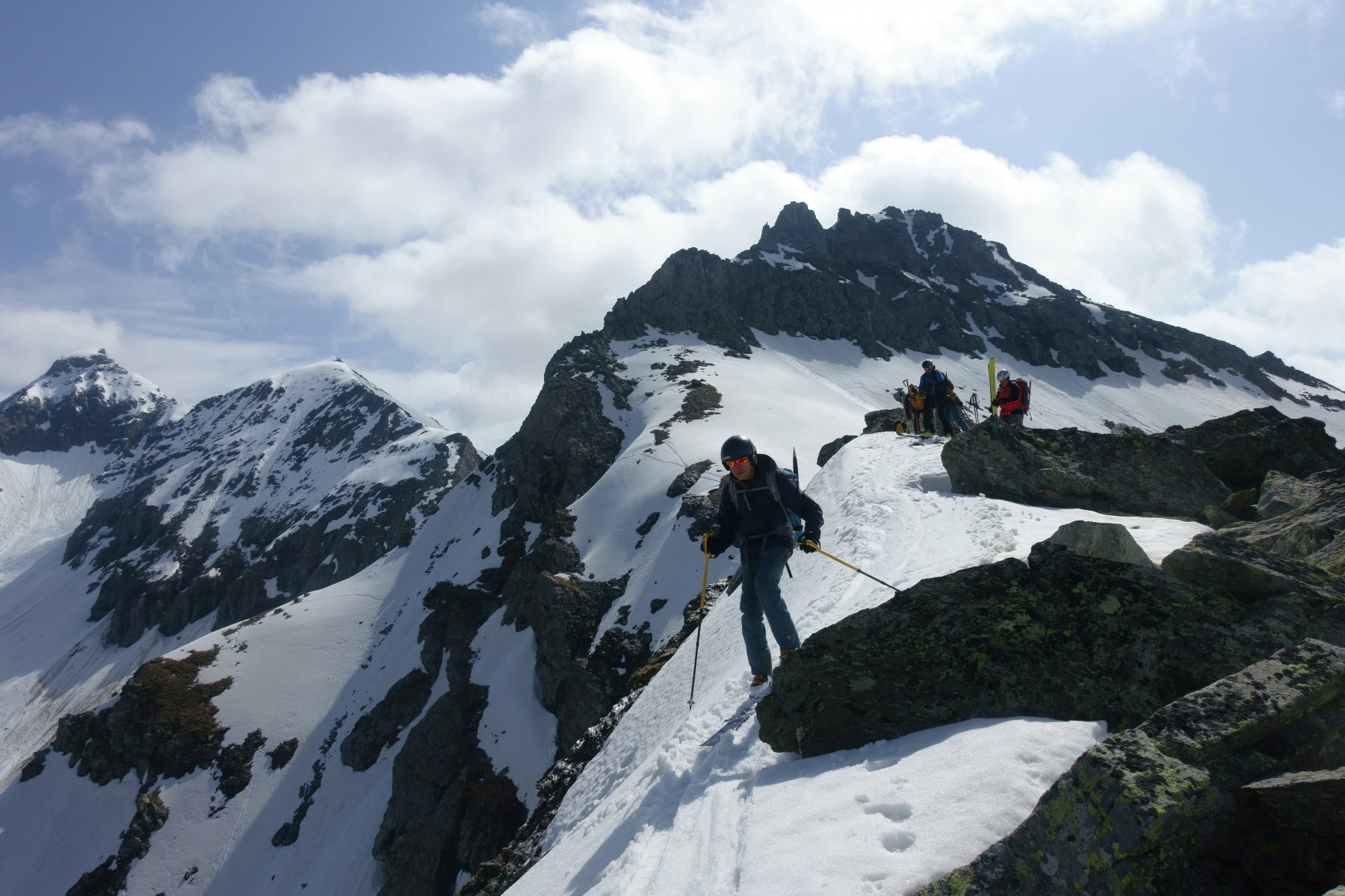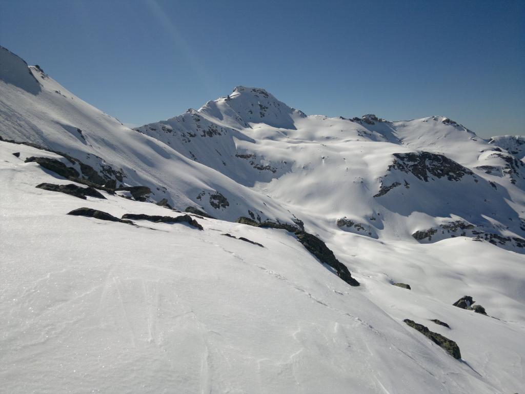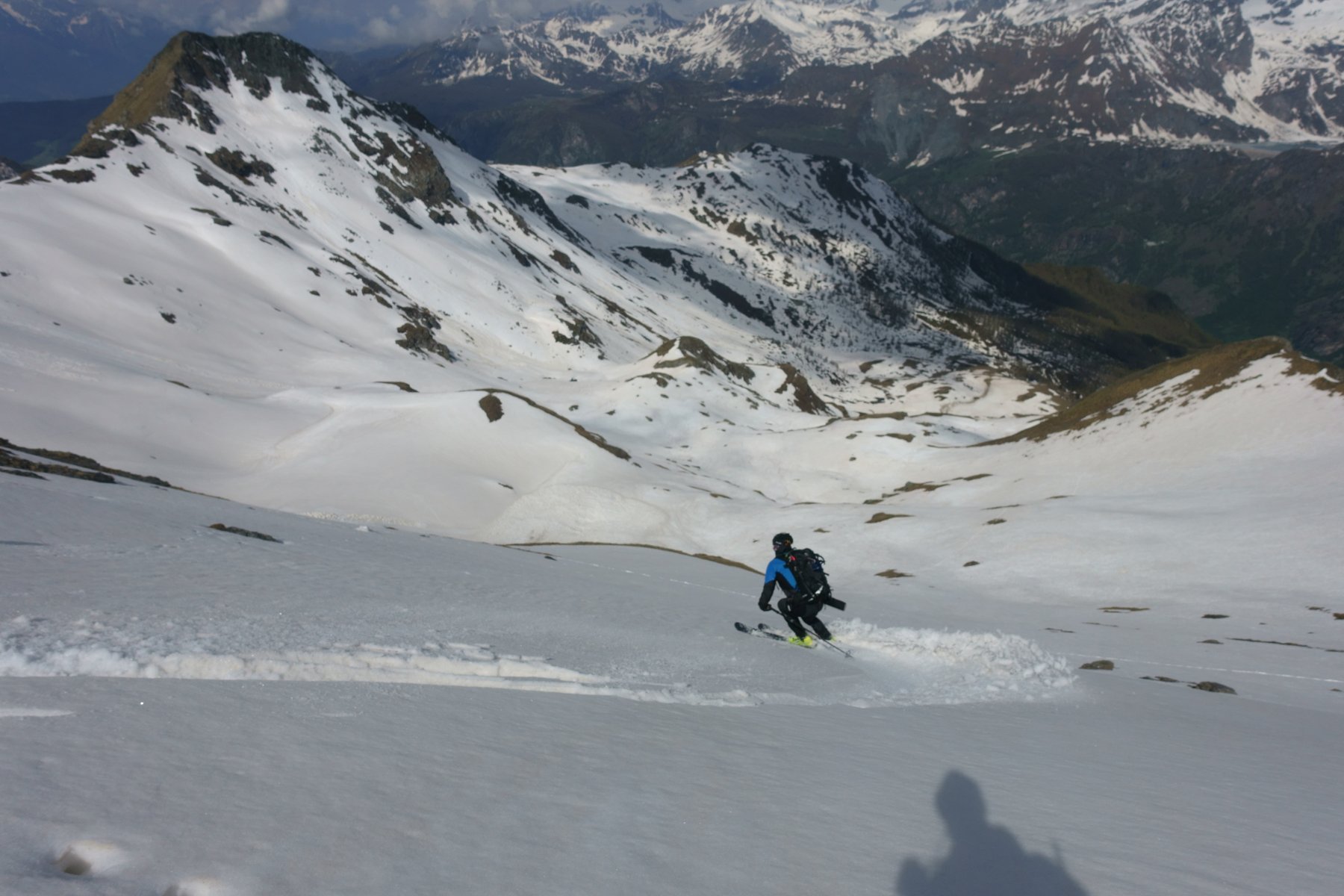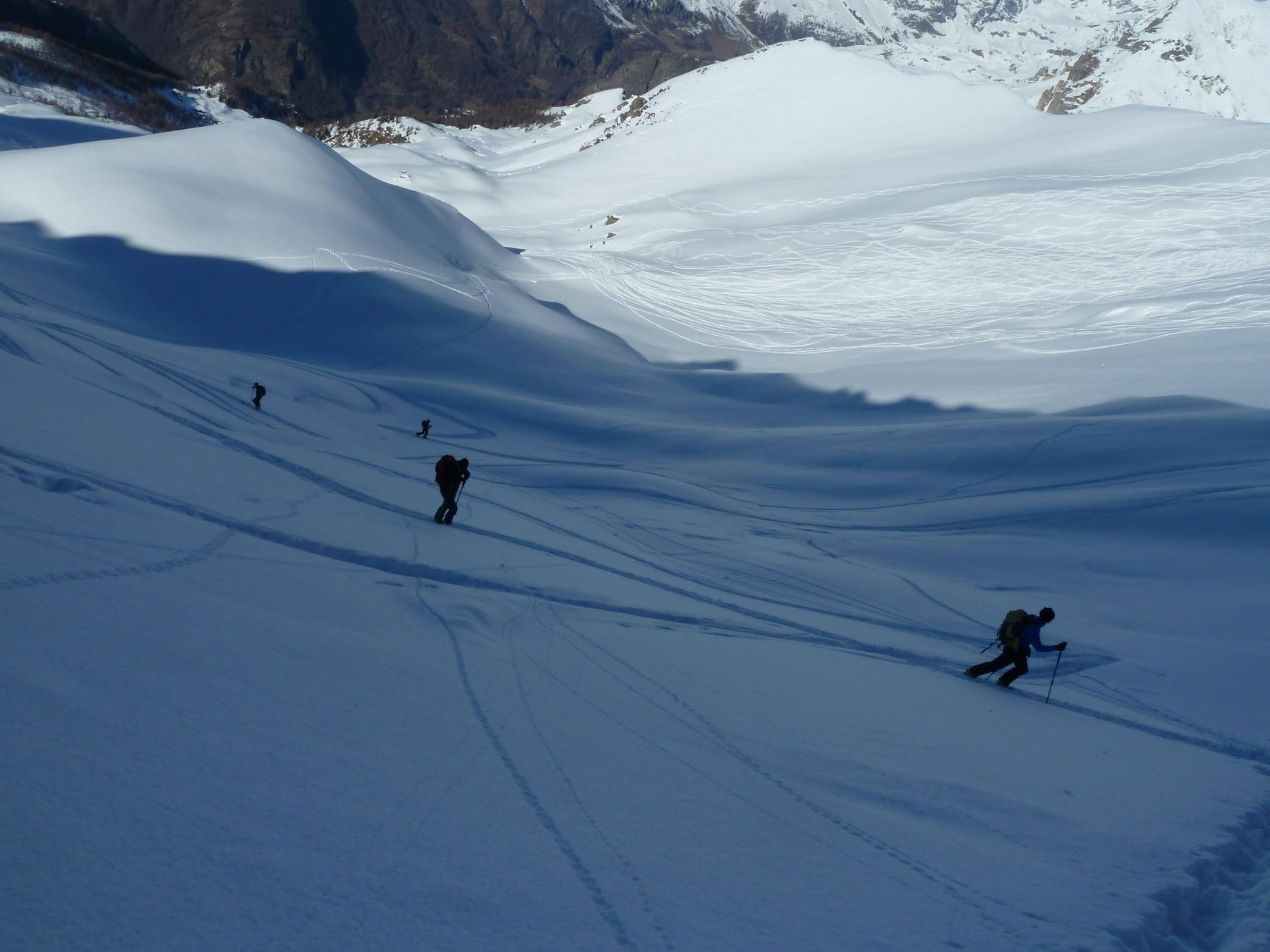 1. Salire al col di Croux ( o des Fontaines), quindi per cresta (alcuni tratti affilati) fino in punta sci ai piedi.