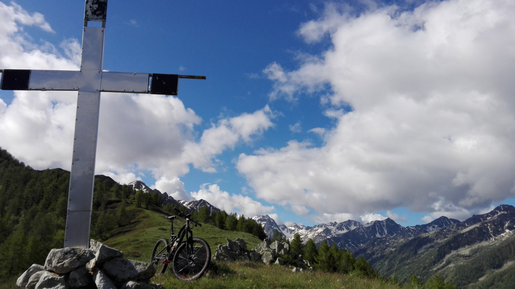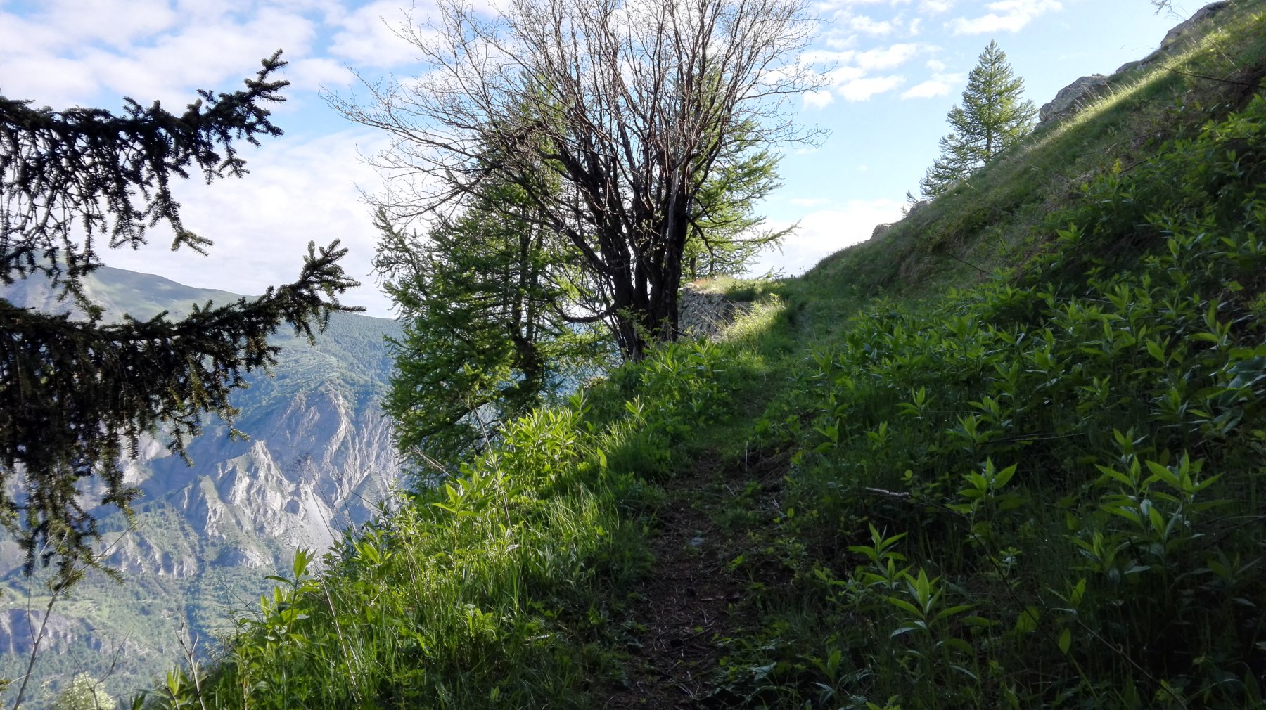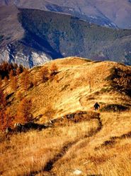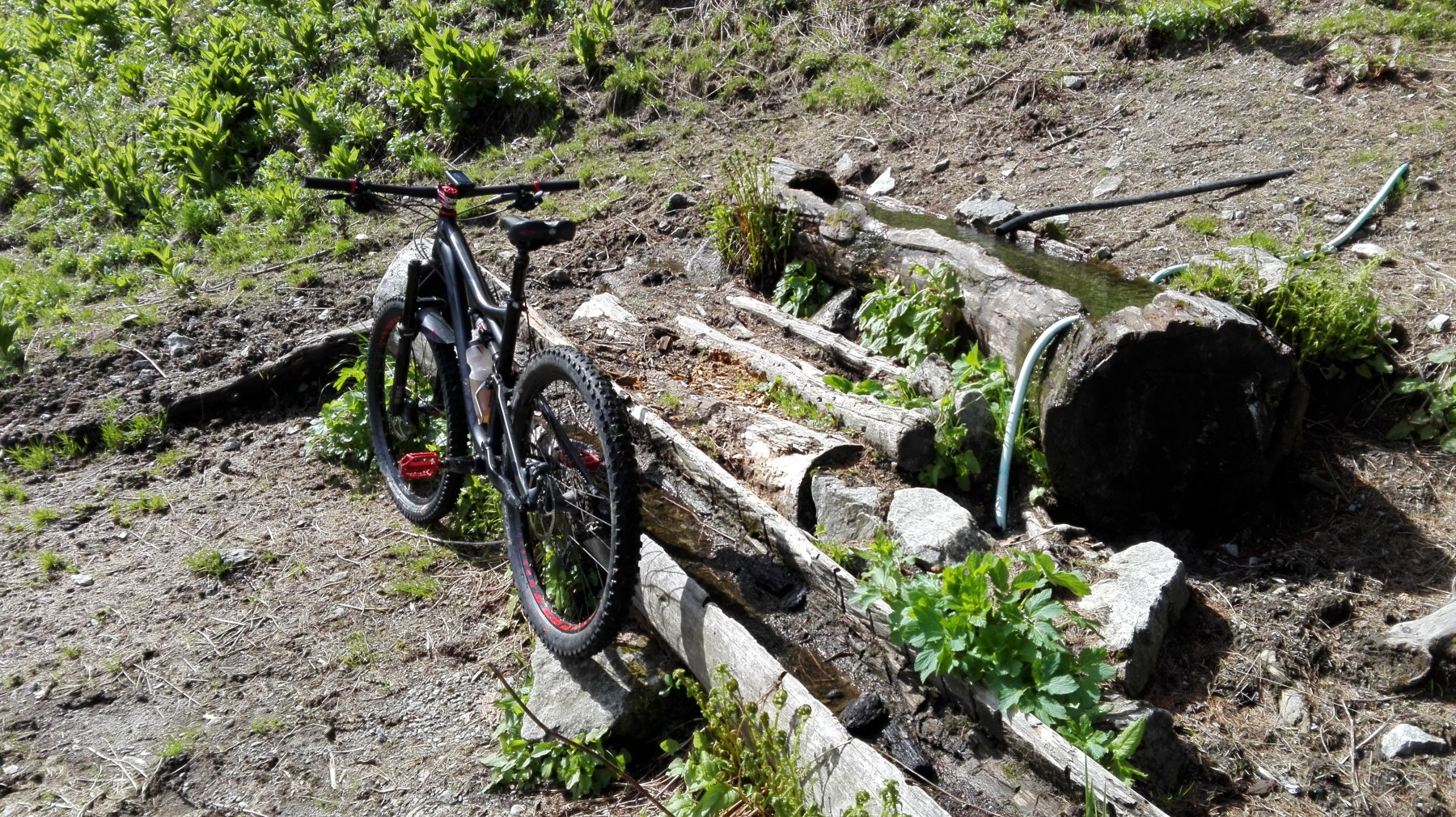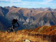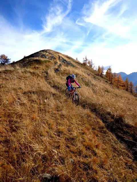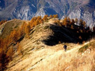 Quindi torniamo sui nostri passi scendendo il sentiero sul crinale fino a punta Crosa dove in corrispondenza della selletta, in direzione opposta a quella di salita si imbocca un esile traccia poco visibile che taglia a mezza costa il bosco di larici. Dopo i primi 100 m la tracccia risulta più marcata ma il fondo molto rovinato non permette di rimanere in sella. Si passa vicino a un abbeveratoio in legno e si prosegue sull’unico esile sentiero a mezza costa fino a guadagnare la dorsale che immette nel vallone di Palla. (fino a qui si spinge la bici) Da questo punto inizia la discesa ben evidente e bellissima da cima a fondo, ottimamente ciclabile (tranne un tornante esposto su terreno franato a circa metà percorso).