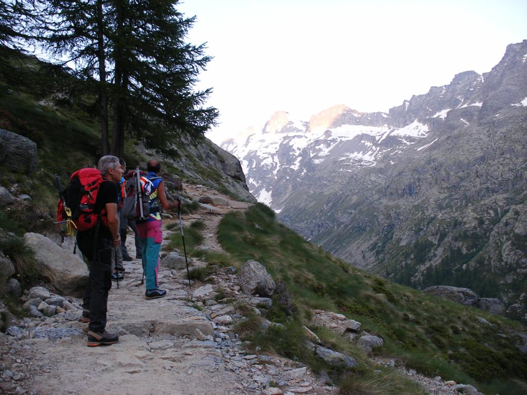 Dal parcheggio di Pont, si attraversa subito il torrente sul ponte, e si prosegue sul bel sentiero che lo costeggia, seguendo indicazioni per il Rifugio Vittorio Emanuele II. Dopo un primo tratto in piano, si inizia a salire nel lariceto sulla bellissima mulattiera lastricata, in pendenza costante. Superati i primi 300 m di dislivello si esce dal bosco, con scorci panoramici sul Vallone del Grand Etret e del Nivolet. Si prosegue lungo le serpentine, finchè il sentiero si addolcisce e si inoltra in direzione Est, superando un altopiano, finchè si giunge al Rifugio Vittorio Emanuele II 2750 m.