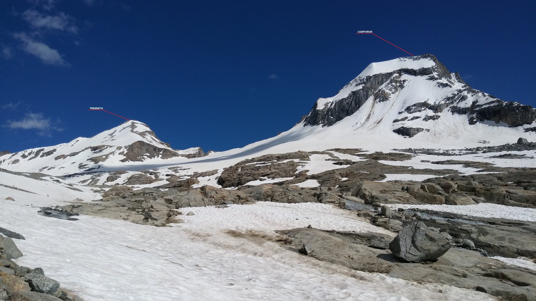 Si passa alla destra del laghetto sotto il rifugio, proseguendo in direzione della evidente cresta morenica solcata da una traccia di sentiero. La si risale con percorso un po’ ripido e faticoso, finchè questa non spiana. In presenza di innevamento sufficiente, è possibile salire per i pendii in basso a destra della morena, In entrambi i casi si raggiunge il vasto ripiano sopra la morena, con in bella evidenza la piramide della Tresenta. Si seguono i numerosi ometti (percorso comunque a piacere) e si attraversa il piano del ghiacciaio di Moncorvè (che a fine stagione si presenta spesso di ghiaccio vivo, ramponi indispensabili), in direzione del colle del Gran Paradiso, fino alla quota di 3180 m circa, dove inizia l’ascesa finale. In caso di buon innevamento si attacca il pendio alla sinistra, compiendo prima un diagonale sul versante nord-ovest, poi un secondo diagonale verso destra che consente di passare al do sopra della piccola bastionata rocciosa che sorregge il primo pendio giungendo ad un piccolo ripiano. A fine stagione senza neve, è invece preferibile spostarsi a destra verso il Colle di Moncorvè, per poi risalire a sinistra il primo tratto di pendio sul versante ovest, risalendo con fatica e cautela la fascia di grossi massi instabili, guadagnando il ripiano. Qui si prosegue verso destra, ancora in traverso, sino a raggiungere una dorsale, che si scavalca (abbastanza ripido con neve) entrando così in una valletta più dolce, compresa tra la spalla e il crestone ovest che scende direttamente dalla cima. Su traccia di sentiero o nevai, si raggiunge l’ampia cresta ovest, dalla quale senza più possibilità di errore si giunge in cima, o seguendo le evidenti tracce di sentiero (sempre prestando attenzione a non smuovere le pietre talvolta di grosse dimensioni, quasi sempre instabili), oppure salendo su neve mantenendosi o sul filo della dorsale o sul pendio di destra. Si raggiunge la cresta sud pochi metri prima della croce di vetta della Tresenta, che si raggiunge senza difficoltà ulteriori.