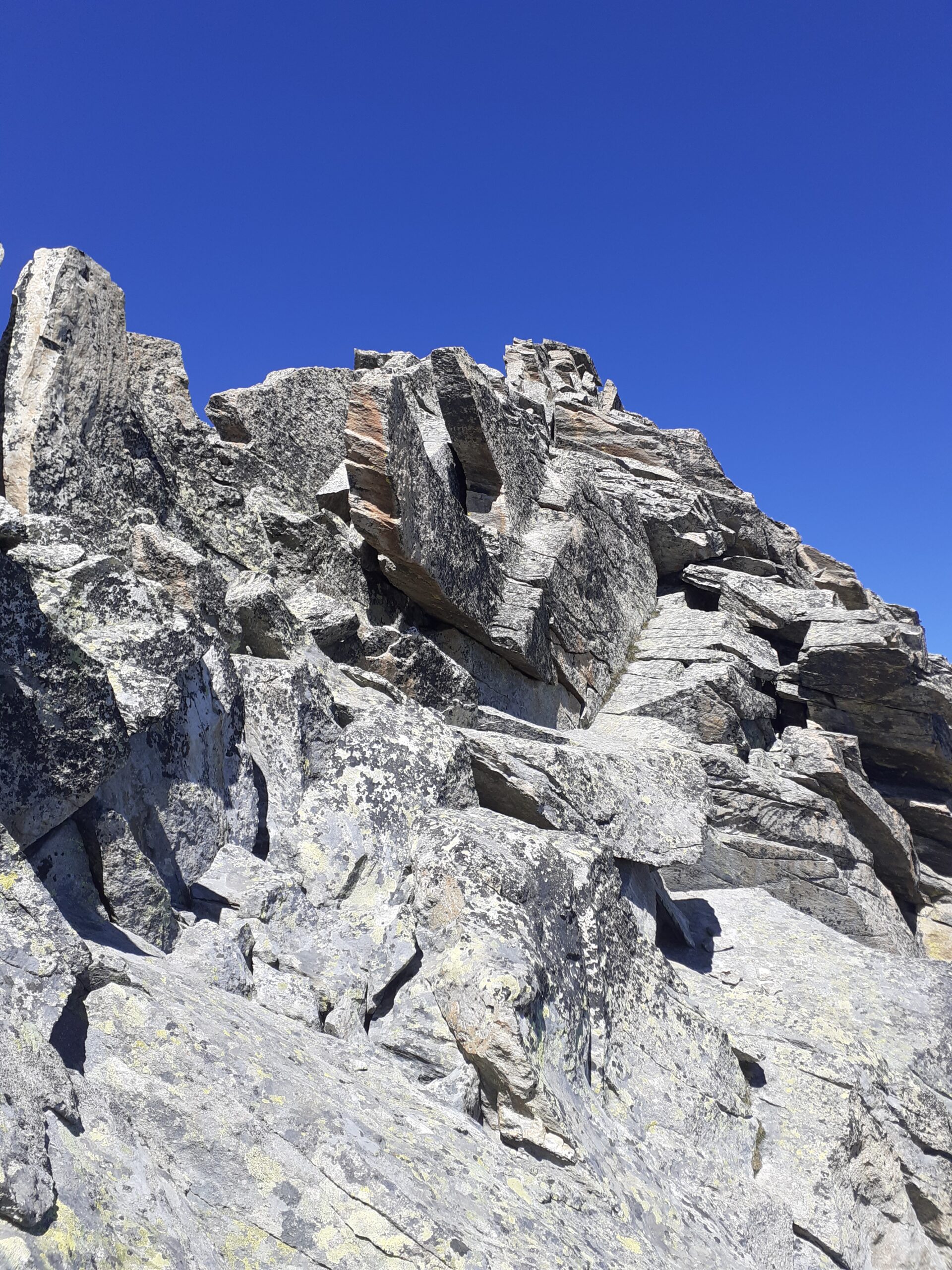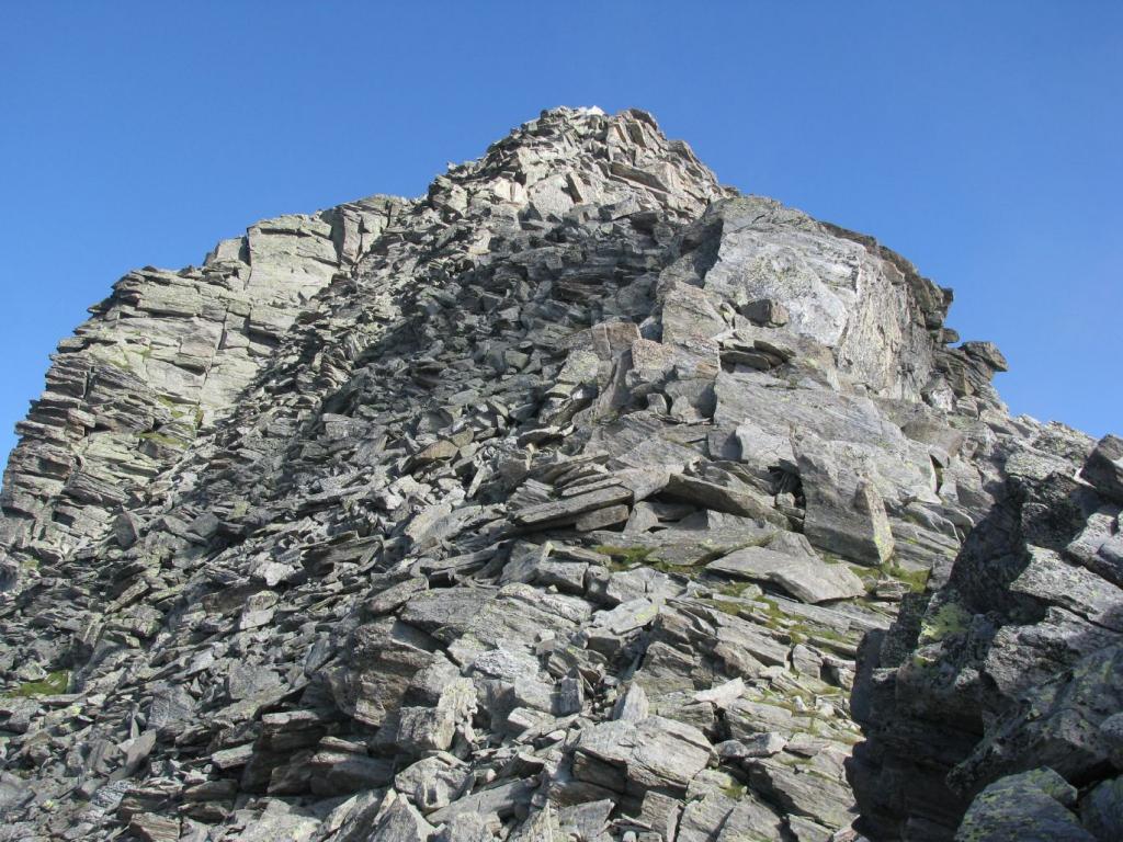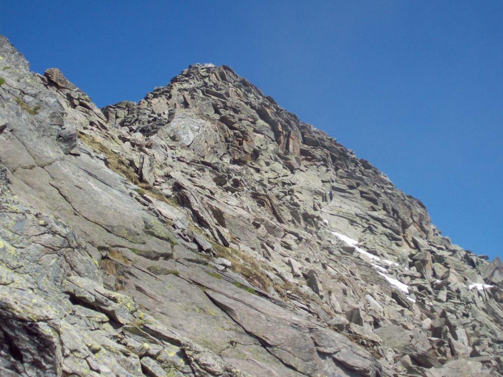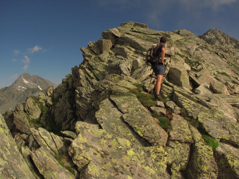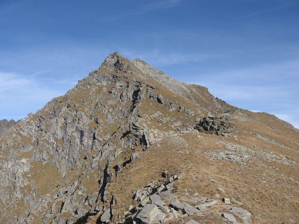 Dall’intaglio salire la ripida cresta di erba olina fino ad incontrare i primi spuntoni rocciosi, piegare su versante Campiglia e risalire su terreno prima misto erba-roccette-sfasciumi e poi cresta a blocchi fino in vetta.