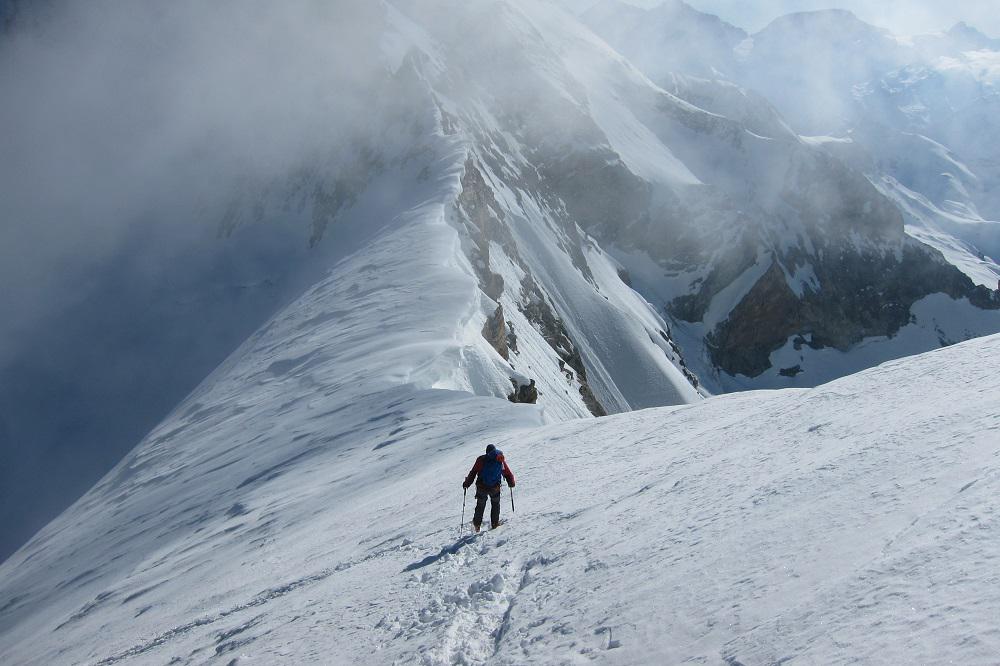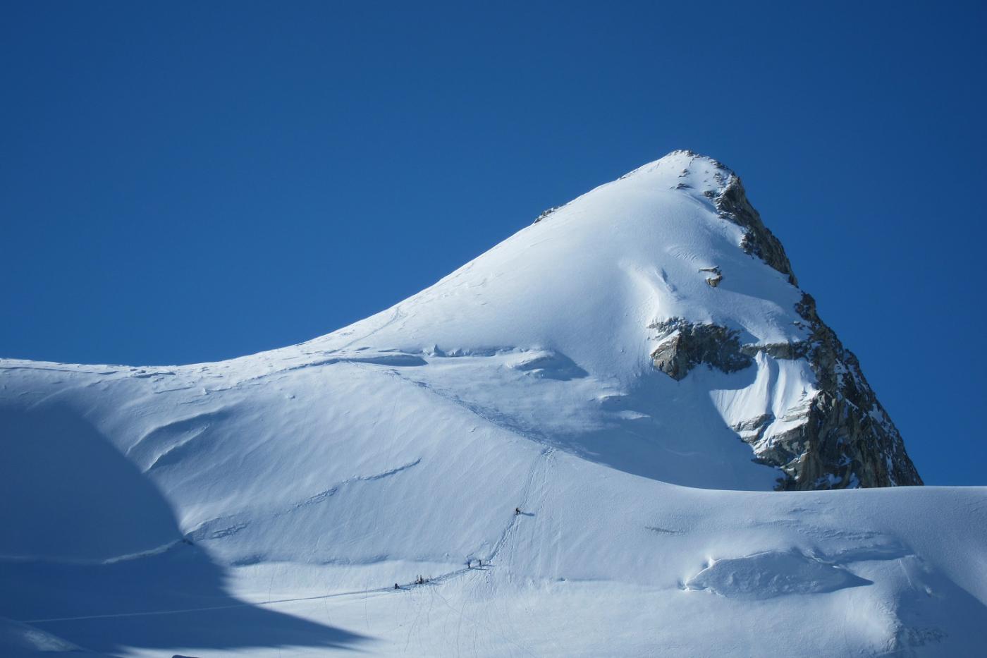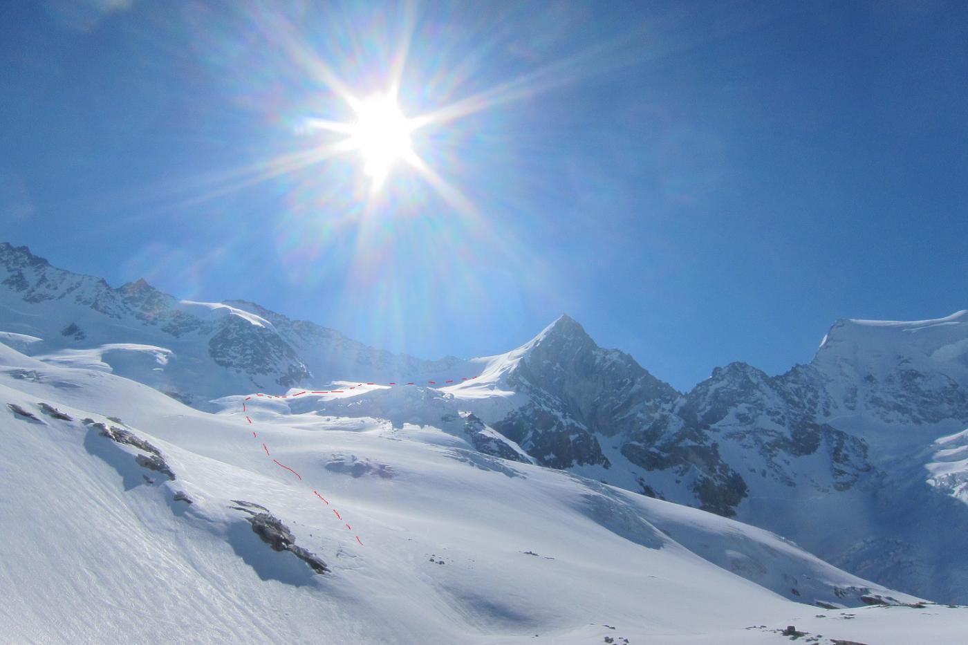 Dalla Caban du Mountet salire leggermente a destra ed in diagonale risalire il ghiacciaio con percorso evidente ed obbligatorio sotto la grande seraccata. Abbandonati gli sci alla crepaccia terminale (3580 m) si sale il ripido pendio iniziale poi facilmente in vetta per cresta. Gran panorama dalla vetta. Discesa per lo stesso percorso.