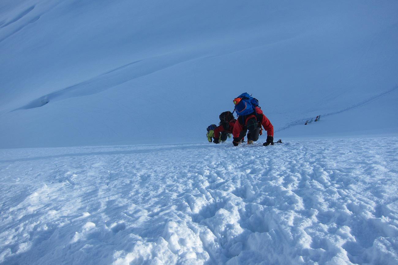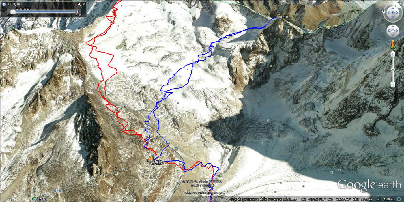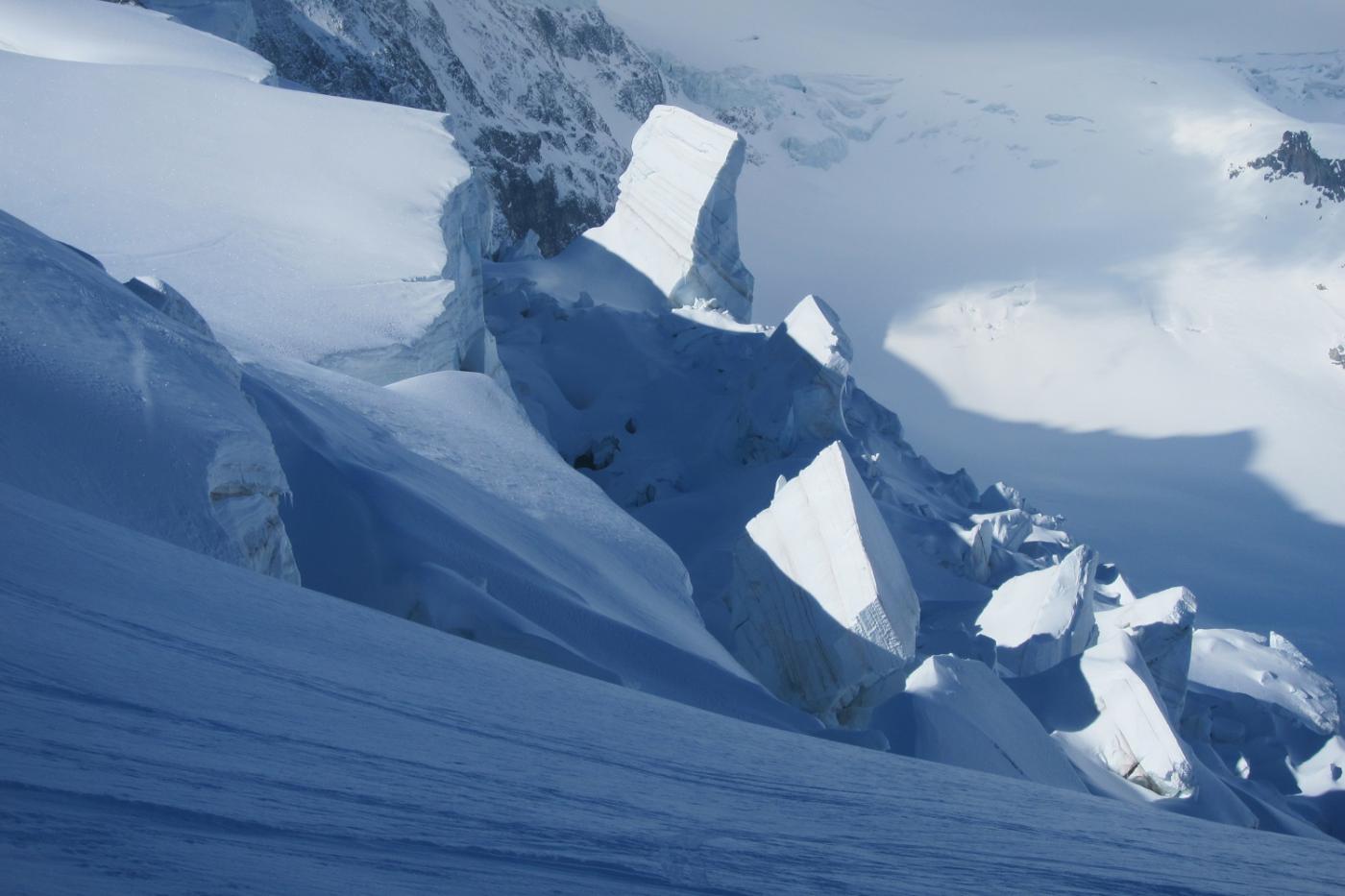 Dalla Caban du Mountet salire leggermente a destra ed in diagonale risalire il ghiacciaio con percorso evidente ed obbligatorio sotto la grande seraccata. Abbandonati gli sci alla crepaccia terminale (3580 m) si sale il ripido pendio iniziale poi facilmente in vetta per cresta. Gran panorama dalla vetta. Discesa per lo stesso percorso.