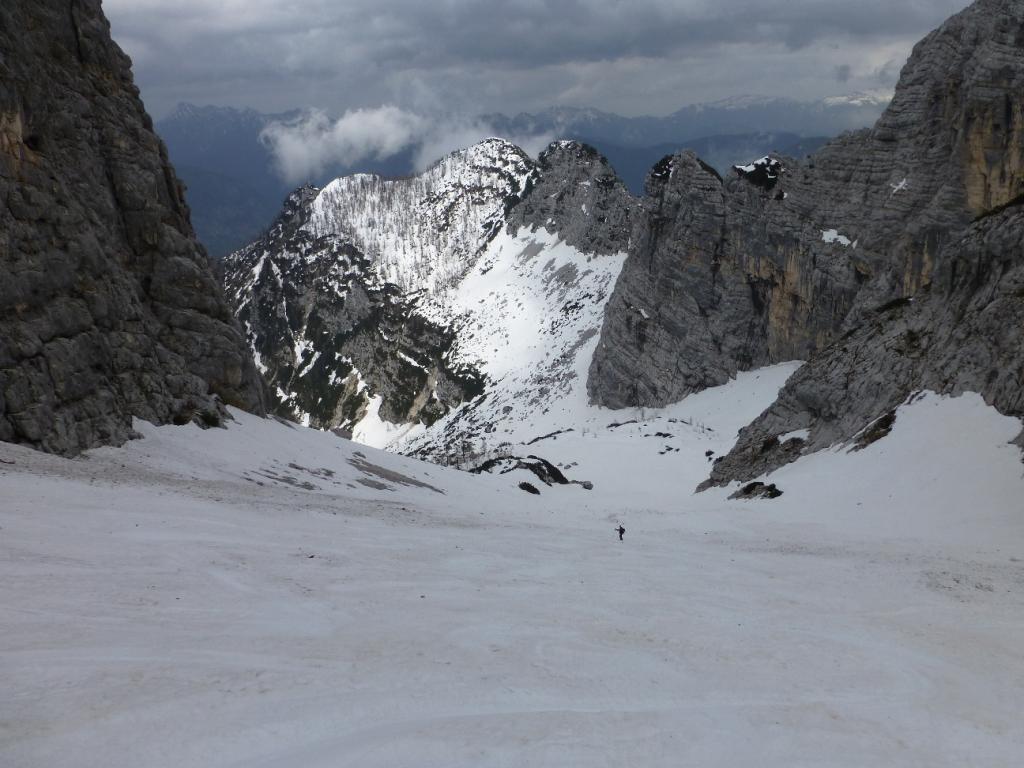 Dopo 200 m di dislivello, si arriva alla base del vallone Za Cmiram, che si risale su tre spezzoni di canalone ripidi e continui.