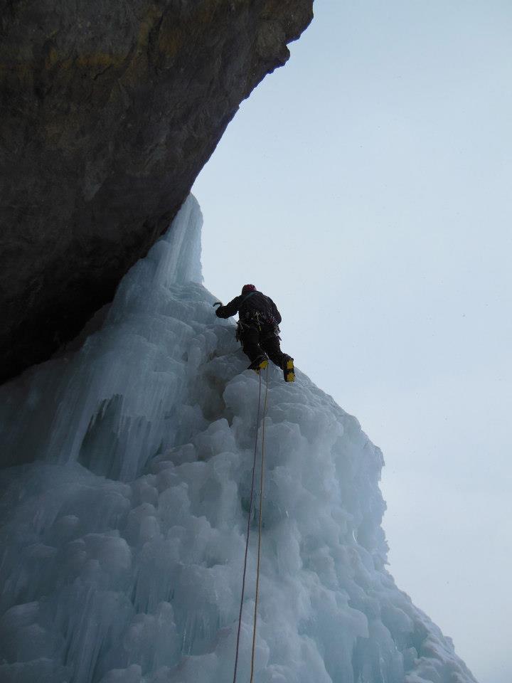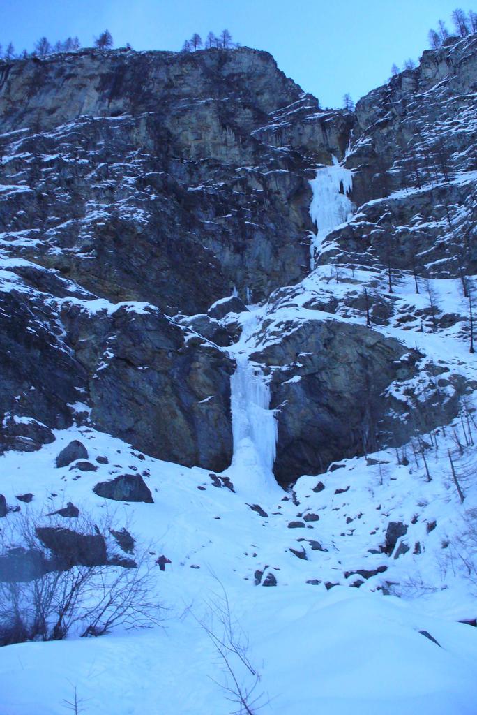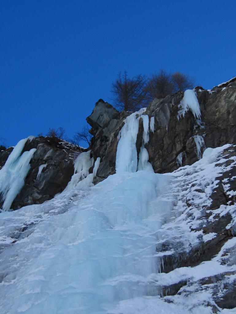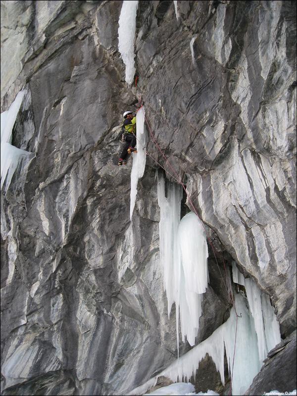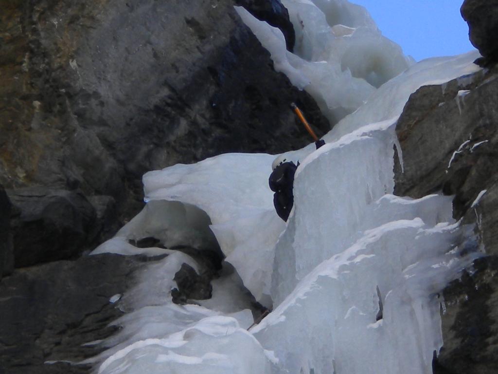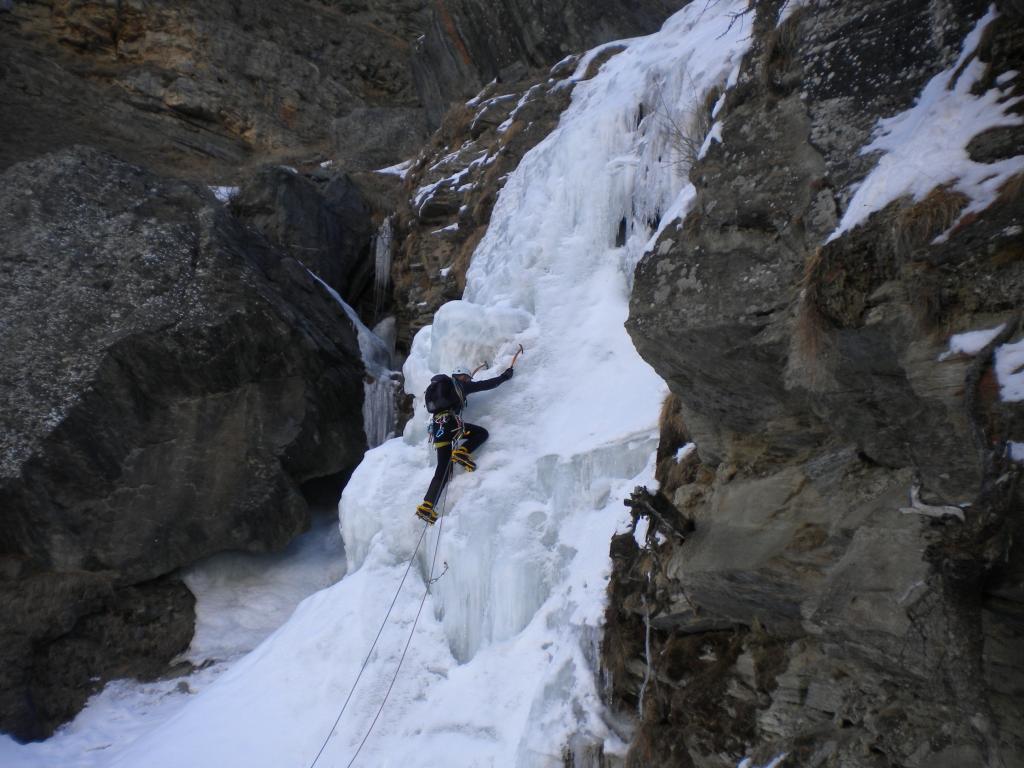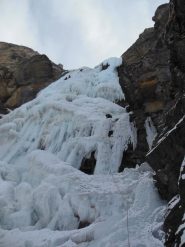 Primo tiro sulla barra rocciosa che sovrasta il sentiero n.5, 30 m (passi a 85° ghiaccio sottile) poi continuare nal canale (60 m sosta a dx su larice).