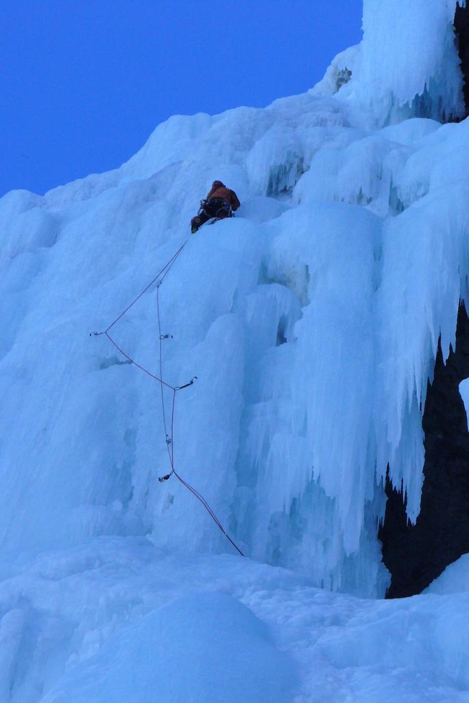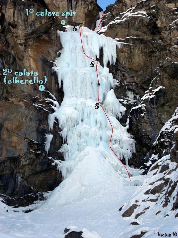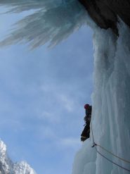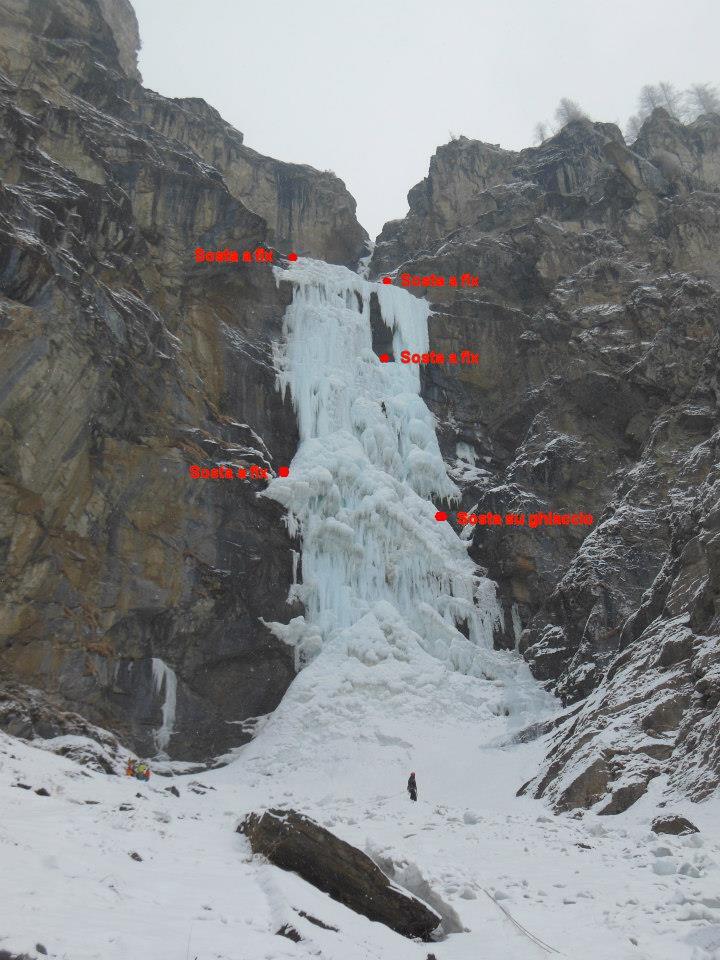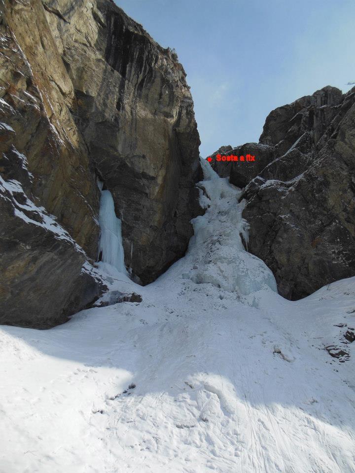 Continuare nel canale fino al muro centrale: secondo tiro in obliquo da dx vs sx poi dritti su medus o per un colonnino a dx. Sosta in una nicchia tra ghiaccio e roccia (30 m passi a 85°)Alzarsi verso sx o diritti tra stallattiti (passi a 90-95°) con più muri molto fisici, fino ad una rientranza sulla dx (nicchia coperta dal ghiaccio) sosta su spit (35m).