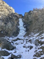 Un ultimo saltino verticale di 10 m porta ad una conchetta (sosta a spit a dx contro le rocce). Salire il canalino nevoso poi la bellissima goulotte (50 m da 70 a 80°)fino ad una sosta a spit a dx su roccia. Da qui calarsi x 40m fino a sosta intermedia faccia amonte a sx alla base del salto di ghiaccio. Breve dopppia 30m fino al bordo del salto, doppia 50m rettilinea fino a sosta a spit in una grotta. Poi doppia fino a terra. Da qui costeggiare le rocce a sinistra scendendo, aggirare lo sperone e scendere nel bosco a piedi. (le soste sono state riattrezzate a dicembre 2010 da Enrico Bonino e Marcello Bevilacqua. Alternativa, dalla cima dell’ultimo salto continuare lungamente nel canale (dopo 70 m sosta a cordoni vecchi sulla dx) per circa 300 m (tirando a sx e fino a circa 2200m) per reperire una costola a sx su cui sorge una piccola costruzione dell’acquedotto e più in basso una bella baita (la Boconnere 2100 m).
