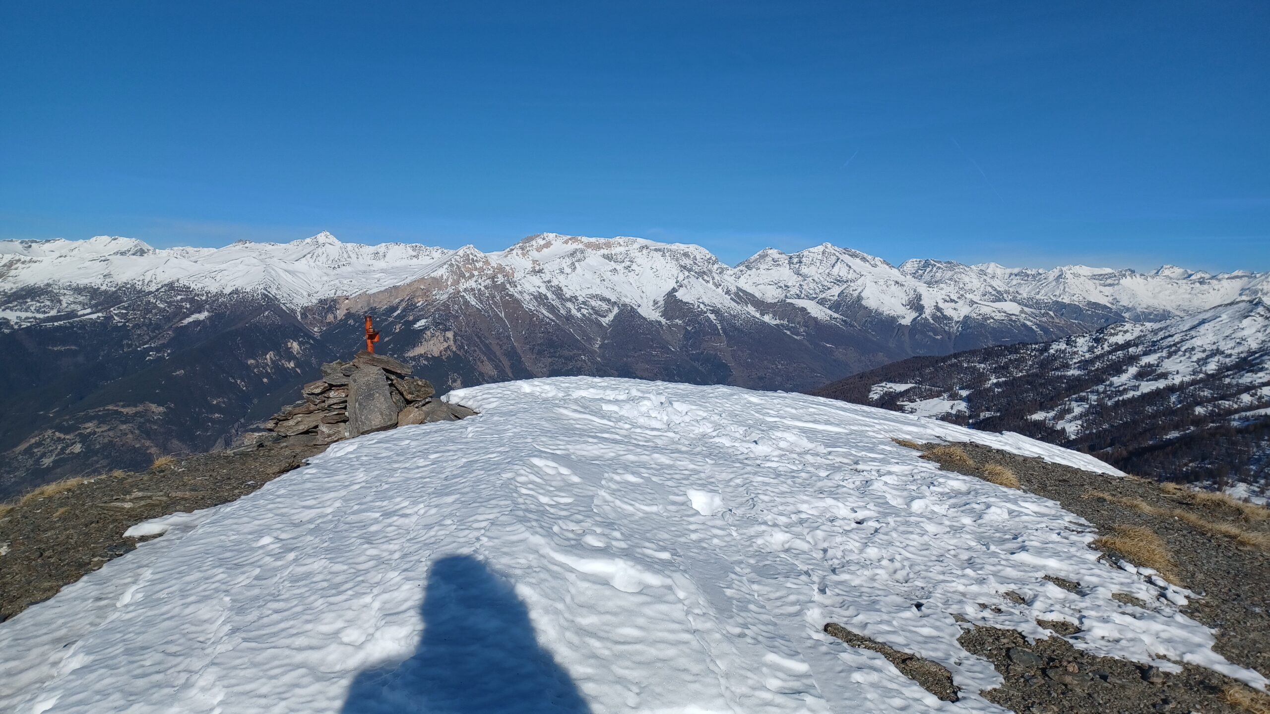 Discesa diretta dal pendio sud su neve portante ancora un pò duretta a causa del vento, comunque non male.
