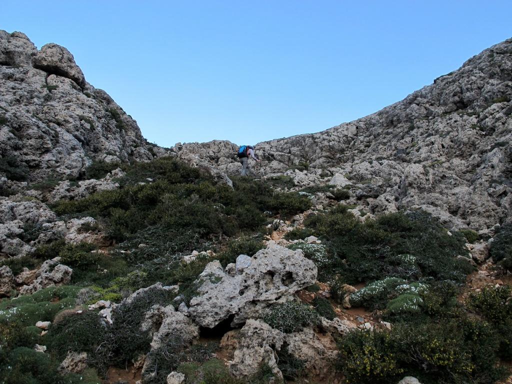 La discesa avviene camminando verso Sud-Est, sui pendii meridionali della montagna al di qua dei grandi salti sopra la Gola di Elighia, obliquando fino a circa quota 2000, prima di raggiungere un grande canale e proprio sulla verticale della sella su cui transita il sentiero che dal mitato Potamou va ad Aghios Ioannis. Con cautela, ci si abbassa su terreno ripido fra rocce, sassi instabili e cespugli spinosi, tornando finalmente in piano 300 metri più sotto. In direzione Sud-Est si seguono le tracce di sentiero (ometti, occasionali tacche di vernice rossa), all’inizio confuse, che attraversano una valletta e portano a Kroussia (quota 1210).