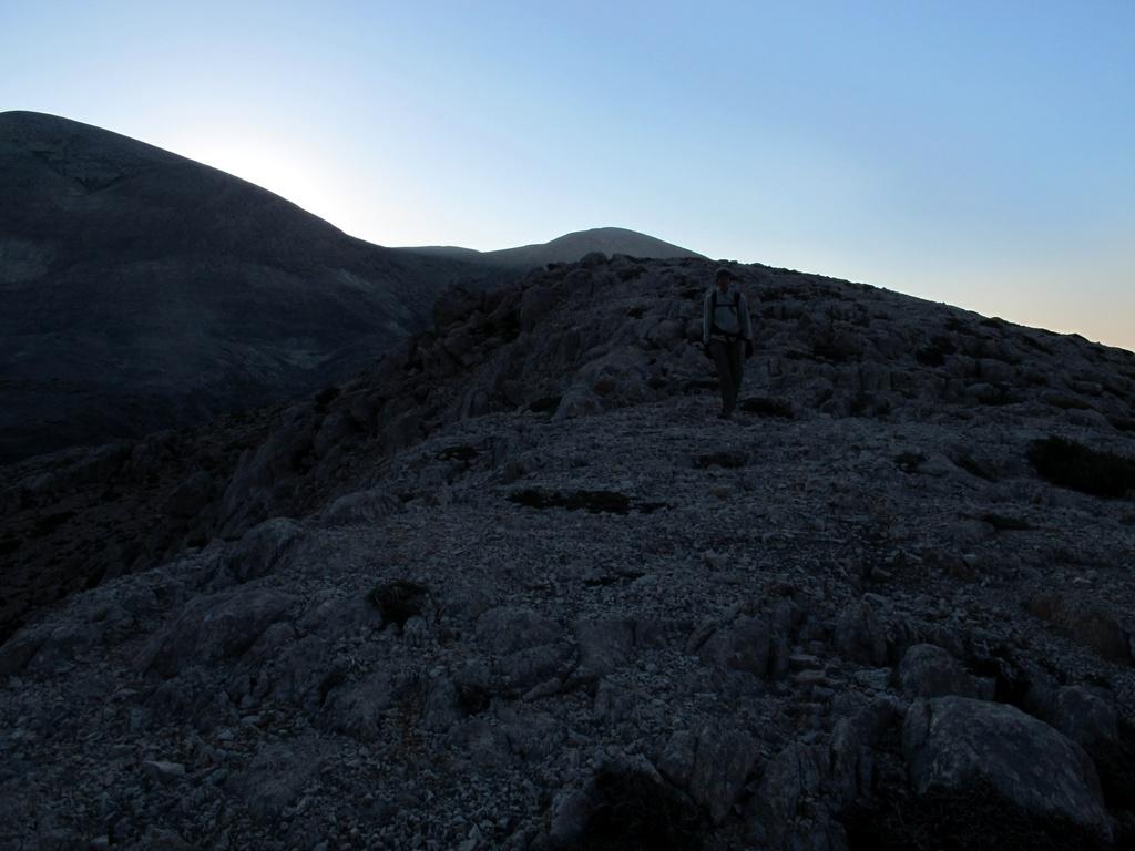 Si torna ora sui propri passi per tagliare i pendii occidentali della montagna e dirigersi verso la crestina rocciosa che porta alla base dei Mesokefales (letteralmente “teste di mezzo”). Si scende lungo la cresta e si risale, transitando accanto ad una caratteristica formazione rocciosa e aggirando successivamente a destra una delle teste. Con breve salita si perviene così alla sommità settentrionale (non quotata, circa 2145 m).