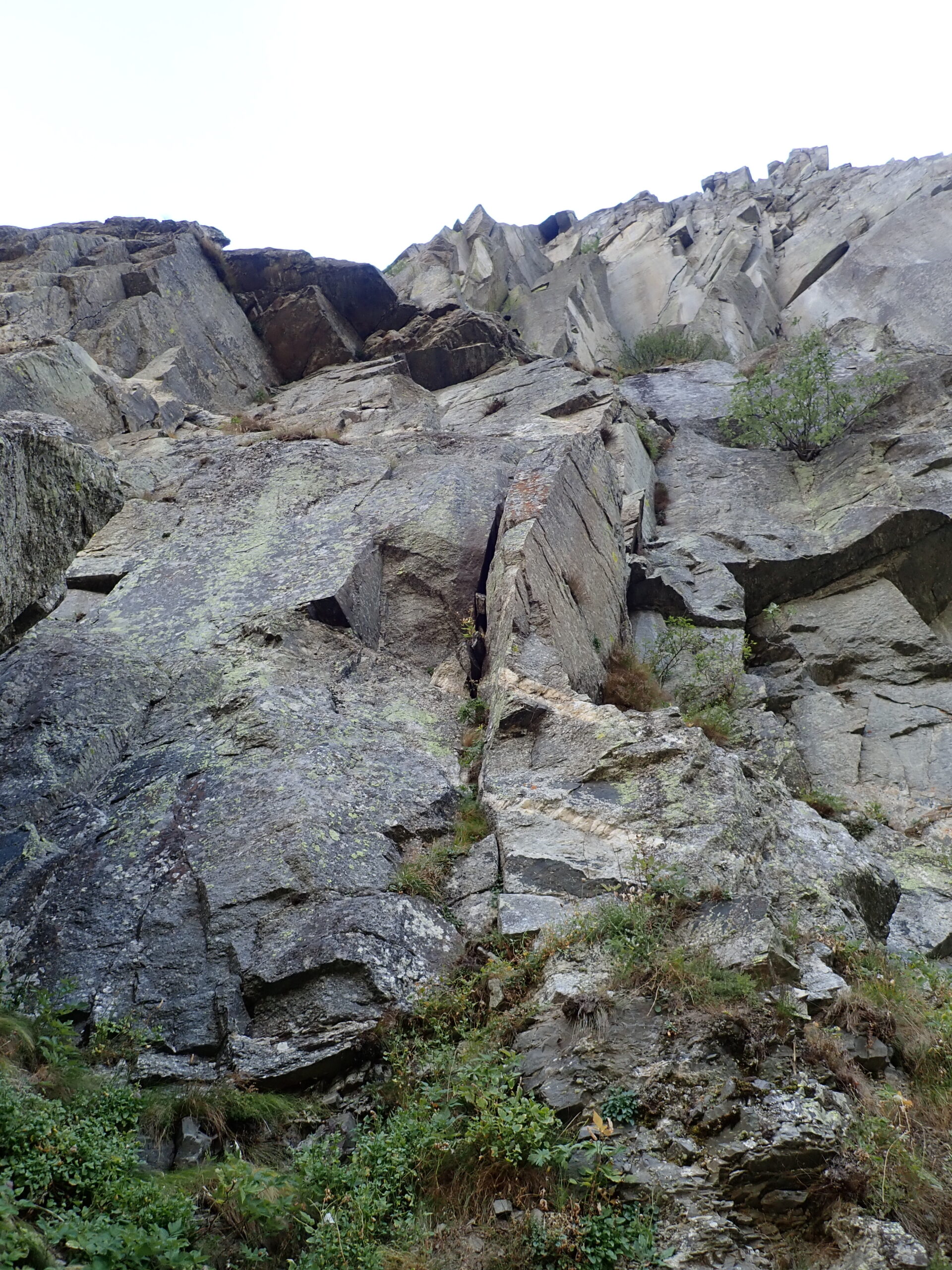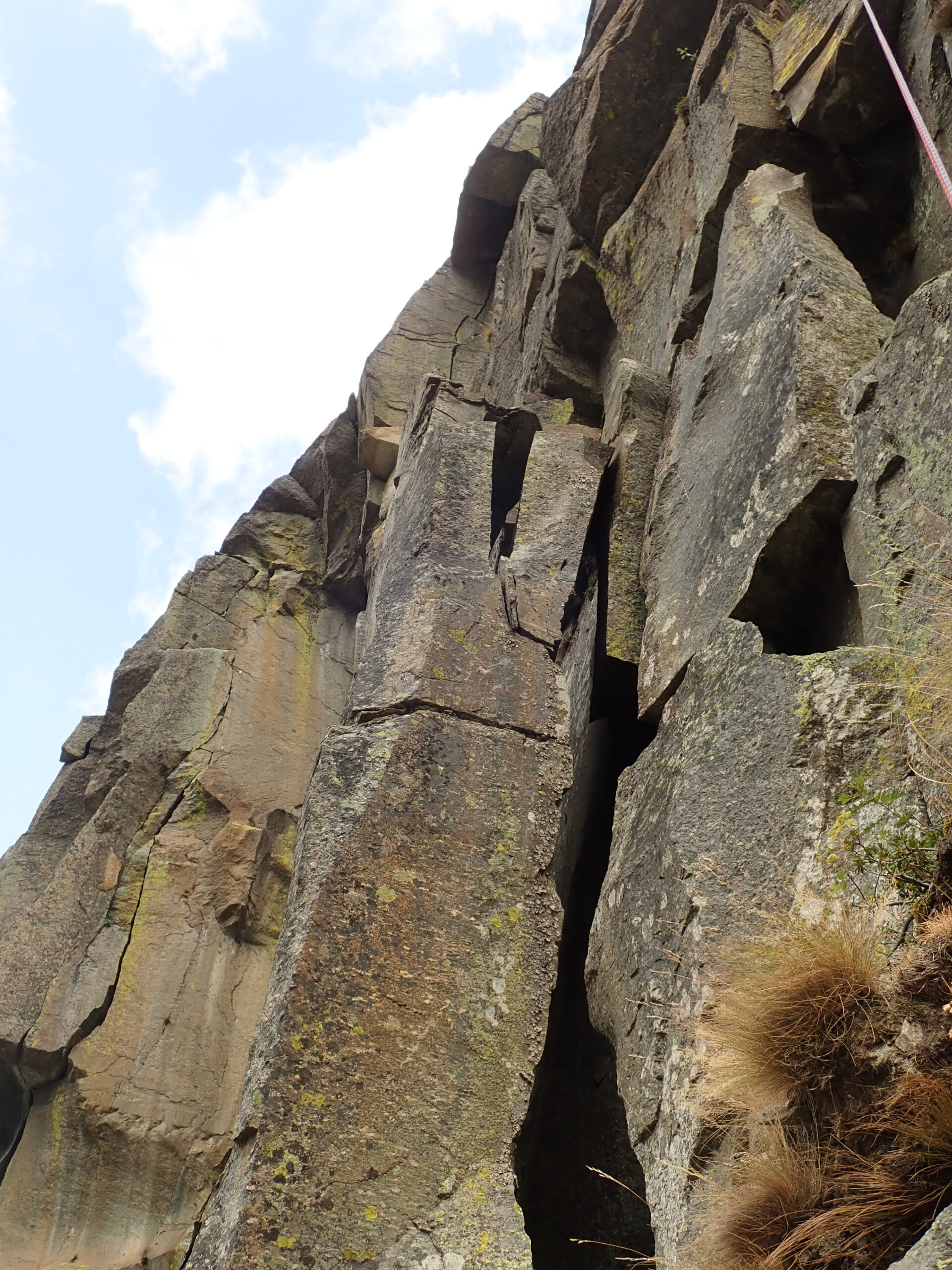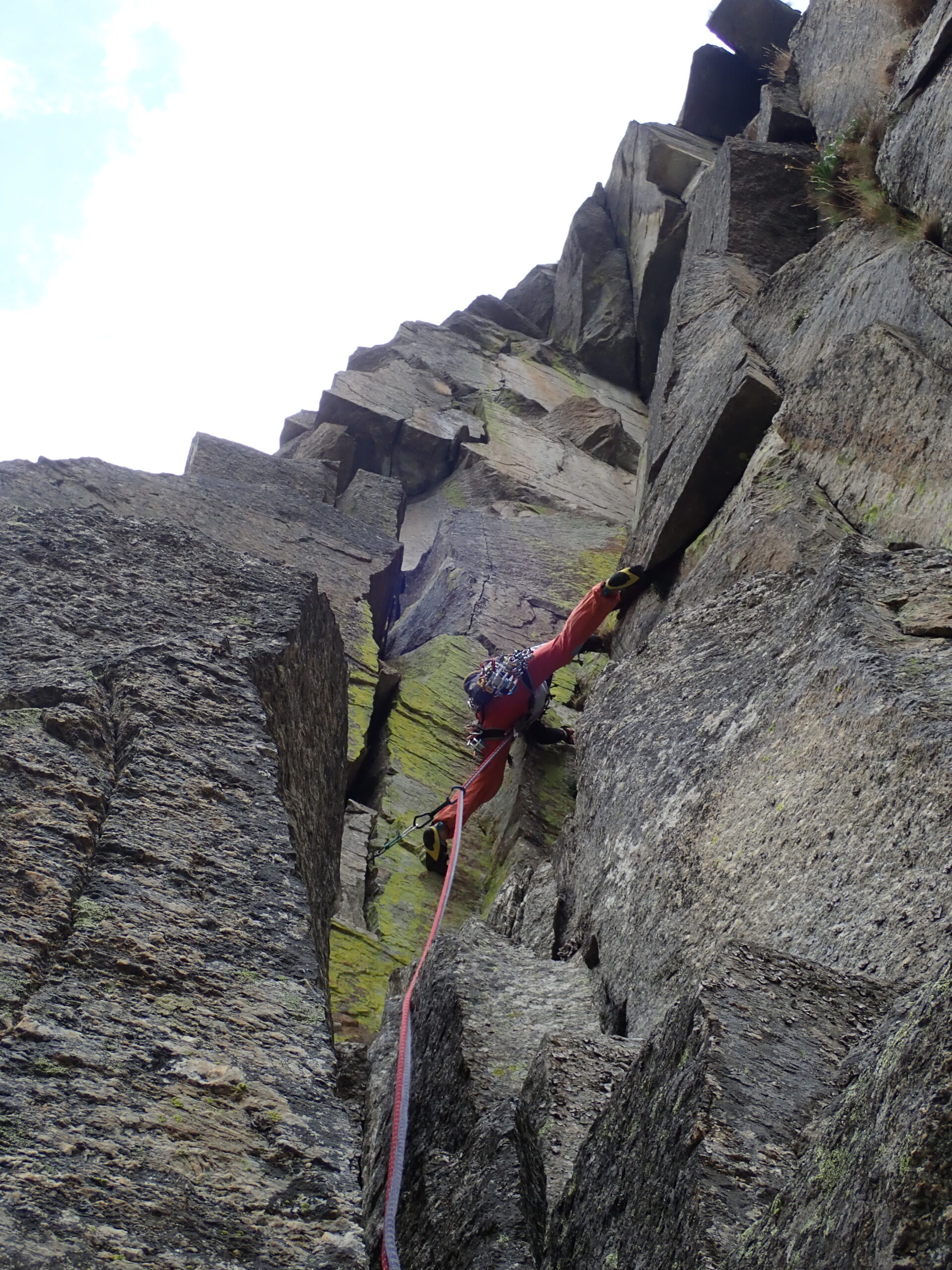 2° tiro) Tralasciare il primo diedro sopra la sosta caratterizzato da belle ed evidenti fessure (qui passa “Urlo del Silenzio”) ma salire un tratto erboso verso il diedro di dx. Non entrare subito nel fondo del diedro ma salire sulla scaglia a dx, superarla e spostarsi ora verso il fondo del diedro, fino al grande cuneo roccioso che lo biforca. Prendere il ramo sx, salire una magnifica fessura ad incastro di dita e ribaltarsi su un comodo gradone roccioso. 6A+. Sosta su un fix da integrare con un friend.