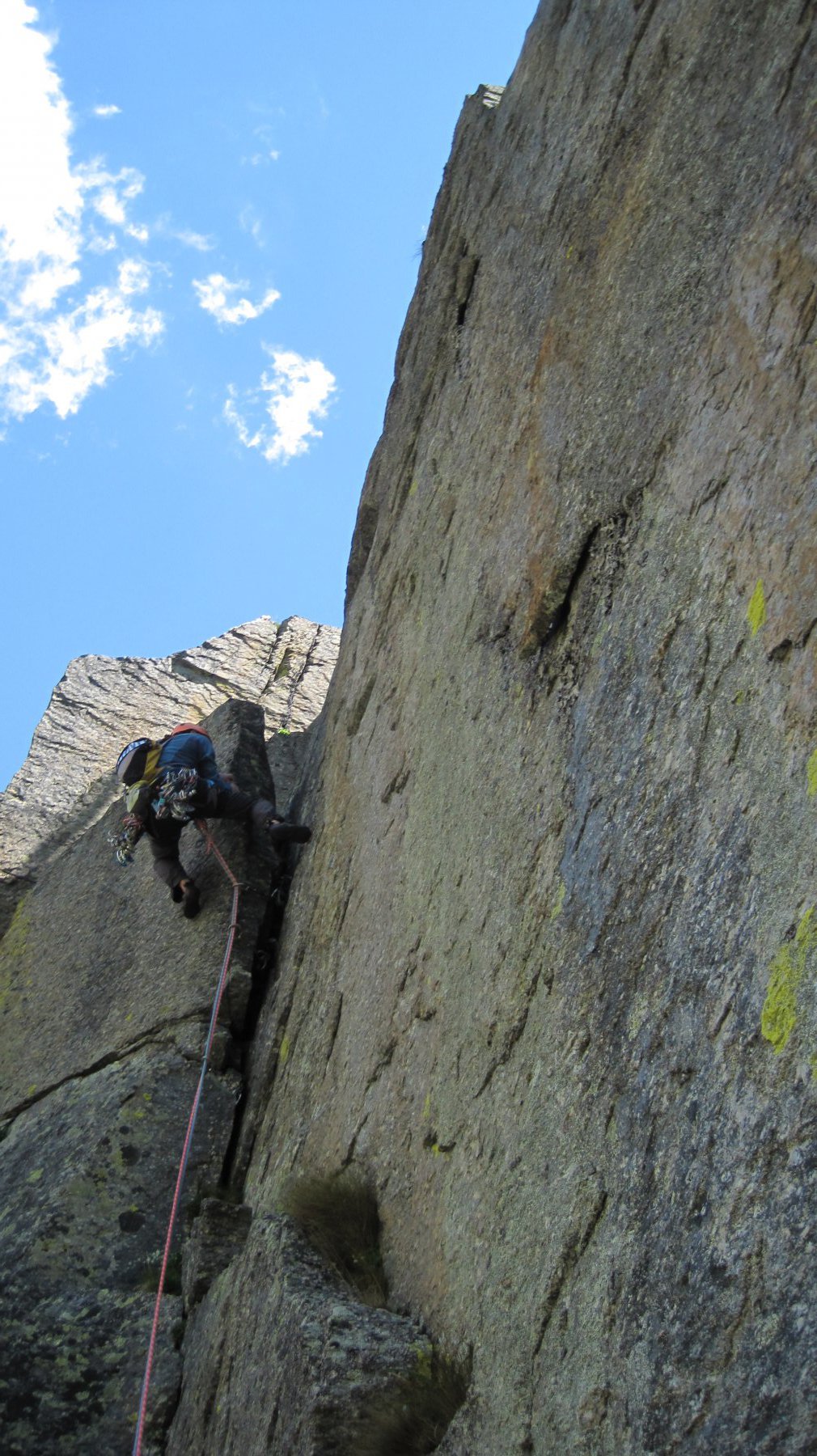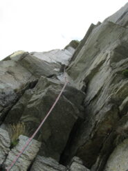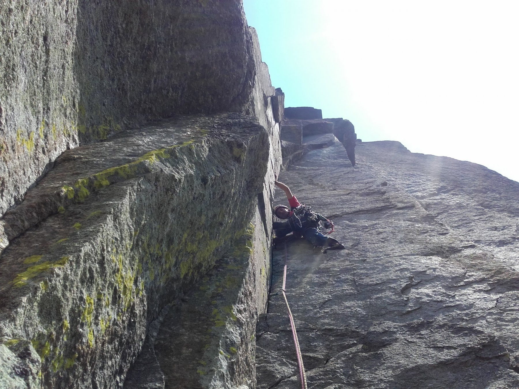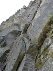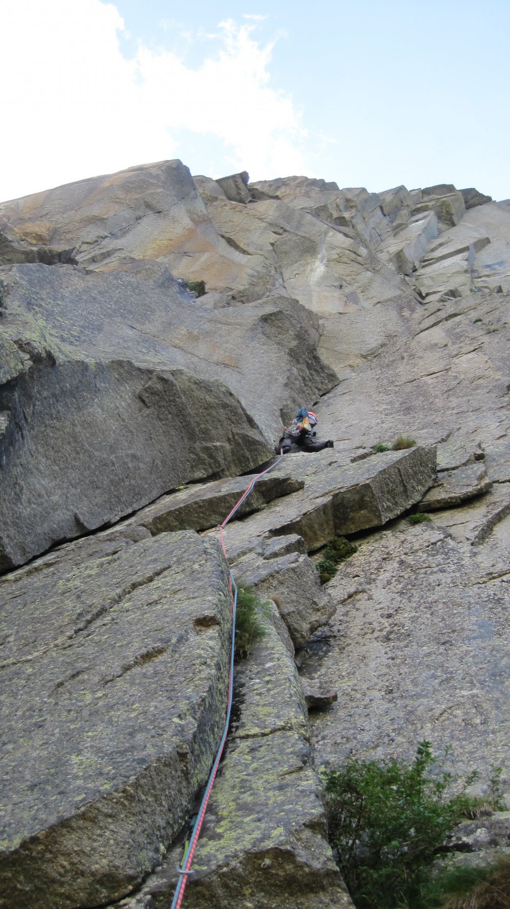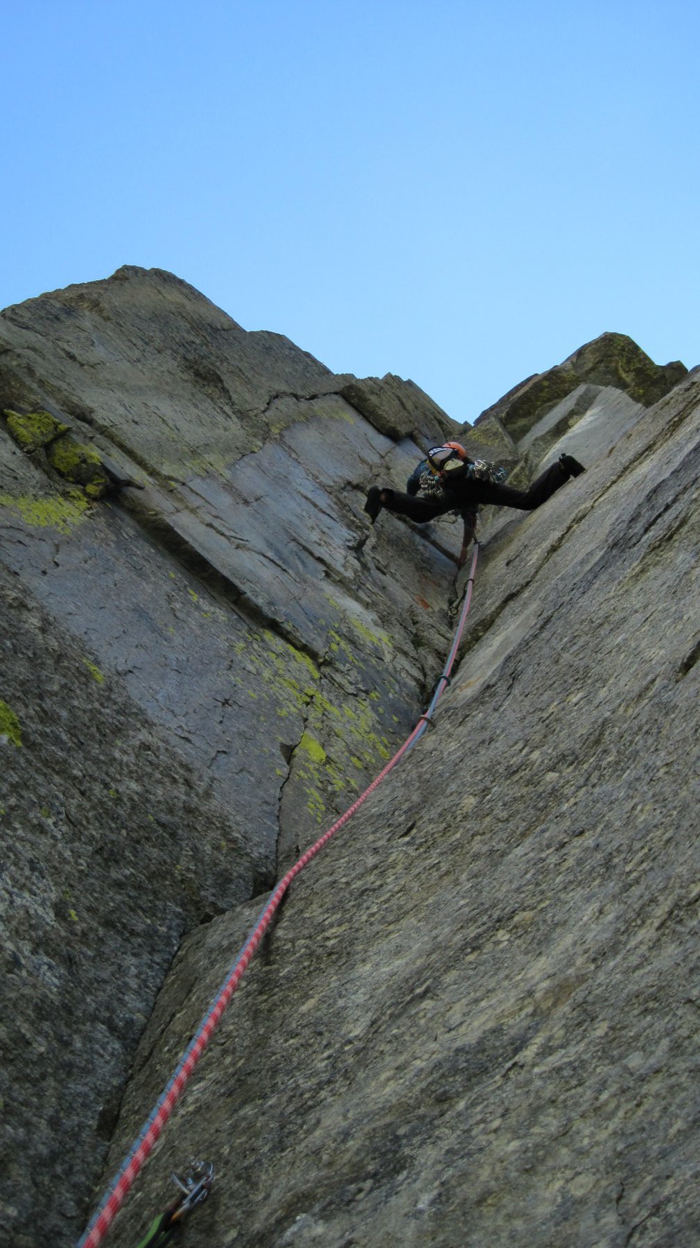 1° tiro) Superare l’atletica fessura, giunti in placca traversare a sx alla base dell’evidente diedro. 6A. Sosta con 2 fix.