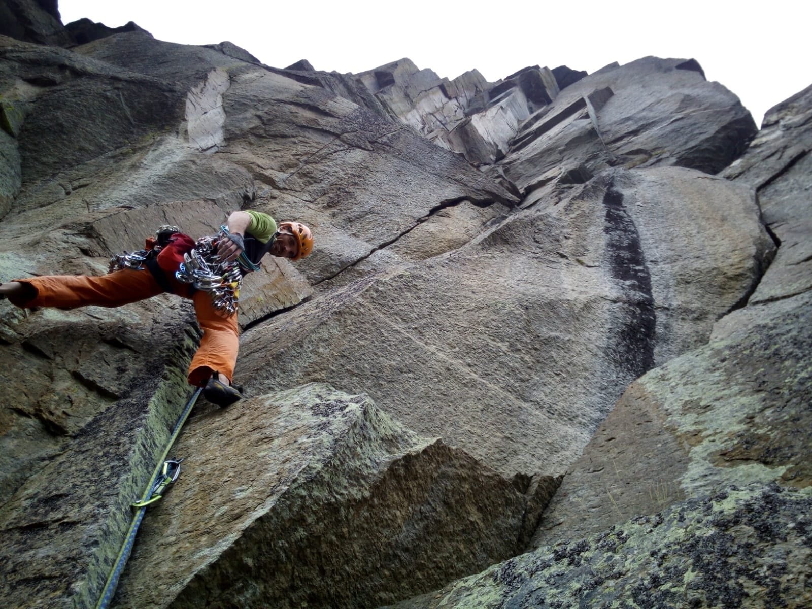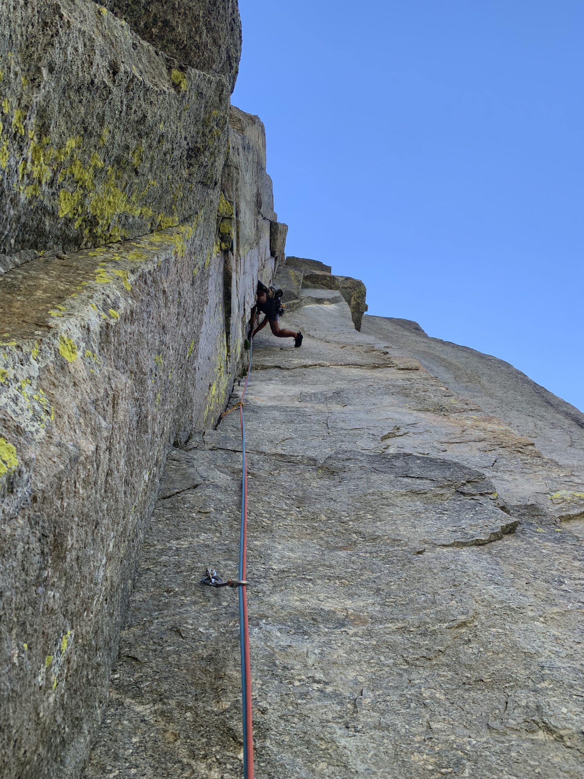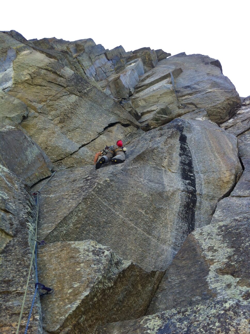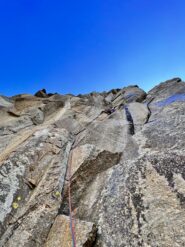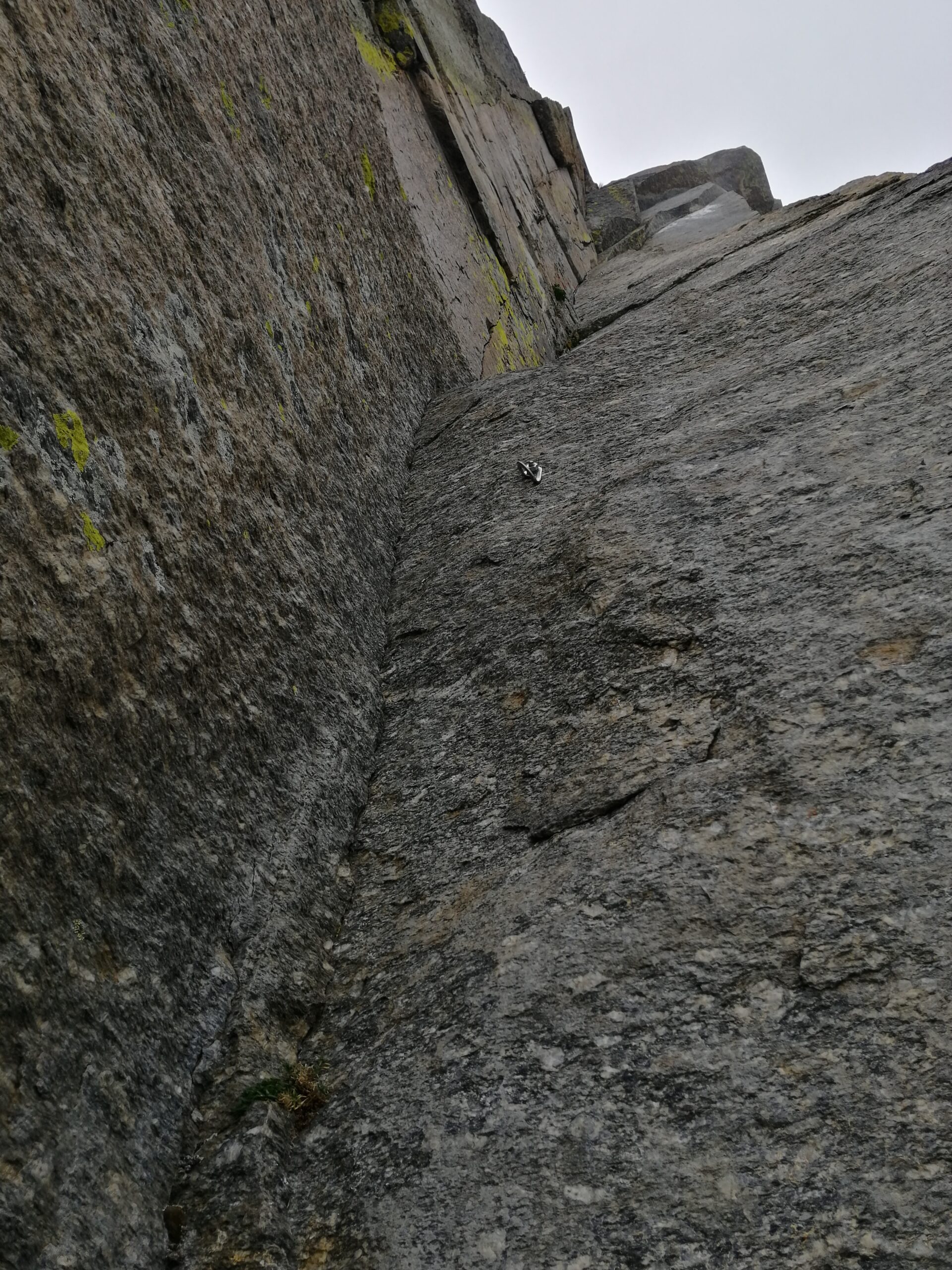 1° tiro) Superare l’atletica fessura, giunti in placca traversare a sx alla base dell’evidente diedro. 6A. Sosta con 2 fix.
