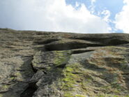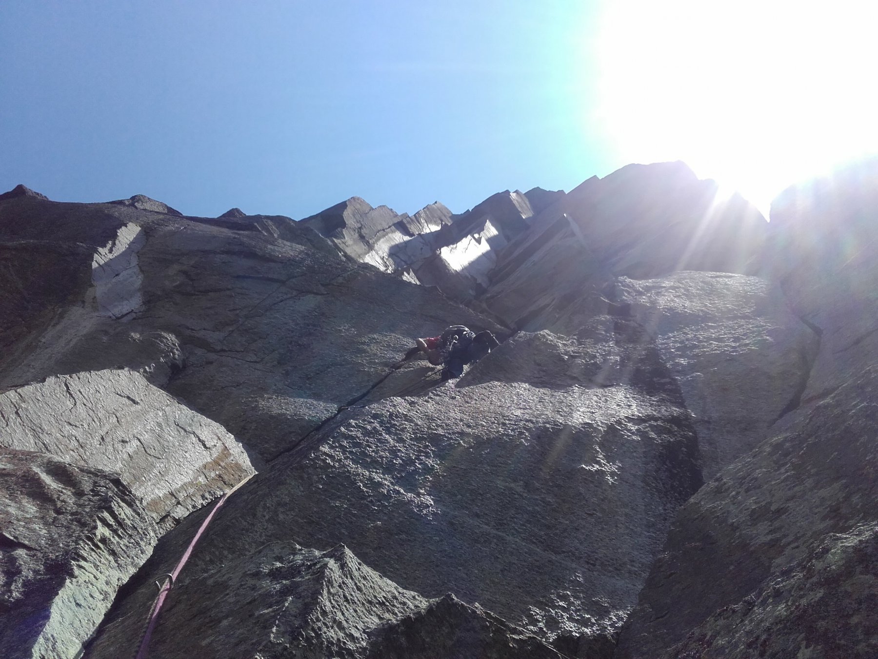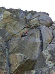 4° tiro) Superare il diedro (6B poi 6A) fin sotto a una prima fascia di tettini, traversare allora a sx (alcuni fix) (in questo punto probabilmente la via originale proseguiva nel diedro principale, dall’aspetto molto liscio e poco scalabile) afferrando una fessura parallela, ribaltarsi su dei difficili gradoni fino in sosta. 6C? da confermare. 5 fix. Sosta con 2 fix.