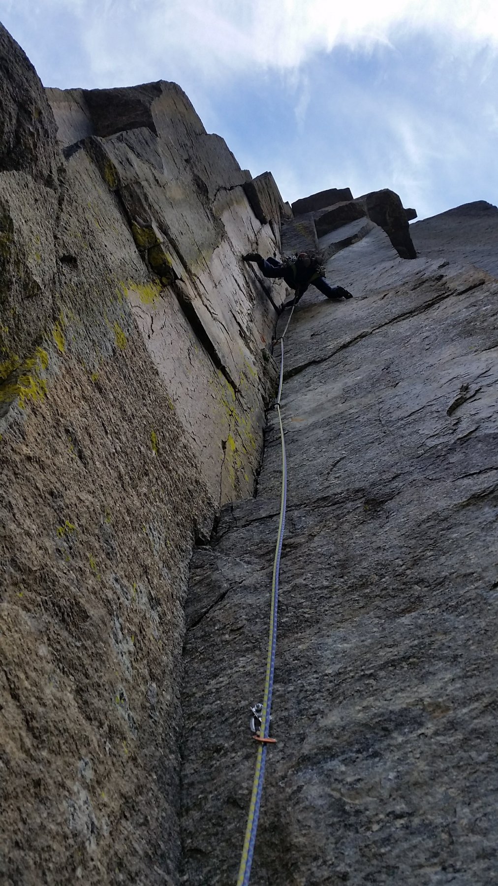 Un vero vione, spettacolare, supera tutto il trono con arrampicata sempre interessante, prevalentemente in fessura. Via impegnativa che merita di diventare una grande classica. Tutte le soste sono ora con 2 fix inox (non collegati), qualche fix è stato piazzato in via, soprattutto sul diedro, un tempo con difficoltà massima di A2. Probabilmente nella versione 2017 abbiamo fatto una variante uscendo nelle fessure di sx, variante però che dovrebbe permette la completa scalata in libera della via.