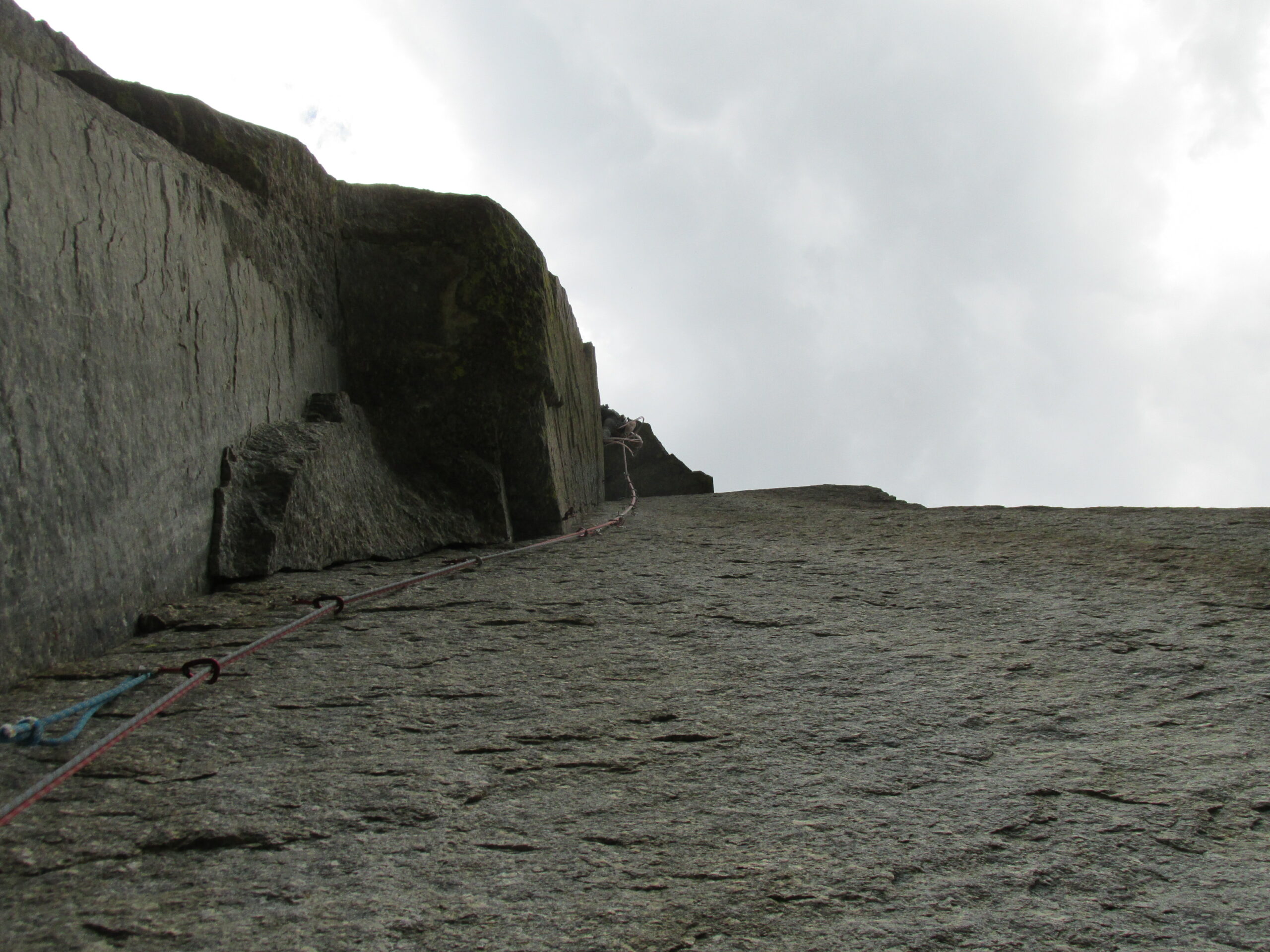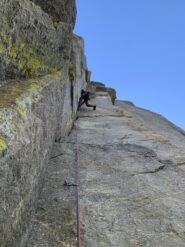 2° tiro) Salire integralmente il lungo diedro (1 fix in mezzo) fino a una comoda cengia. 6A/6A+. Sosta con 2 fix.