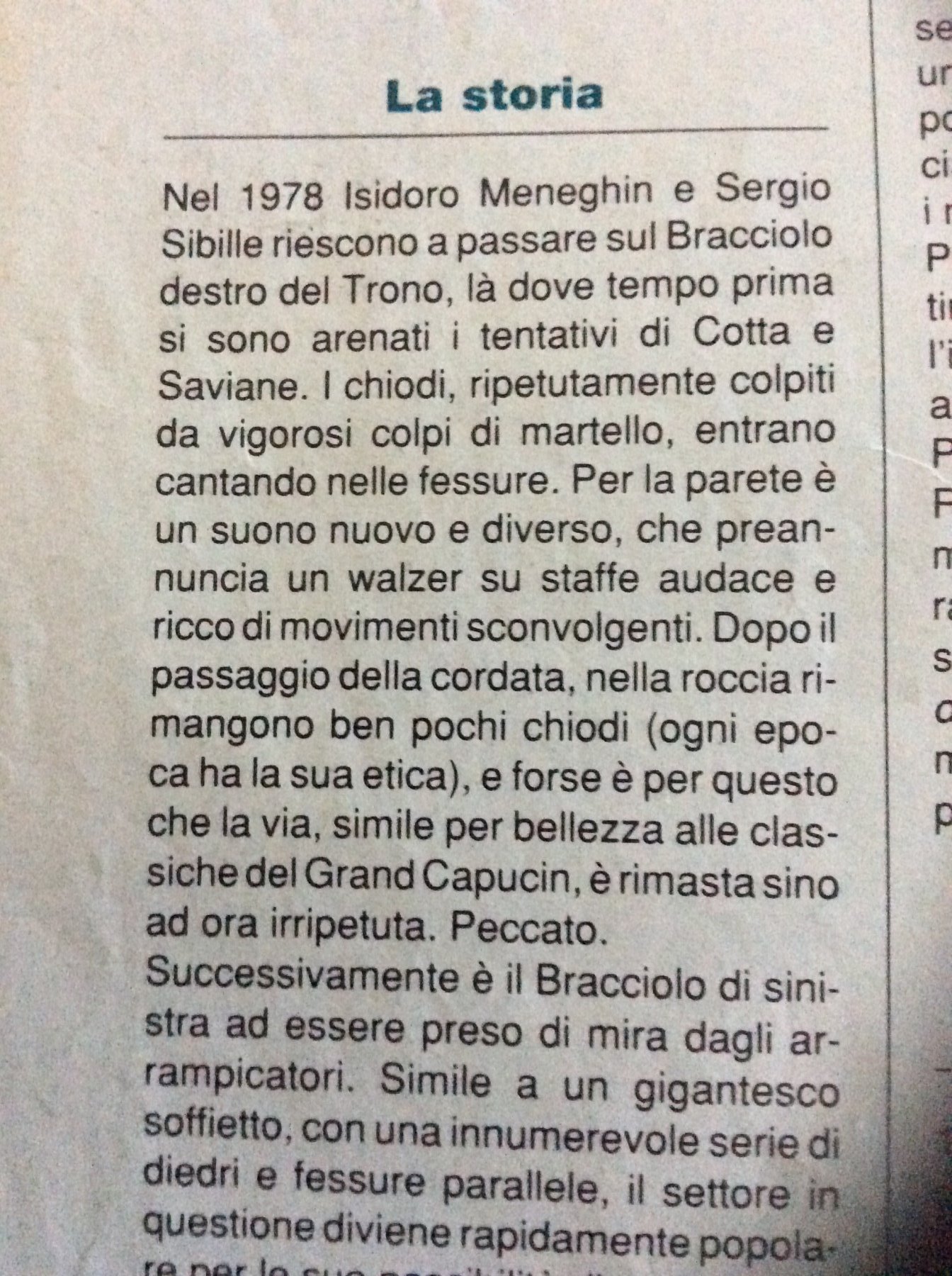 La roccia e’ di prima qualita’ ma vi sono ancora alcuni (pochi) tratti che richiedono attenzione, in particolare l’uscita del terzo tiro e la lastra verticale quando si esce dal diedro del quarto tiro (fix che evita di dovervi piazzare il friend) e ancora qualcosa da rimuovere sempre su quarto tiro.